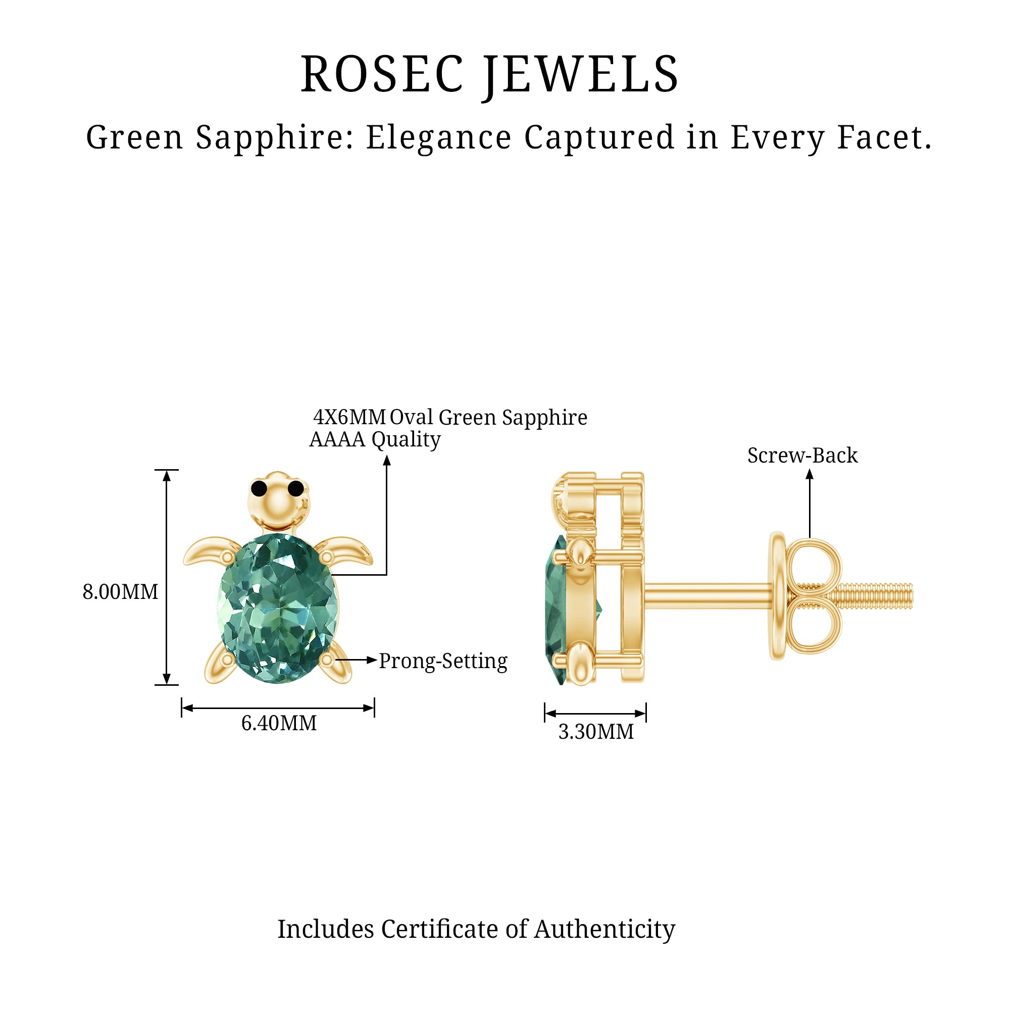 Add a symbol of longevity and wisdom to your collection that will add a touch of whimsy to your everyday look. The 4X6 MM oval shape vibrant green sapphires, grown in a sustainable lab environment, are shaped into delicate turtle studs. Turtles have long been associated with longevity, wisdom, and good luck. Wearing these earrings is a way to invite these positive energies into your life, reminding yourself to live slowly and savor each moment. The earrings are perfect for women of all ages and styles.