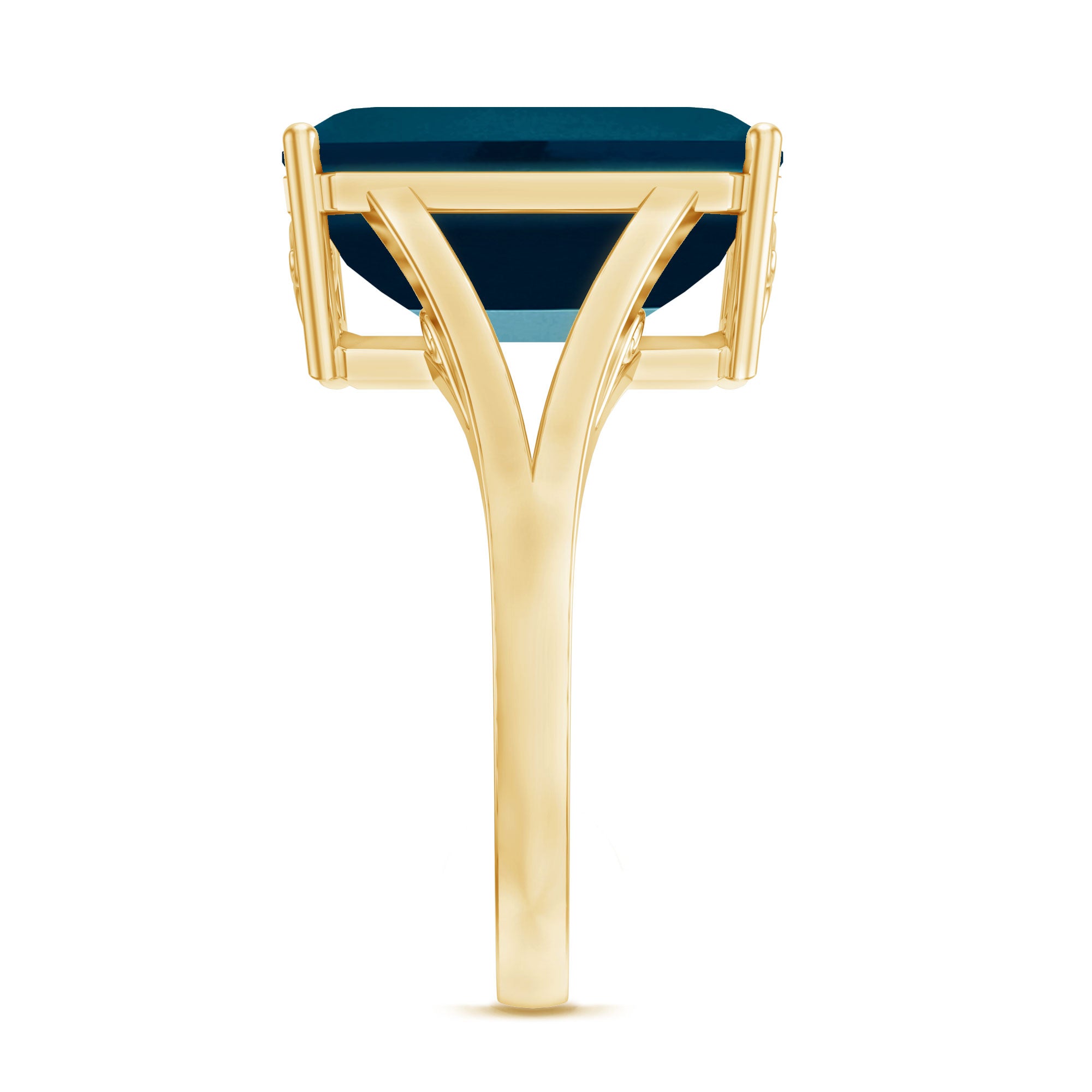 Capture attention and win hearts with this stunning London Blue Topaz Engagement Ring, a true showstopper. Made from Yellow Gold Plated Silver, this Solitaire Engagement Ring features a 10X14 MM Emerald Cut Lab Grown London Blue Topaz set in Basket Setting, complete with a Split Shank design. It beautifully directs focus to the center stone, amplifying the rings overall shine. With its classic design that showcases antique elegance, it perfectly complements modern aesthetics. This Vintage Style Engagement Ring introduces a splash of color and sophistication that distinguishes itself from traditional styles. It is a lovely way to honor your love story and begin a shared adventure. This Split Shank Ring serves as a cherished reminder of your love story, symbolizing extraordinary brilliance and unique rarity. Its distinctive and enchanting beauty carries a contemporary flair and mesmerizing hue, adding sparkle for the woman who wants to feel strong, fierce, and beautiful.