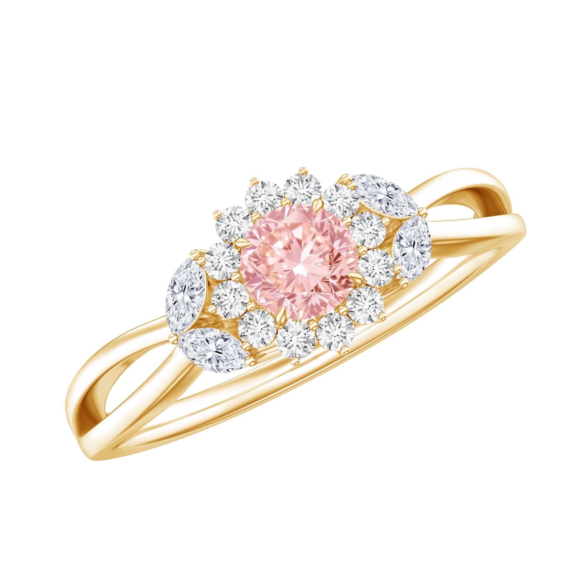 This Flower Engagement Ring is a stunning piece that shines with both romance and brilliance. At its center is a 6.50 MM round cut lab grown pink diamond, beautifully set in claw setting, radiating fire and sparkle, making it the perfect focal point for such an important item. Surrounding the main stone is halo, adorned with smaller round and marquise cut lab grown diamonds. The design captures the essence of natural beauty, resembling a flower in full bloom, timeless, fresh, and vibrant. The split shank provides a flowing design that feels both modern and classic. The split band style adds a unique twist, symbolizing two paths coming together as one, making it ideal for celebrating your love story. Whether you are proposing, marking an anniversary, or treating yourself to something special, this Pink Diamond Engagement Ring offers an elegant yet playful look that suits any memorable occasion. Made with care and comfort in mind, the Nature Inspired Ring is crafted for everyday wear while still making a bold statement. The pink gemstone at the center brings classic sparkle, while the floral halo and split band add a contemporary, feminine flair. It is a piece that represents the joy and uniqueness of the love it symbolizes, bright, beautiful, and forever blooming.