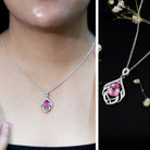 Turn heads with the stunning details of this Designer Wedding Necklace, featuring a dazzling 8X10 MM pear shaped Lab Created Pink Sapphire as its centerpiece. Handcrafted with care in 14K white gold plated silver, this Wedding Drop Necklace radiates elegance and grace, perfect for those who adore feminine touches with a bit of sparkle. The 8X10 MM pear cut lab grown pink sapphire is beautifully set in prong setting, while the brilliant round cut lab grown diamonds, delicately arranged to create a glowing teardrop outline. The gentle curves and open design lend a graceful flow to the piece, making it feel light and luxurious at the same time. Adding even more charm, the bail is detailed with lab created diamonds, seamlessly tying the whole design together. Whether you are dressing up for a special occasion or simply love jewelry that makes you feel confident and beautiful, this Pink Sapphire Teardrop Necklace brings a touch of timeless elegance to any look. Finished with a delicate chain, it arrives ready to wear or gift, beautifully presented in a premium box. This piece celebrates both beauty and craftsmanship, with AAAA quality Lab Created Pink Sapphire and EF-VS quality Lab Grown Diamonds, offering stunning sparkle in an ethical and affordable way.