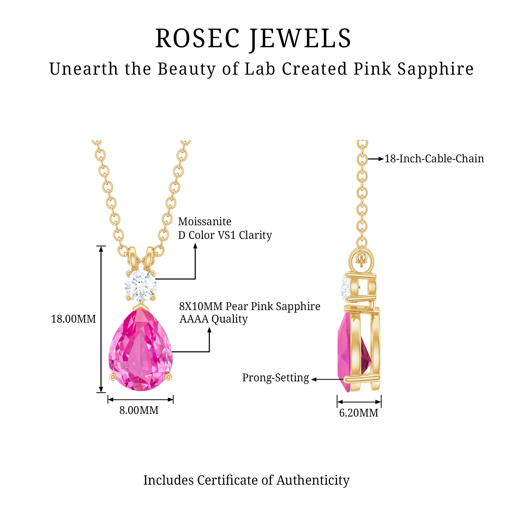 This Lab Grown Pink Sapphire Bridal Pendant exudes a bright hue and effortless elegance making it a versatile jewelry for occasional wear. It features a Pear Shape Lab Created Pink Sapphire securely placed in Prong Setting and adorned with a Round Shape Moissanite. This pendant exudes a classic shine of D-VS1 Quality Moissanite which makes it a perfect piece to complete a look for the special day. This Teardrop Pendant Necklace is precisely crafted to adorn the neckline which can be an ideal gift for your special one. The pendant reflects sophistication, which makes it a cherished piece in your jewelry collection. The pendant will be delivered in a premium quality box for storage.