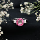This Pink Sapphire Engagement Ring beautifully represents the idea of past, present, and future in a relationship. Designed with care and attention to detail, it features a 10 MM cushion cut lab grown pink sapphire set in secure claw setting. On each side of the center stone sits a 4 MM princess cut moissanite, creating a classic trilogy look that adds romance and meaning to the design. The AAAA quality lab created pink sapphire shines with a bright and vibrant color, while the D-VS1 quality moissanites bring clear and sparkling brilliance. Together, these stones create a Three Stone Engagement Ring that feels both elegant and full of emotion. Timeless and versatile, this Lab Grown Sapphire Ring is a beautiful reminder of the bond you cherish. Its soft pink hue, meaningful design, and sparkling accents make it a perfect choice for anniversaries, special occasions, or simply expressing your love. With its classic style and lasting beauty, this Sapphire Cocktail Ring will remain a treasured piece for years to come.