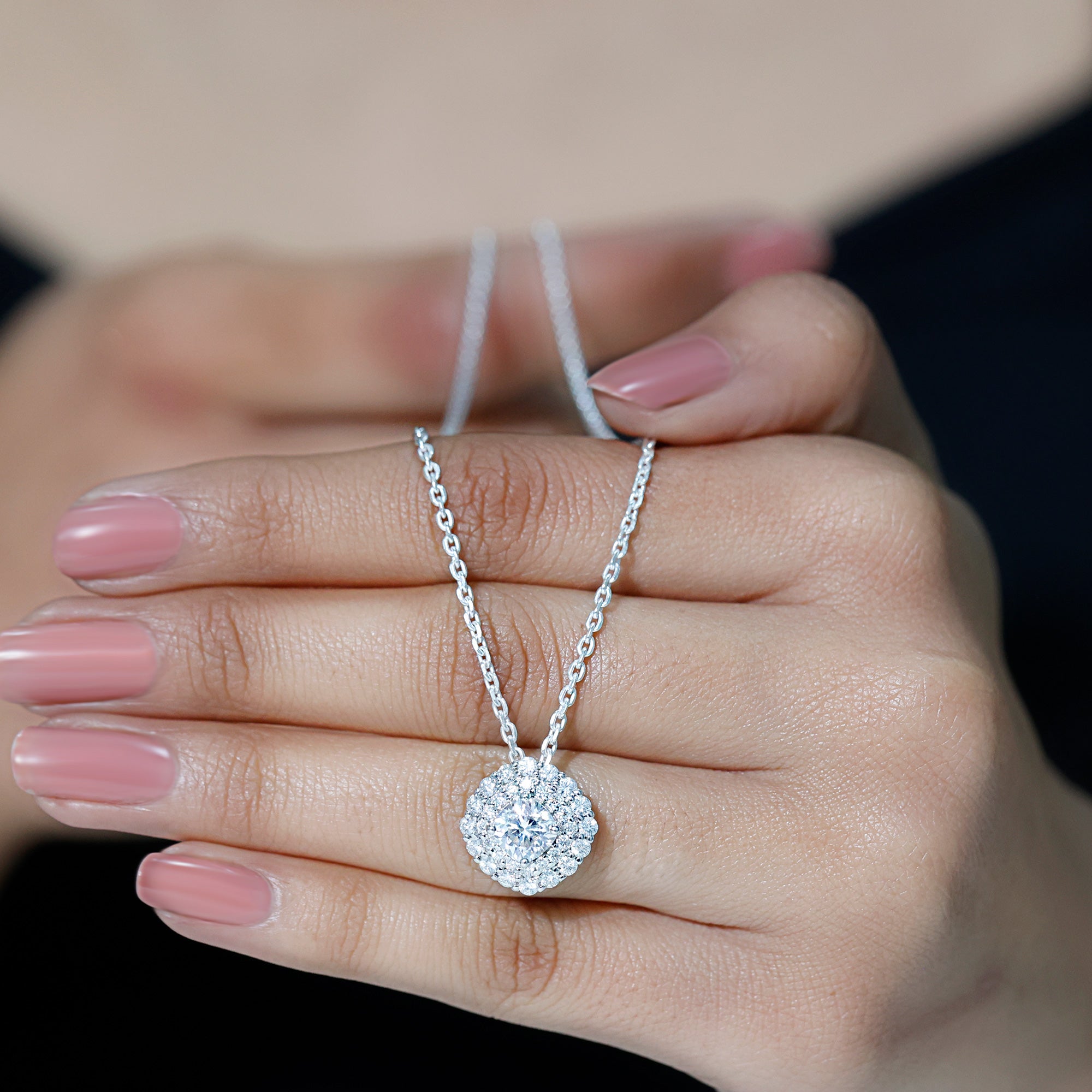 Express your love by gifting her this exquisite Lab Grown Diamond Pendant Necklace. This stunning piece showcases a 6 MM round shaped diamond of EF-VS Quality at its heart elevating its allure, surrounded by a double halo of smaller diamonds. It comes with a delicate cable chain so you can wear it the moment it reaches you, also the chain is adjustable and offers you a personalized length. Order this Round Diamond Pendant by Rosec Jewels, which specializes in crafting stunning jewelry pieces using certified lab-cultured gemstones. Present it to your girlfriend or wife and let this Halo Necklace speak volumes about your enduring affection. Get ready to shine like never before.