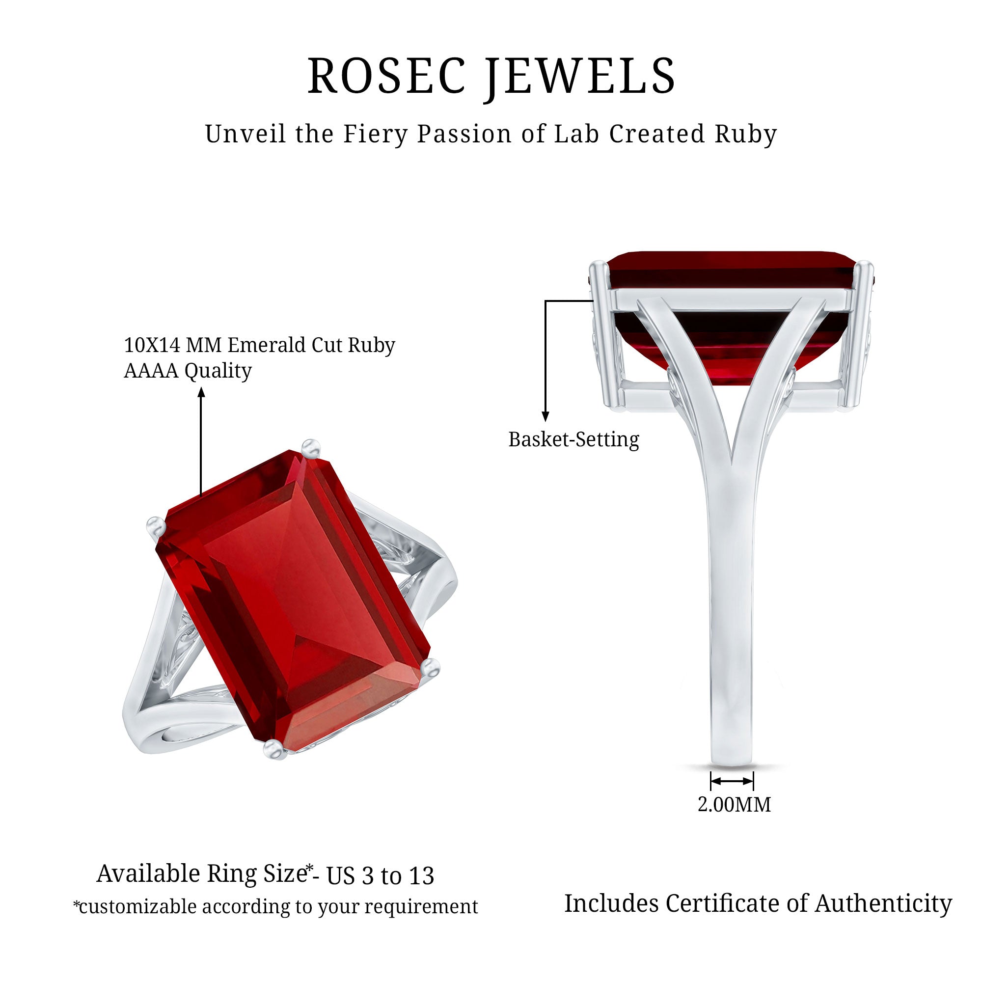 Rosec Jewels Lab Grown Ruby Ring is made to stand out - bold, bright, and full of love. With its deep red sparkle and classic design, this Solitaire Engagement Ring is the kind of jewelry that leaves a lasting impression. It is handcrafted in top notch metal with a 10X14 MM emerald cut lab created ruby placed beautifully in secure basket setting. The bold and big ruby catches the light from every angle, making sure all eyes are on it. It is further enhanced with a split shank band that adds a stylish charm to the design, giving it a modern yet elegant feel. Each part of this Emerald Cut Ruby Ring is curated to celebrate love that is strong, warm, and forever. Whether it is worn as an engagement ring or presented as a meaningful gift to someone who adores vintage inspired jewelry, this piece brings out the beauty in every moment. It comes with a certificate of authenticity for gemstones and is packaged in a premium quality signature jewelry box.