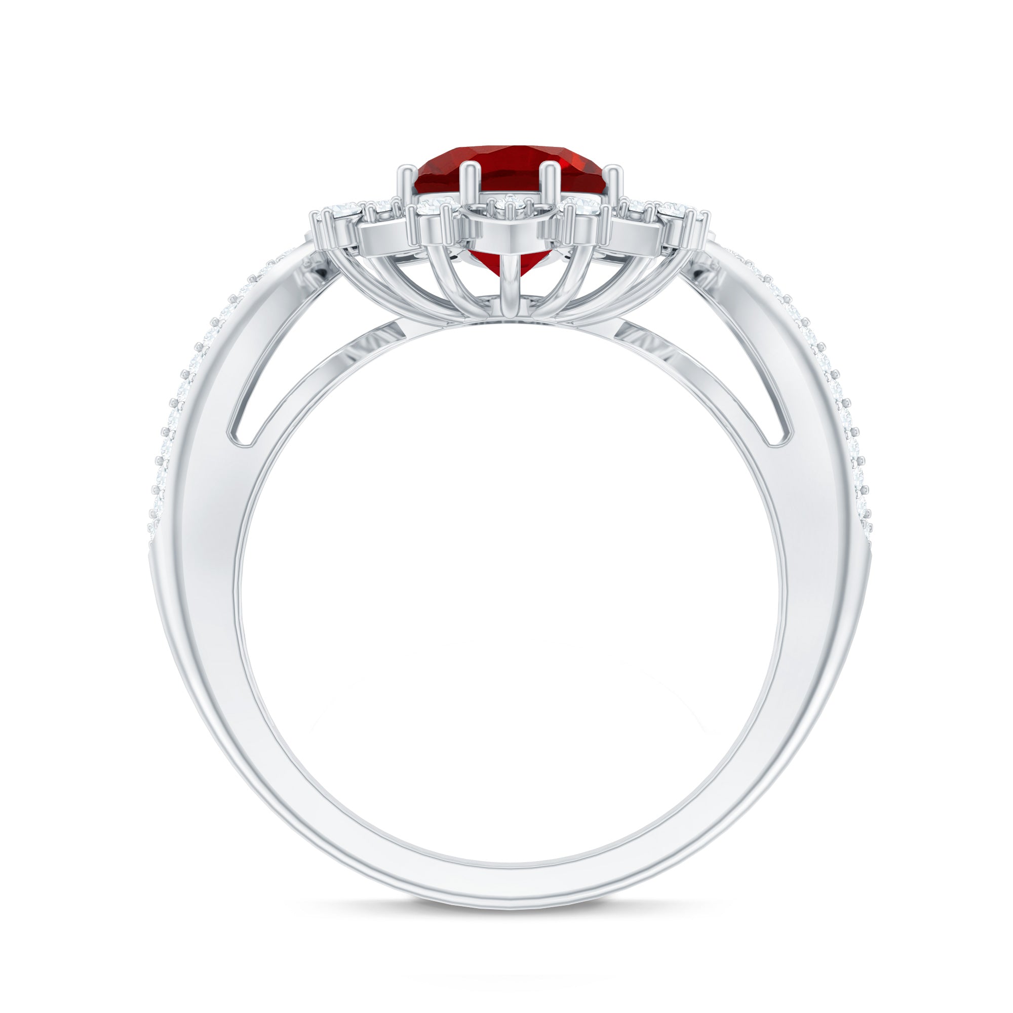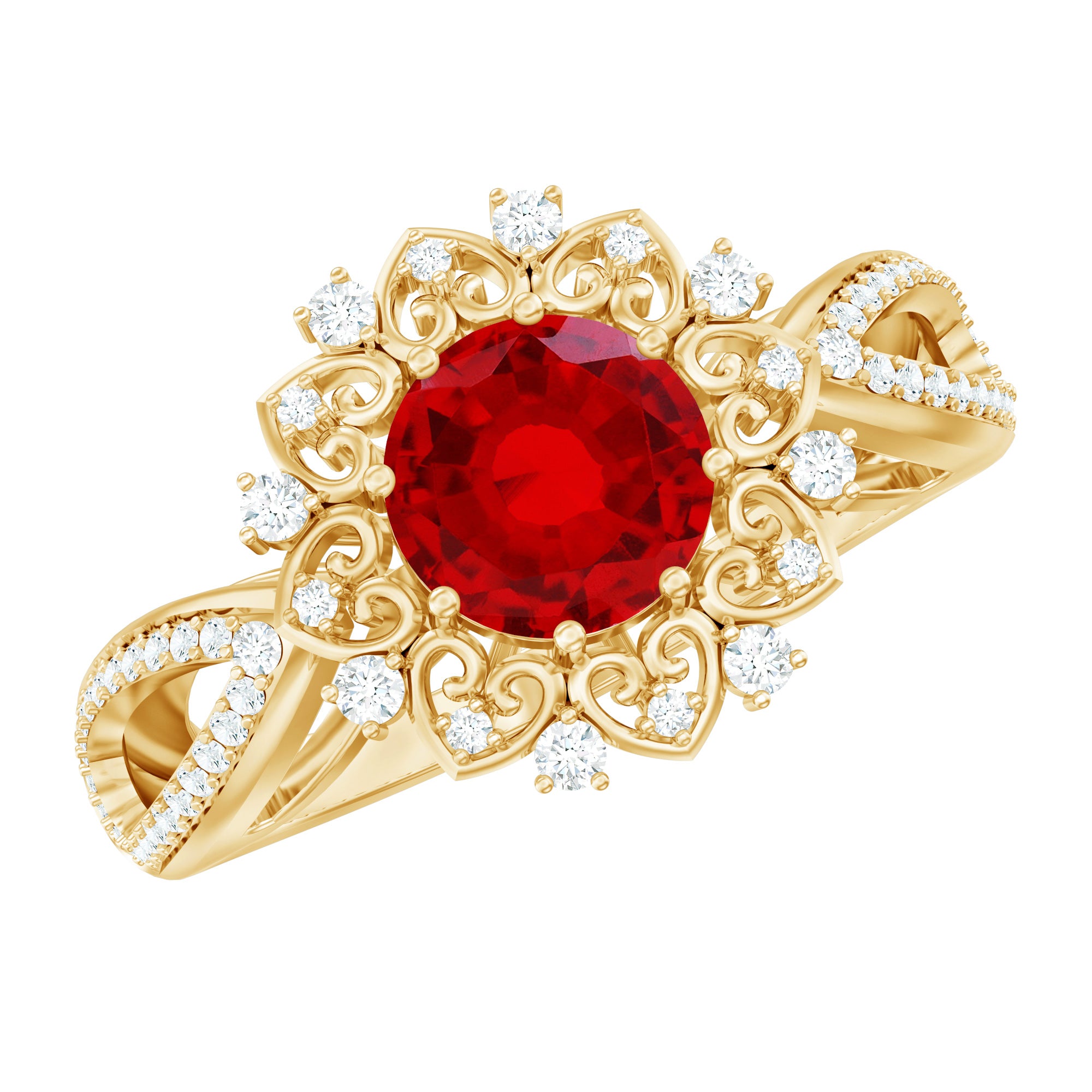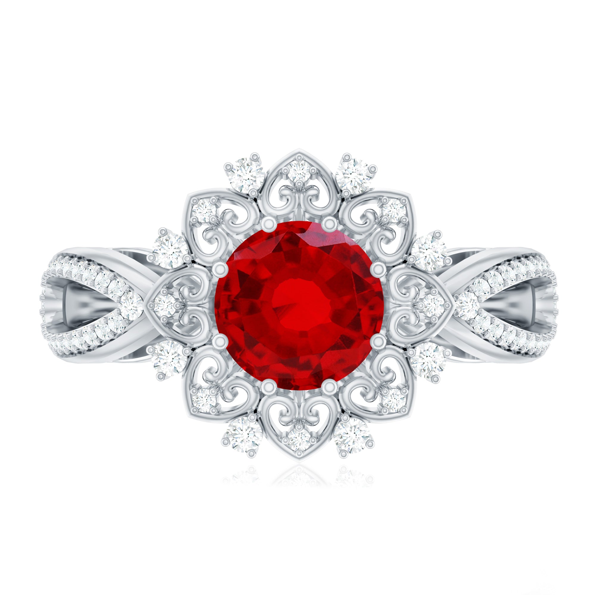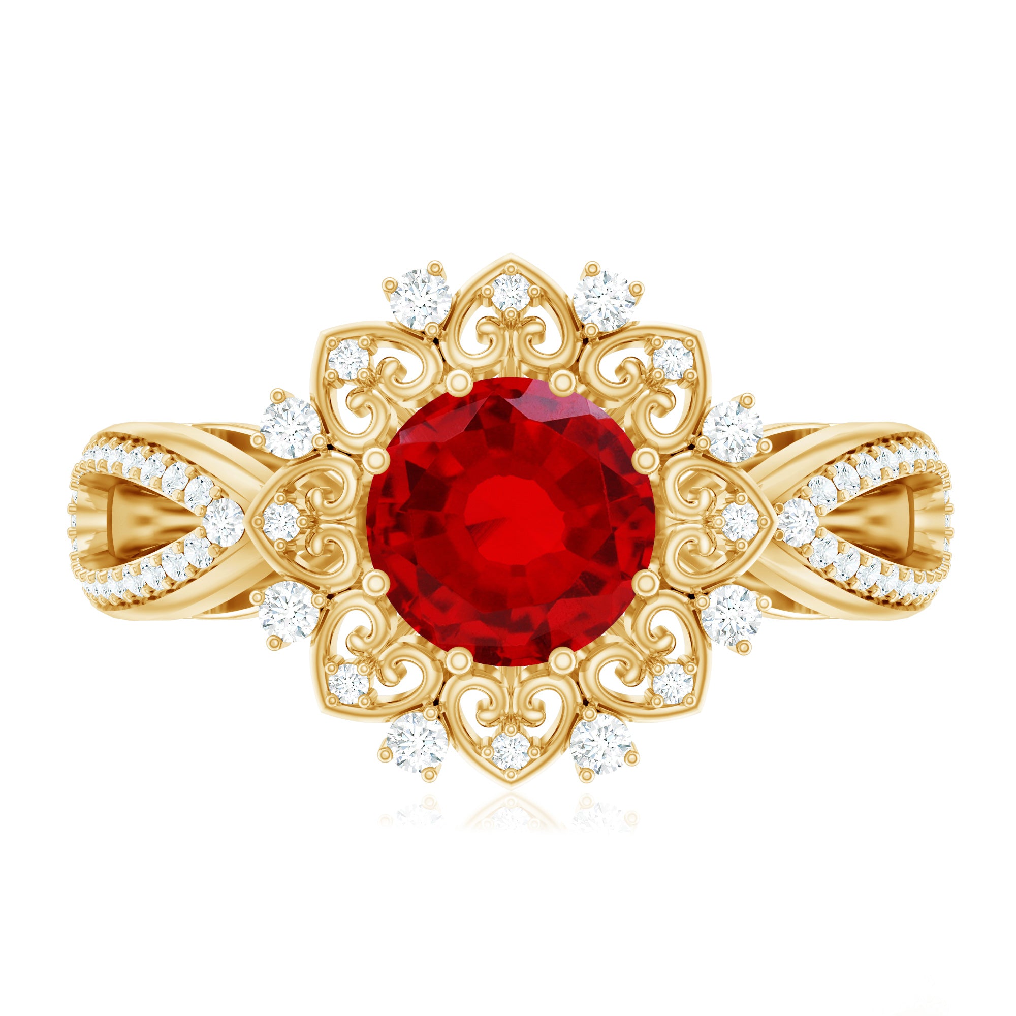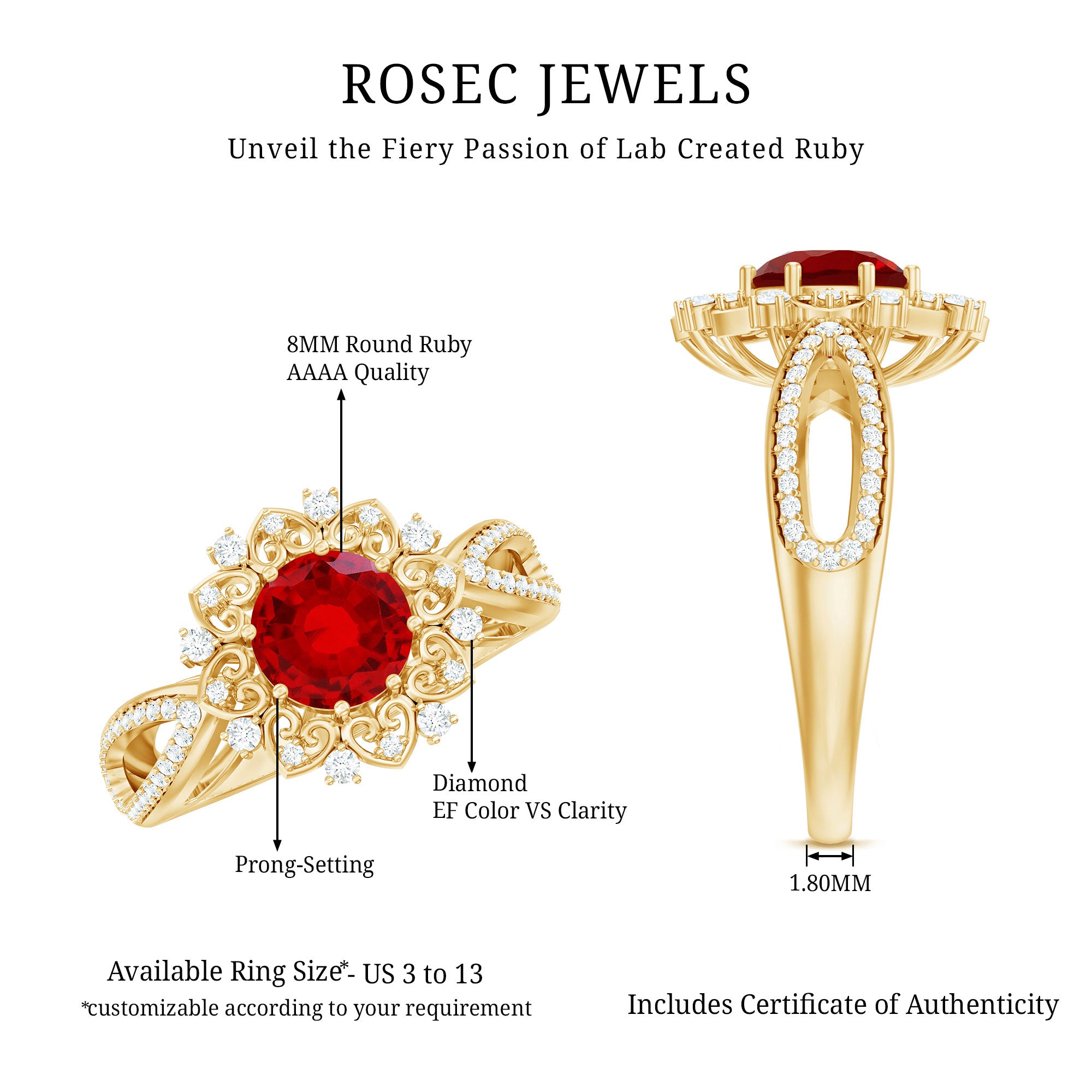 Make your special moment unforgettable with this Vintage Ruby Engagement Ring. Designed with care and elegance, this Antique Ruby Ring features a classic floral style that brings a romantic look to your engagement. At the center is a bold 8 MM round lab created ruby, surrounded by a delicate halo of lab-grown diamonds which also decorates the unique band. The diamonds are set in the center of vintage style metal designs, forming a flower around the ruby. Together with the rich red ruby, the diamonds create a charming design that feels both classic and unique. The setting is carefully made to be secure and comfortable, perfect for daily wear or special occasions. This ring is crafted with fine materials, including AAAA quality lab grown ruby and EF-VS quality lab created diamonds. Every detail is made with love, offering a ring that is both beautiful and long-lasting. With its vintage-inspired design and thoughtful details, this Ruby and Diamond Ring is a wonderful way to mark the beginning of a new journey. It brings together beauty, meaning, and timeless style in one perfect piece. Whether you love classic styles or want something with a touch of old-world charm, this Art Deco Engagement Ring is a lovely choice.