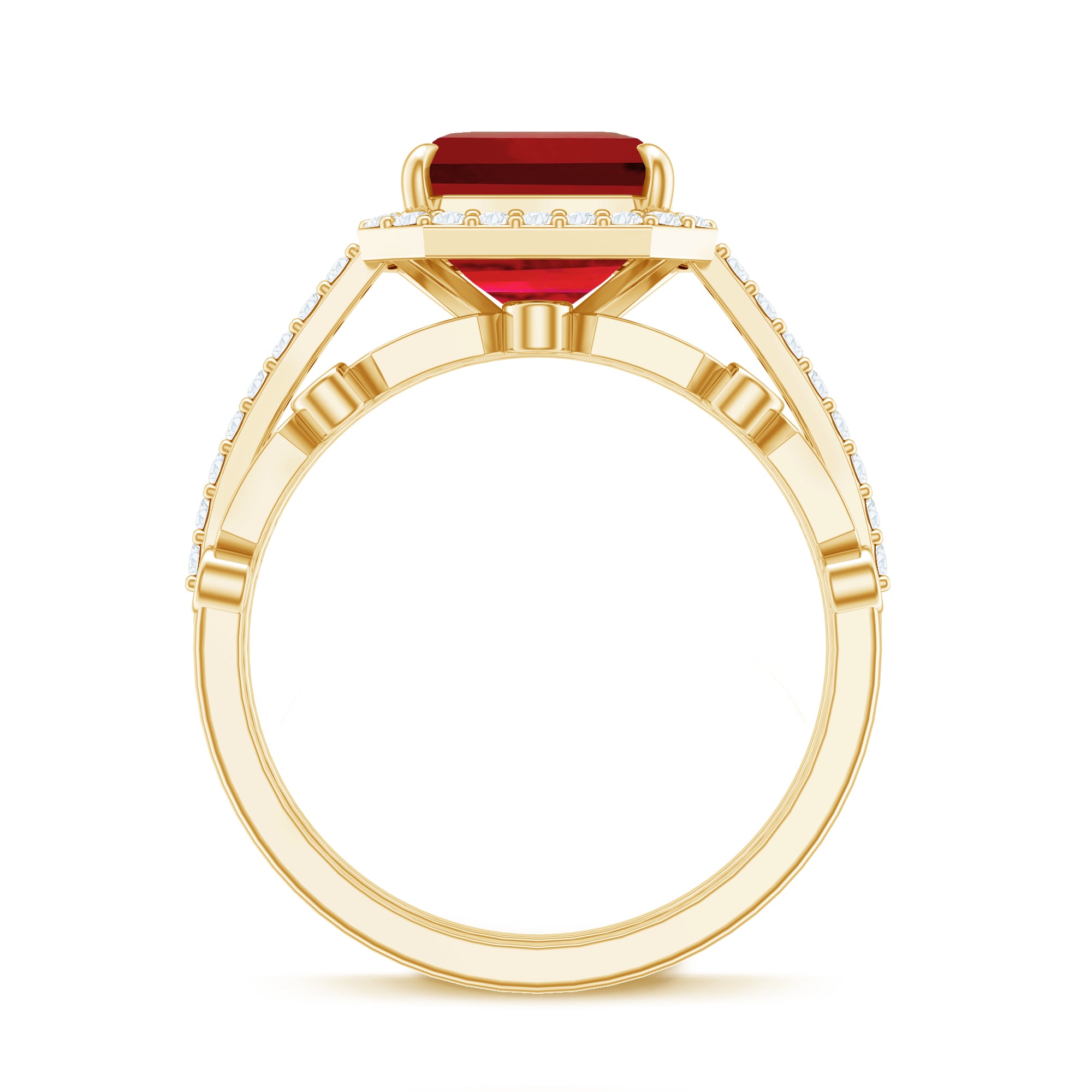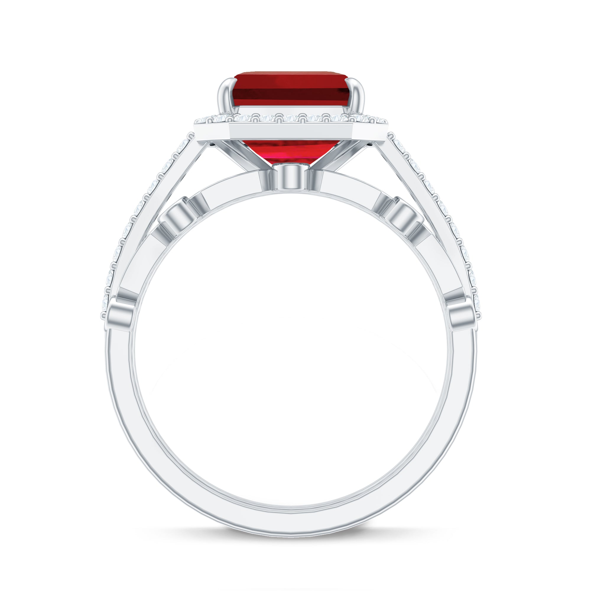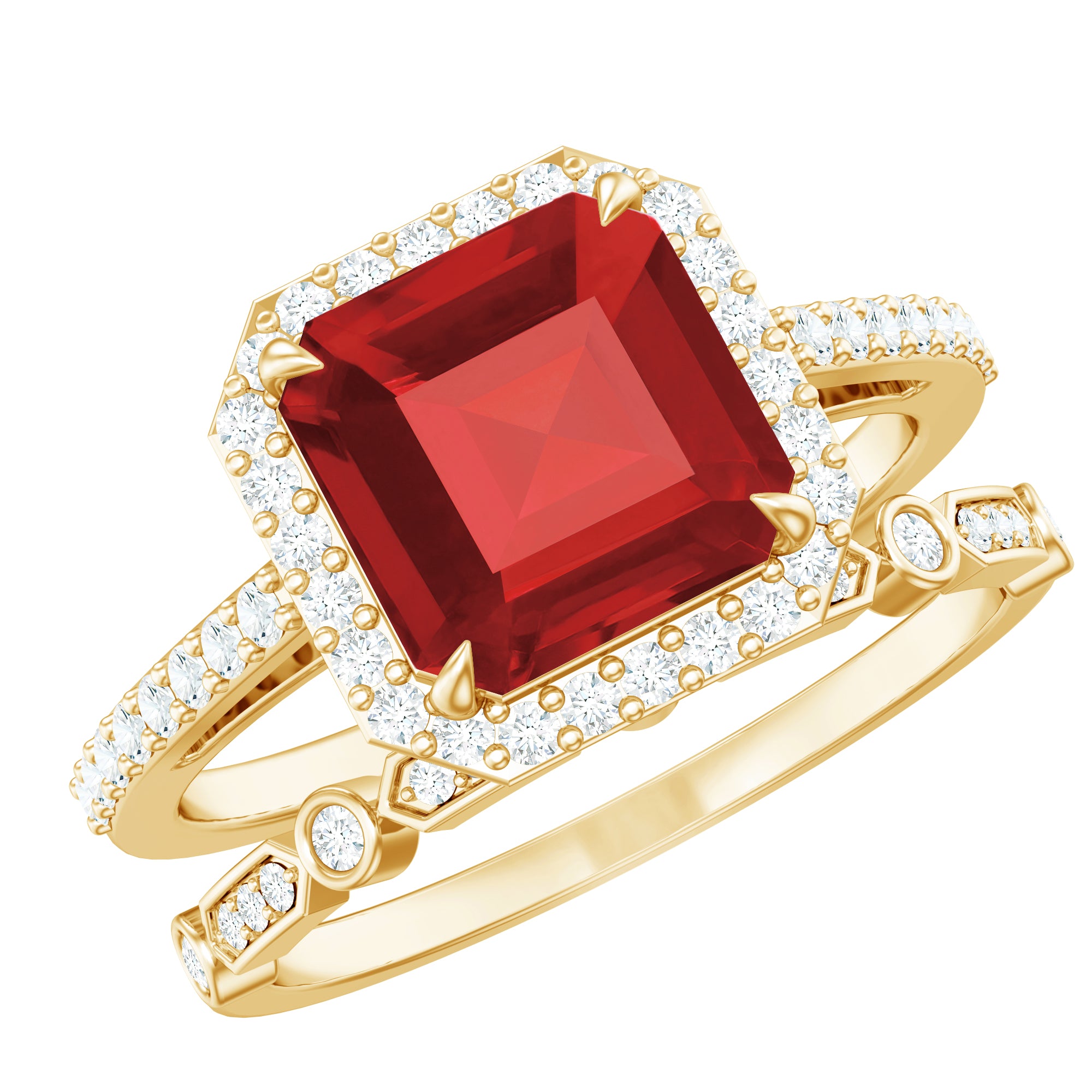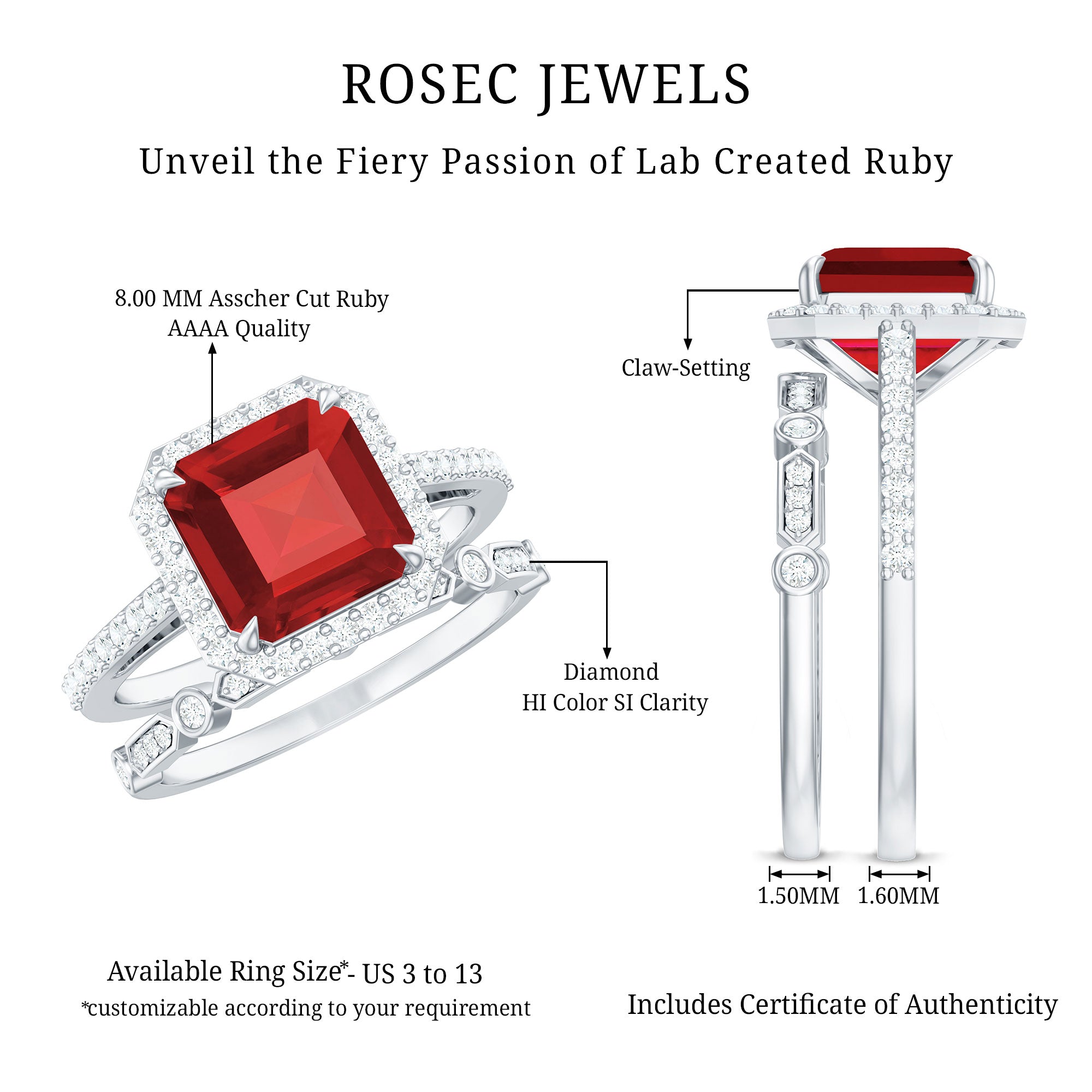 The Lab Created Ruby Wedding Ring Set is a two piece bridal beauty that perfectly mixes elegance, comfort, and meaning. It is designed for couples who want something truly special to symbolize their forever story. The main engagement ring shows off a stunning 8 MM asscher cut lab created ruby, safely held in claw setting. Around it sits a bright halo of tiny diamonds that shimmer beautifully whenever light touches them. The band is either covered in small diamonds that add an extra sparkle. Every angle of this ring catches attention in the most graceful way. What makes the Halo Bridal Set even more charming is the diamond enhancer ring that comes with it. It is designed to wrap around the engagement ring smoothly, creating a full and finished look. Together, both rings form a picture-perfect match that feels complete and balanced. The halo design and the snug fit of the enhancer make the entire Ruby and Diamond Wedding Ring Set look luxurious, yet romantic at the same time. Made with AAAA quality lab grown ruby and HI-SI quality diamonds, the craftsmanship is top-notch. Available in a variety of sizes, the rings are comfortable enough to wear every day while still making you feel special. It is a symbol of love, unity, and brilliance that will never fade.
