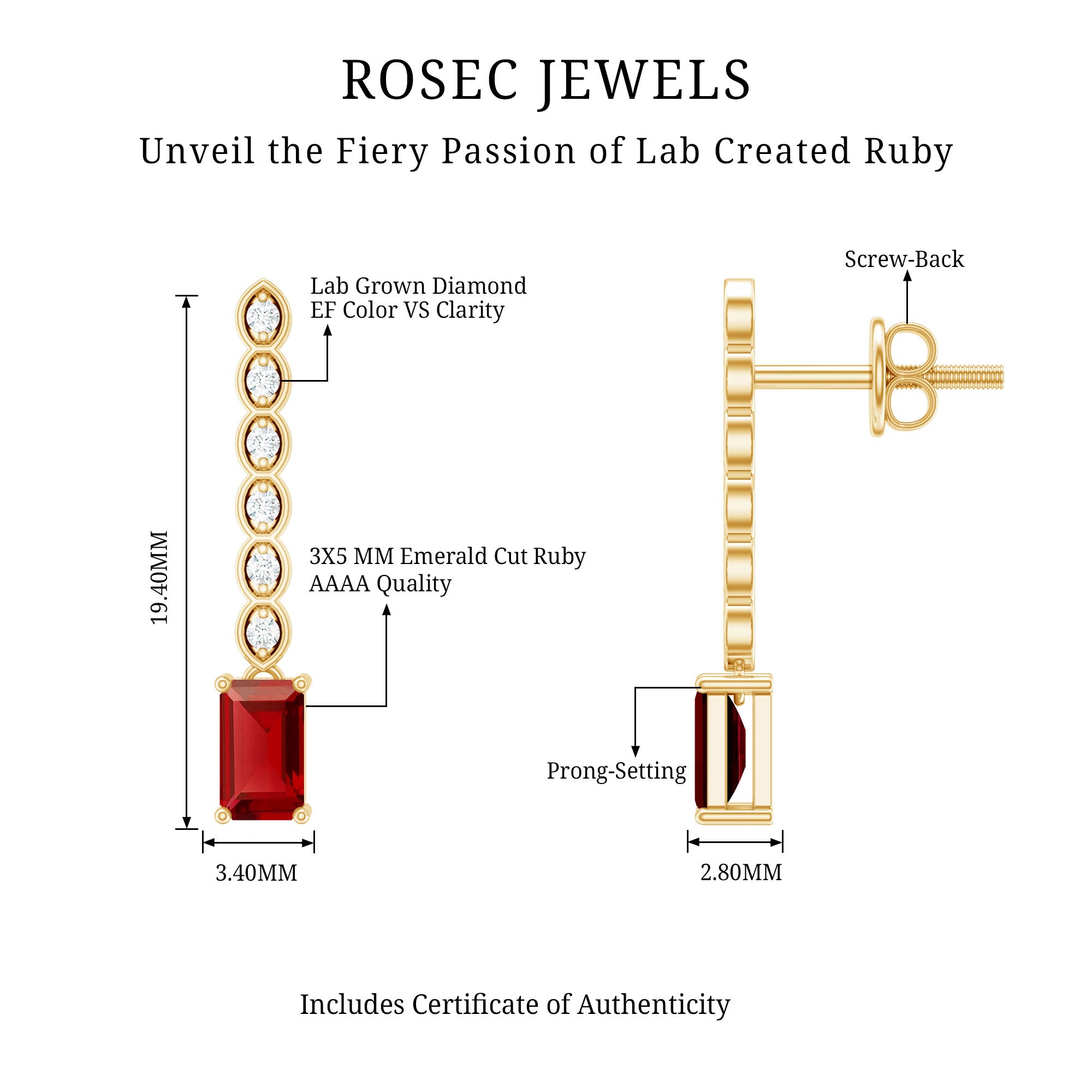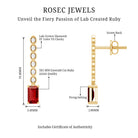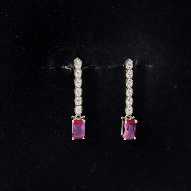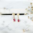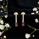 Designed for movement and shine, this pair of earrings brings a modern touch to a classic style. Made from yellow gold plated silver, the design is simple yet bold, perfect for both everyday wear and special occasions. Each earring features a 3X5 MM emerald cut lab created ruby, set securely in prong setting. A line of round lab grown diamonds adds a touch of sparkle above the ruby, giving the Dangle Drop Earrings a graceful drop effect that moves beautifully with every step. The deep red hue of the ruby is striking and full of character, offering a warm, confident touch to your style. With their simple drop design and finish, these Emerald Cut Ruby Earrings blend modern glamour with classic charm. Lightweight and easy to wear, they are finished with secure screw back closures to stay comfortably in place all day or night. Crafted using AAAA quality lab created ruby and EF-VS quality lab grown diamonds, these Ruby Drop Earrings reflect a commitment to both beauty and sustainability. Thoughtfully made with ethical and environmentally conscious stones, they offer a refined look without compromise. These Ruby and Diamond Earrings are a standout piece, elegant, bold, and perfect for those who appreciate fine design with a modern, responsible touch.