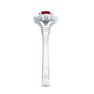 Inspired by the beauty of nature, this Lab Created Ruby Engagement Ring blossoms with elegance and charm. Designed for the woman who loves delicate details, the Halo Engagement Ring features a captivating 4 MM round cut lab created ruby at its center, held securely in prong setting. Surrounding the ruby is a sparkling halo of diamonds that enhances its brilliance and adds a graceful shimmer to the entire design. The band features a beautifully crafted split shank design that gives the ring a nature-inspired touch. Its gentle curves and open structure create a airy feel while maintaining a luxurious presence. The floral motif adds a romantic and feminine essence, making this piece truly stand out from traditional engagement styles. Every element of this Ruby and Diamond Ring is designed to capture attention while remaining elegant. The harmony between the AAAA quality lab created ruby and the surrounding HI-SI quality diamonds symbolizes passion, devotion, and timeless beauty. Its delicate beauty represents love that continues to grow and bloom with time. Presented in a beautifully packaged jewelry box, this Flower Engagement Ring is a lasting symbol of elegance and faithfulness, crafted to be cherished for years to come and admired for its truly unique design.