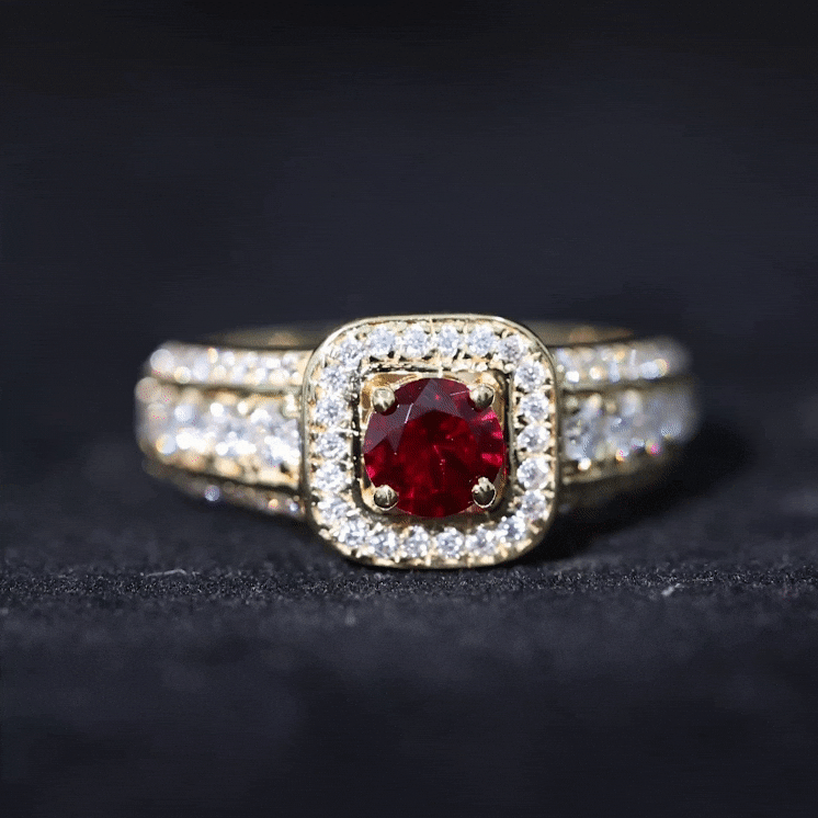 Enhance your look with a romantic touch by wearing this exquisite Statement Ring adorned with a Round Cut Lab Created Ruby at the center, accompanied by sparkling Round Cut Moissanite in an Accent Setting. This Created Ruby Ring is the perfect go-to accessory for all women. Let the allure of this stunning ring add a touch of elegance and charm to your style, making every occasion special and memorable.