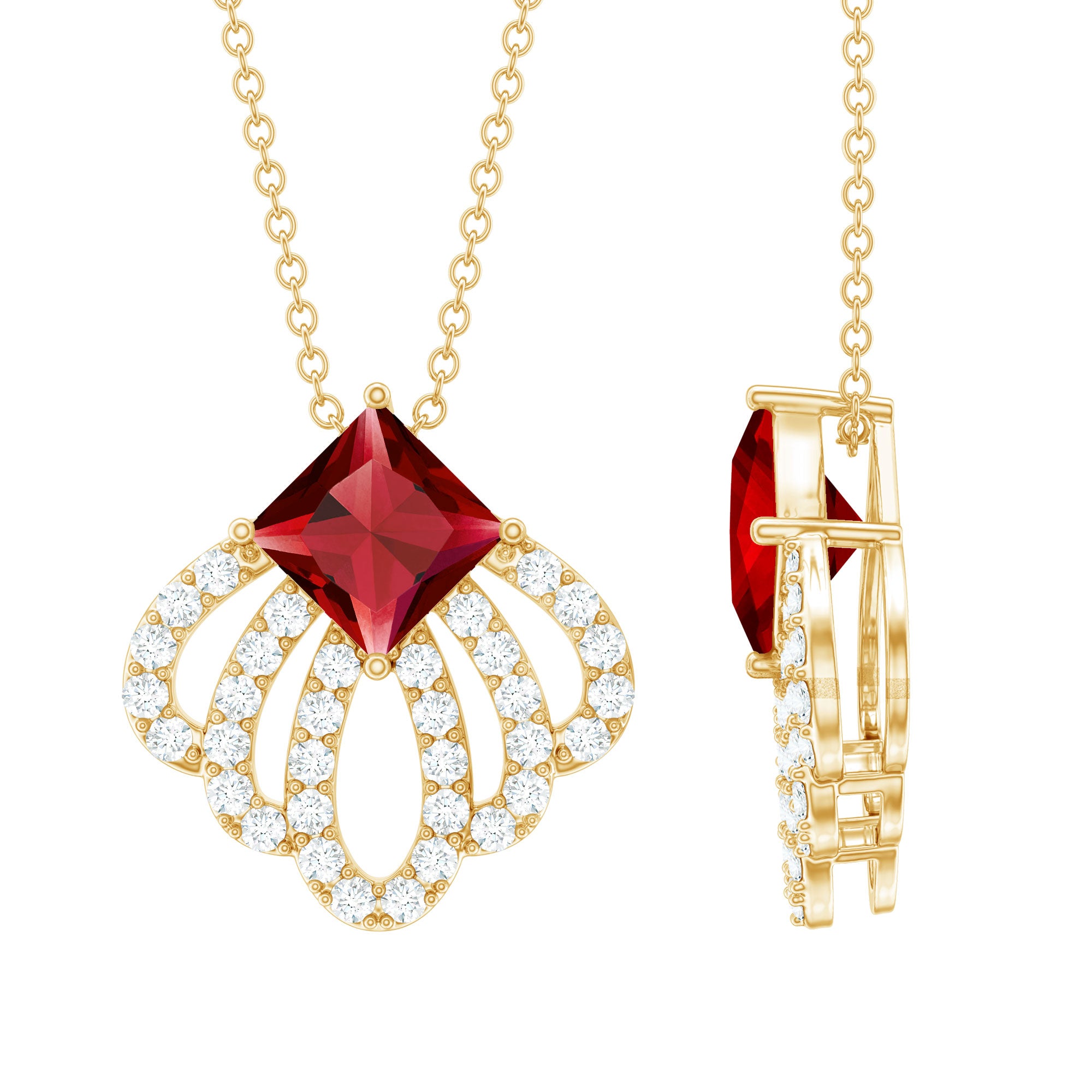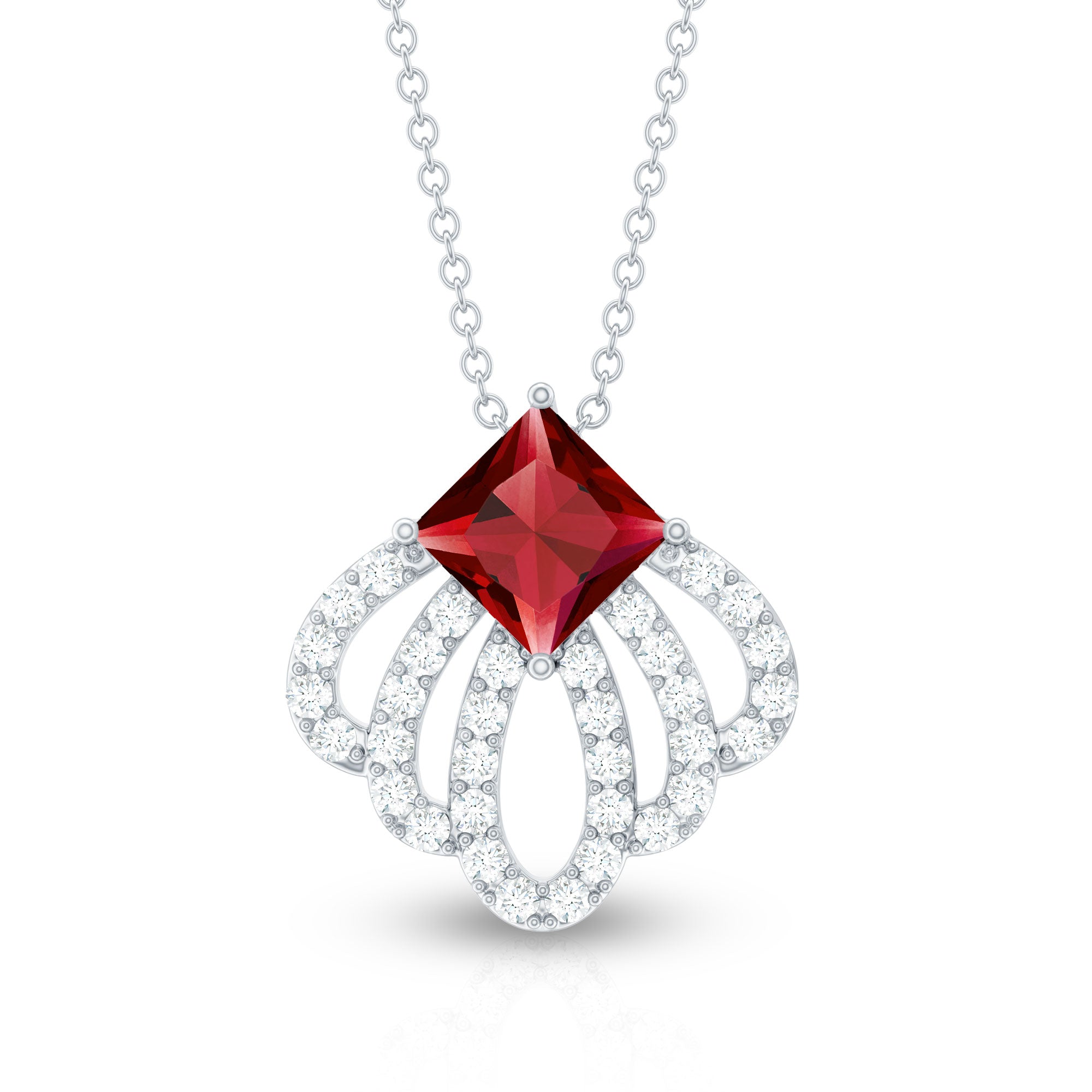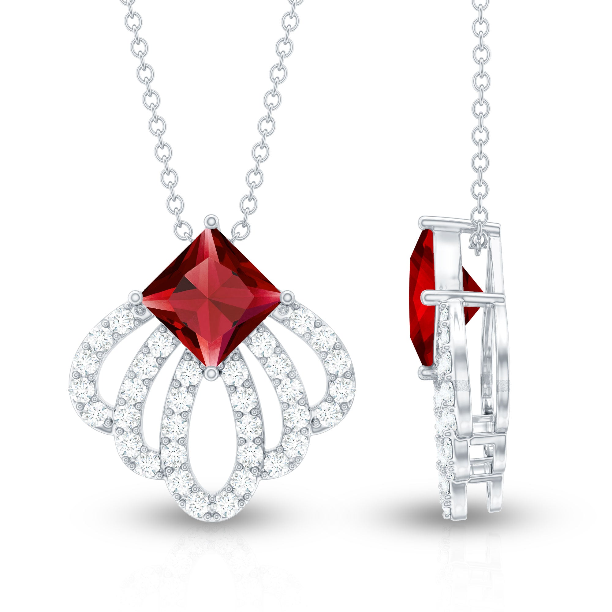 Delight her with the enchanting Flower Inspired Lab Created Ruby Pendant Necklace, a timeless piece that will become a cherished companion in her daily life. Its vibrant allure transcends day and night, ensuring shell treasure its beauty on every occasion. The exquisite design showcases a Aaaa Quality Princess Cut Ruby Pendant (6 mm, Lab Created) at the pinnacle, delicately attached to an artistic metal frame adorned with diamonds arranged in petal formations, adding a touch of grace and sophistication. The pendant sparkles with Aaaa Quality Ruby and Ef-Vs Quality Diamonds which will adore your neckline. Choose the Flower Inspired Synthetic Ruby Pendant Necklace by Rosec Jewels, and let your heartfelt gift create a lasting impression. This symbol of love and sophistication is sure to be a treasured keepsake, resonating with the beauty of your emotions.