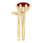 The Lab Ruby perched atop the flower creates a mesmerizing effect on this Engagement and Wedding Ring Set. This beautiful 2 piece Lab Ruby Engagement Ring Set is timeless and striking and is sure to be treasured for years to come. With a perfect vibrancy, the 10 mm Round Shape Lab Ruby at the center of the flower offers a stunning centerpiece. The Round Moissanite sitting on the flower petals and on the shank. To adorn this Ring is the V shaped enhancer having leaf shaped frame studded with Moissanite. This Stacking Ring set can be mixed and matched to create a variety of looks, ensuring that you fall in love with it over and over again. This Lab Ruby Flower Ring Set has the timeless elegance that will never go out of style.