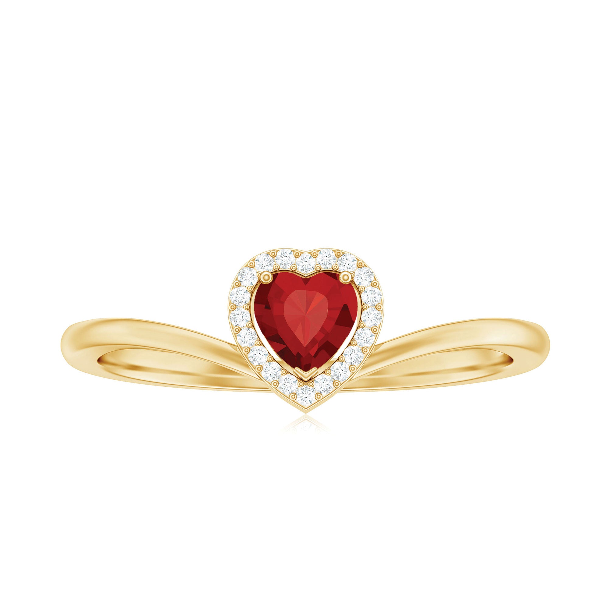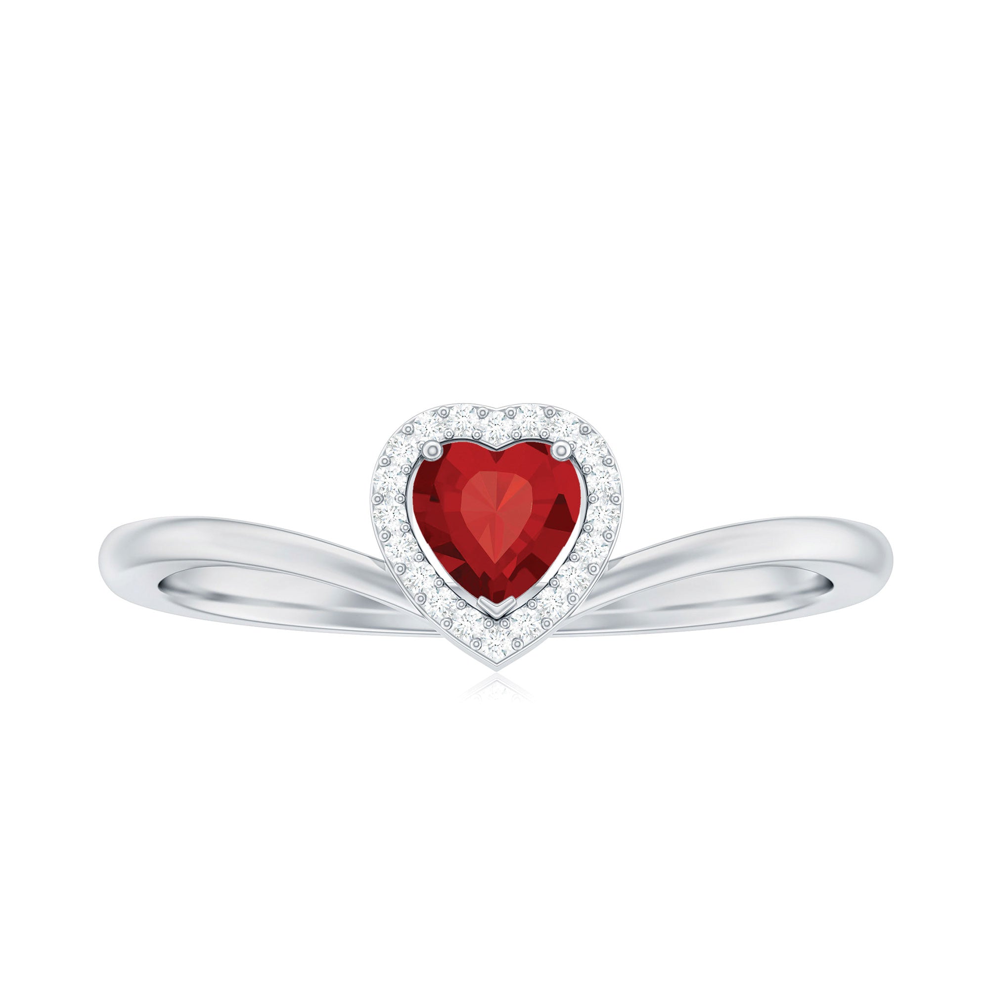 Add a little sparkle to your everyday or gift someone special with this adorable Heart Shaped Promise Ring. Designed with a sweet and stylish vibe, the Halo Ring features a 4 MM heart shaped lab created ruby sitting pretty in a secure prong setting. Its rich red color gives off a romantic feel, perfect for anyone who loves a pop of color with meaning behind it. Surrounding the ruby is a halo of tiny round diamonds that catch the light just right. What really makes this Ruby Heart Ring unique is its chevron-style band, which curves gently to hug the gemstone and gives the whole piece a modern twist. The blend of the heart shape and the chevron design creates a lovely mix of classic and trendy that is easy to fall for. Whether it is a promise, a special moment, or just a little treat for yourself, this Ruby and Diamond Ring is full of charm. It is light, easy to wear, and adds just the right touch of sparkle to any outfit, from casual to dressy. With its playful design and timeless feel, this Ruby Promise Ring is all about love, style, and sweet little promises that last.