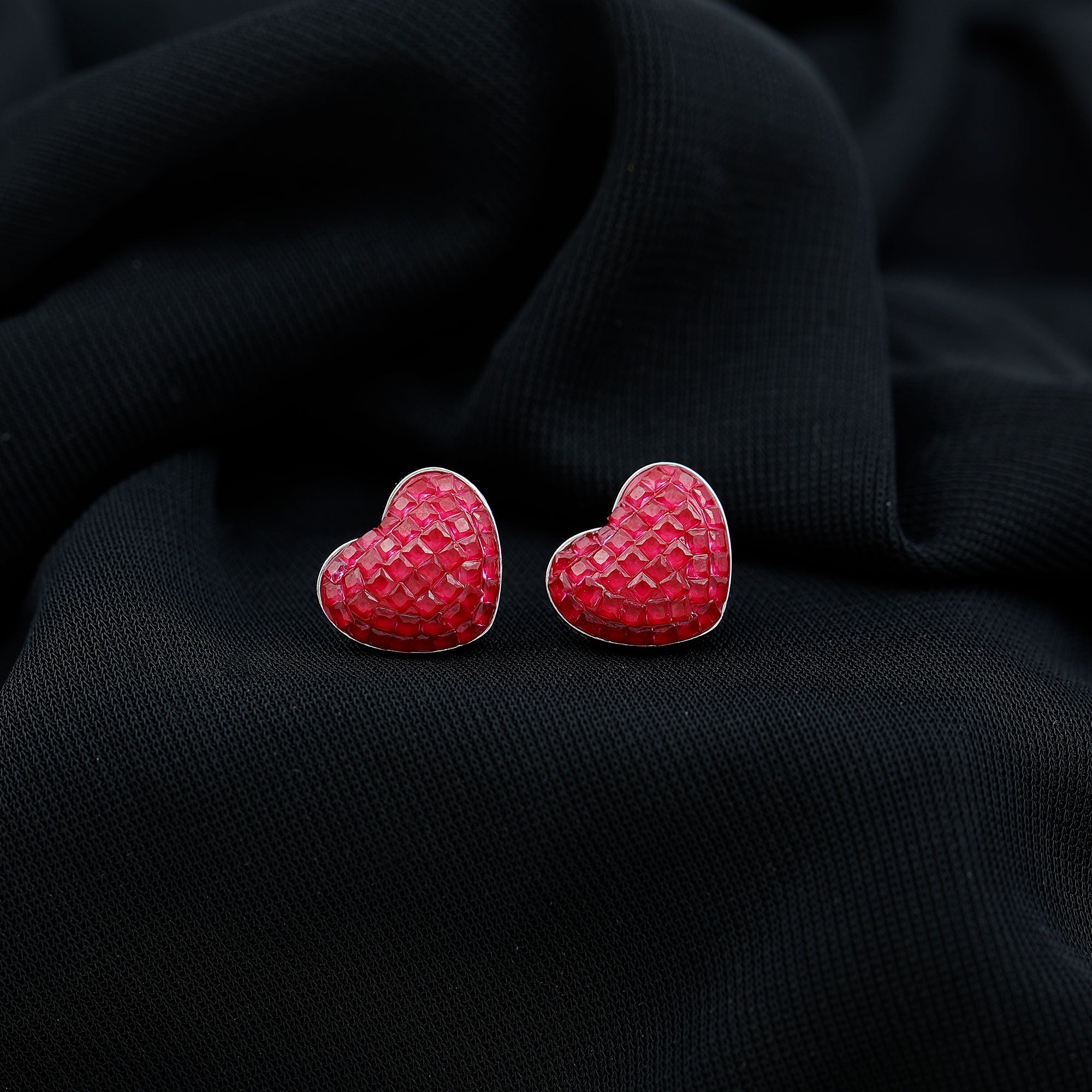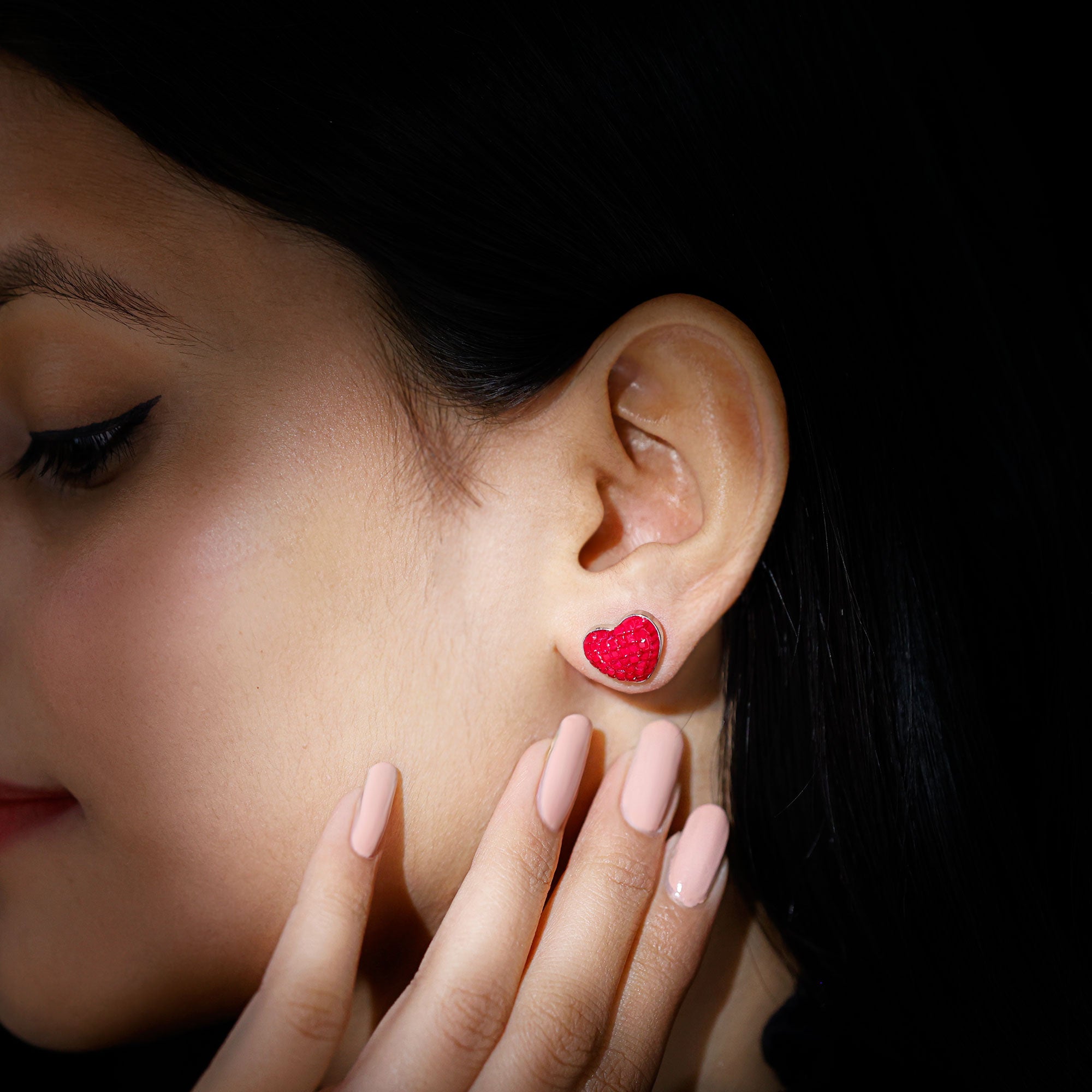 A heartfelt piece of jewelry, these Heart Stud Earrings are crafted to express warmth, romance and everyday elegance most sweetly. Each earring features a beautifully shaped Heart frame adorned with 2 mm Princess Cut Lab Created Ruby stones that shimmer with rich red color. Their vibrant red glow brings a touch of love to any outfit, while the 925 Sterling Silver adds a soft, timeless shine that lets the Lab Ruby stones truly stand out. Secured with Screw Back Closure, these Heart Shaped Earrings offer comfort and confidence, whether you are heading out for a special occasion or simply brightening up your daily look. Their charming heart design makes them wonderfully versatile, perfect to pair with casual dresses or evening ensembles. Presented in a signature jewelry box, these Lab Ruby Heart Earrings also make an unforgettable gift for birthdays, anniversaries, Valentine’s Day or any moment meant to celebrate love and connection. With their romantic shape and radiant sparkle, these Lab Grown Ruby Earrings are crafted to be cherished for years to come.