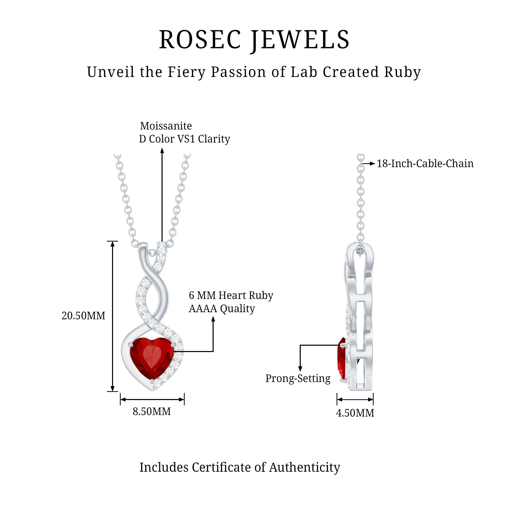 This Infinity Heart Pendant will mesmerize everyone when you will walk around the town as it is adorned with 6 MM Heart Shape Lab Created Ruby secured in 3 Prong Setting while Round Shape Moissanite studded on the infinity design. This Lab Created Ruby Pendant is fashioned in Hallmarked Metal and will enhance your style and fill your day with compliments. It is a beautiful symbol of hope, love, and endless possibilities. The Ruby and Moissanite Necklace represents eternal love, unity, and everlasting bonds, making it a perfect choice for weddings, anniversaries, or meaningful gifts for someone special. Whether worn daily or on special occasions, it adds a graceful touch to any outfit. With its combination of lab made ruby, sparkling moissanites, and thoughtful design, this Infinity Pendant Necklace is a meaningful addition to any collection and a reminder of the unbreakable bonds that last a lifetime. It will be delivered in a premium quality packaging with the certificate of authenticity.