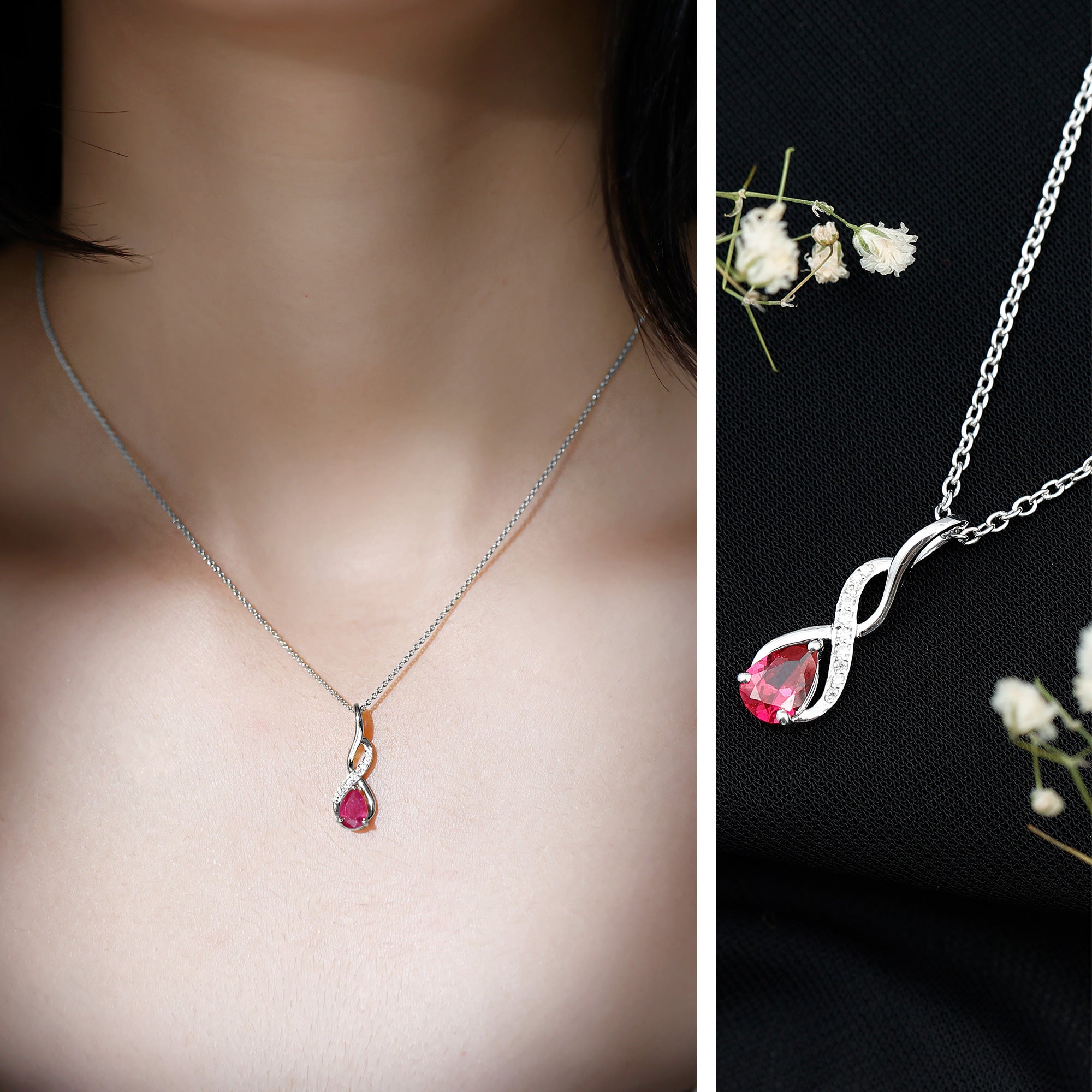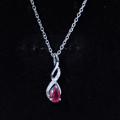 Show your loved one how deep and never-ending your love is with this elegant Infinity Pendant Necklace, designed to blend meaning, beauty, and romance in one stunning piece. At the bottom of the infinity symbol rests a radiant 5X7 MM pear cut lab created ruby, held securely in prong setting. Along the curve of the infinity sign, sparkling D-VS1 quality round cut moissanites add brilliant shine, creating a graceful contrast with the ruby’s glow. Crafted from high-quality metal, the Ruby Teardrop Necklace offers durability and a finish that will stay beautiful for years. Suspended from a smooth cable chain, this AAAA quality Ruby Infinity Necklace sits comfortably around the neck, making it easy to wear on both casual days and romantic evenings. Its design brings a gentle sparkle and a touch of sophistication to any outfit. Ideal for anniversaries, Valentine’s Day, or expressing your everlasting affection, this Ruby and Moissanite Pendant carries a message of eternal love and unbreakable connection.