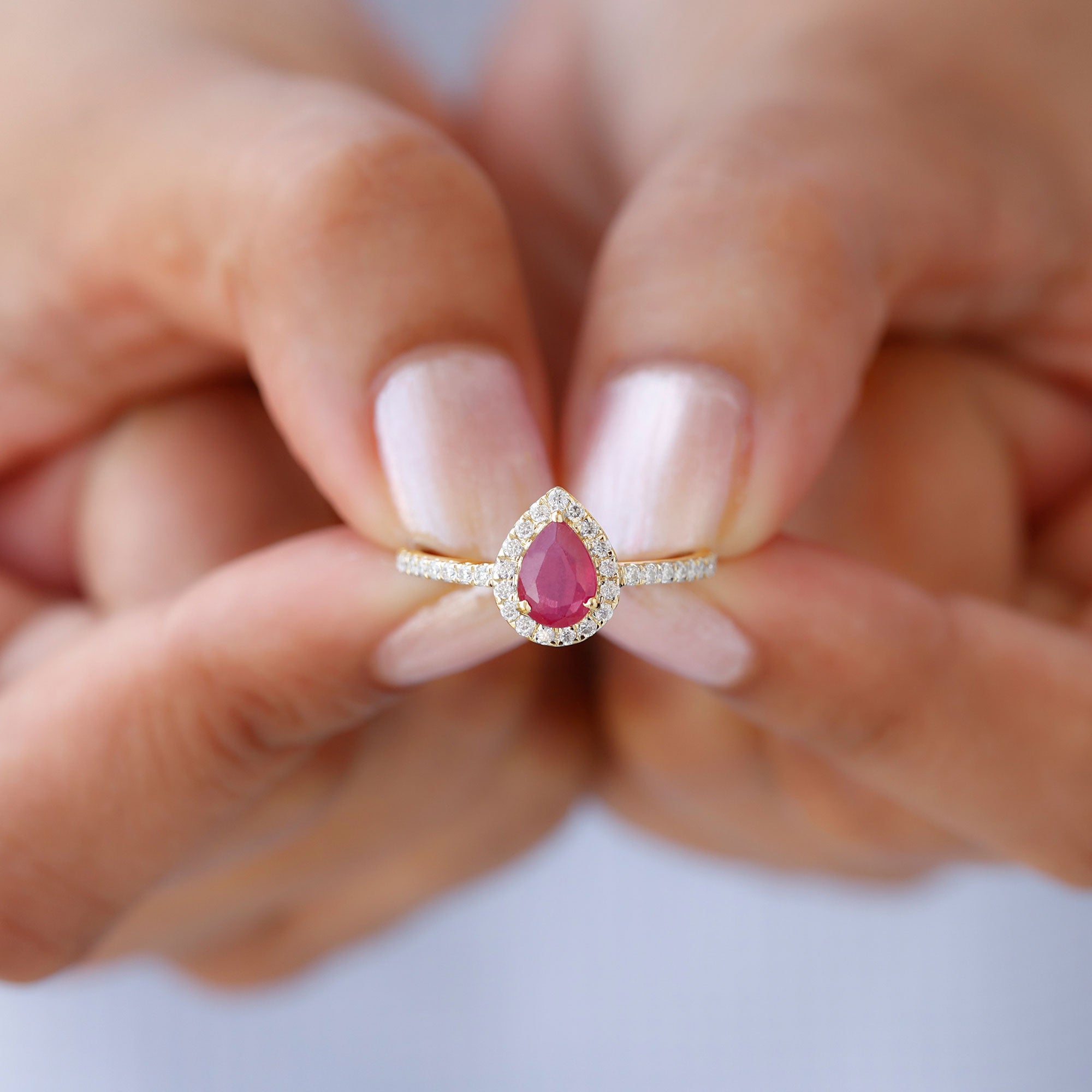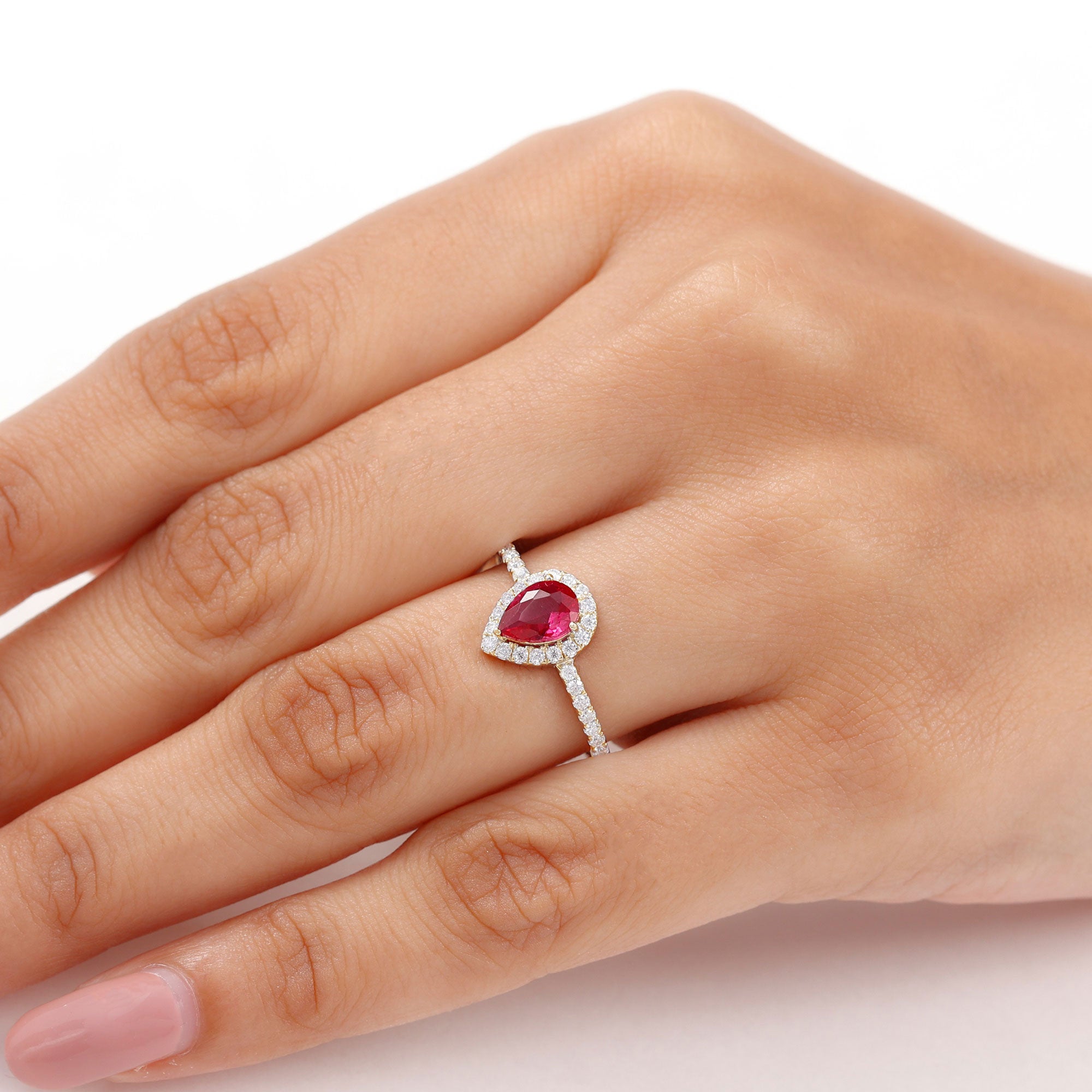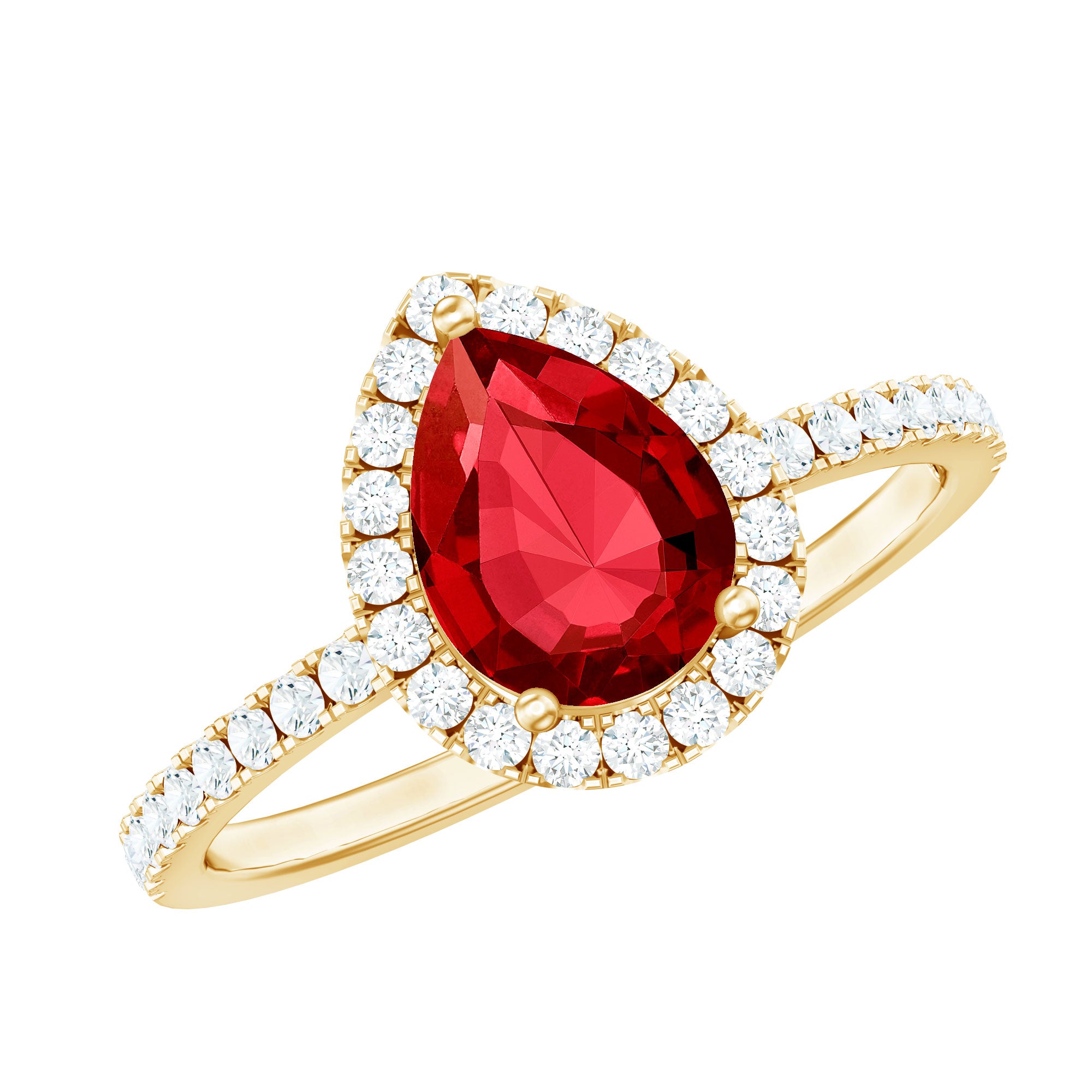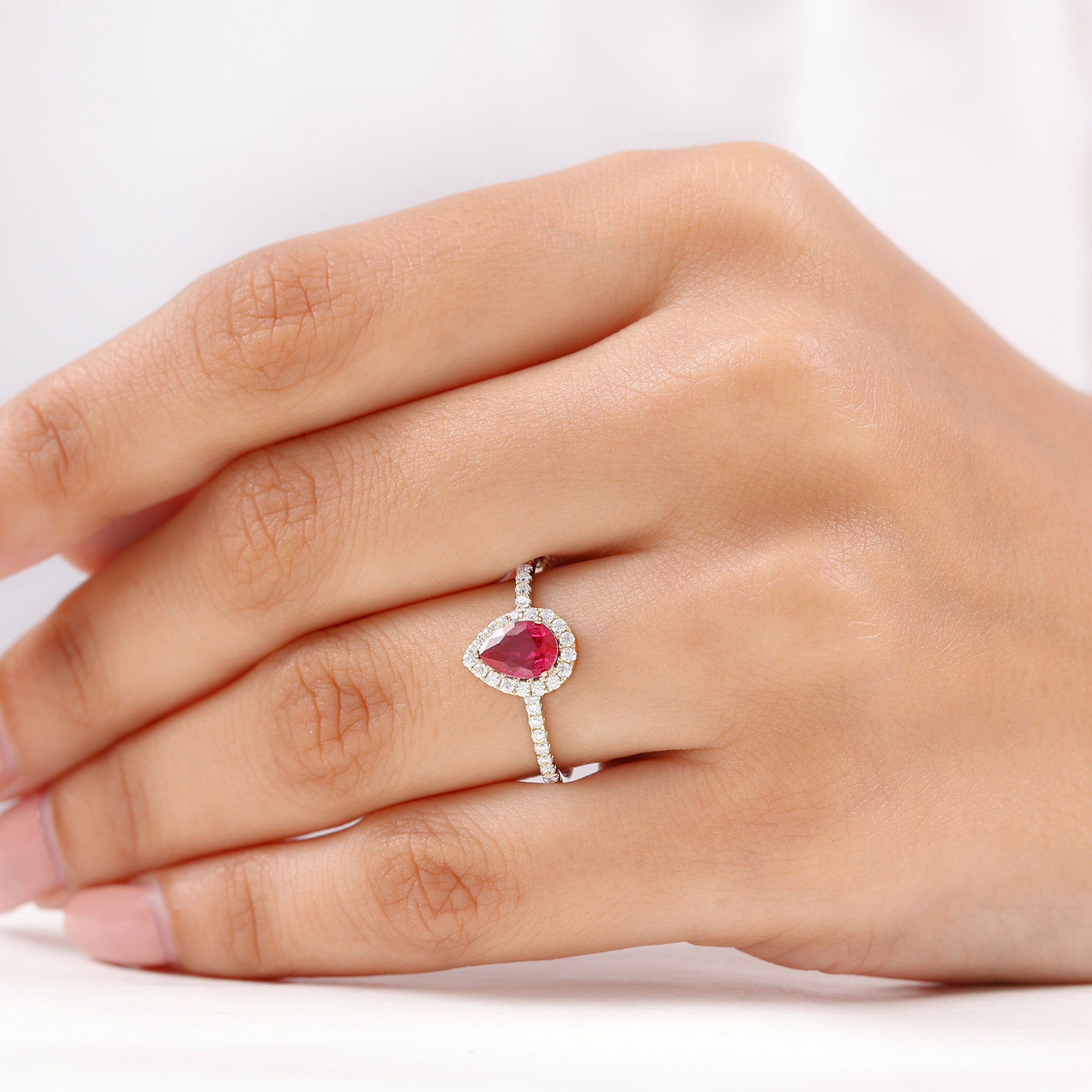 Cherish every moment with our Halo Engagement Ring adorned with Pear-Shaped Created Ruby encircled by Diamonds creating an alluring contrast. The Diamond-lined shank contributes to an overall appearance. Steal the spotlight with this Created Ruby Ring that captures hearts with its deep red allure and captivating brilliance. Whether you are searching for a ring for your big day or just want to surprise her this wedding anniversary, get this Ruby Diamond Ring for your beloved and make every moment special with her.