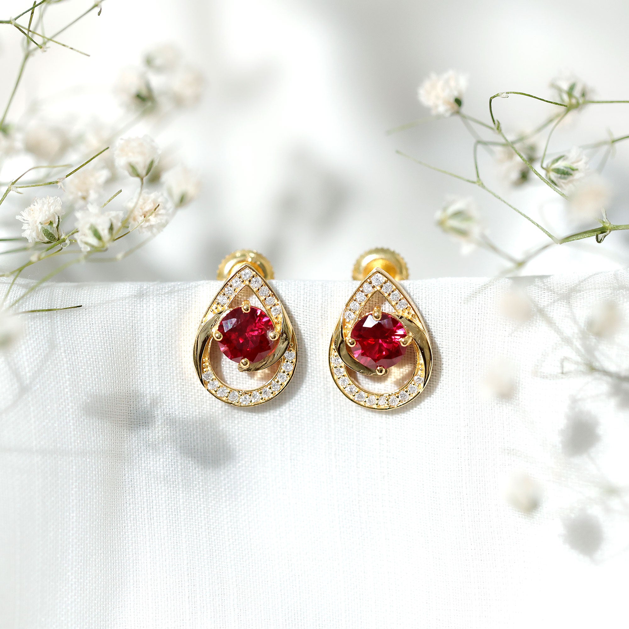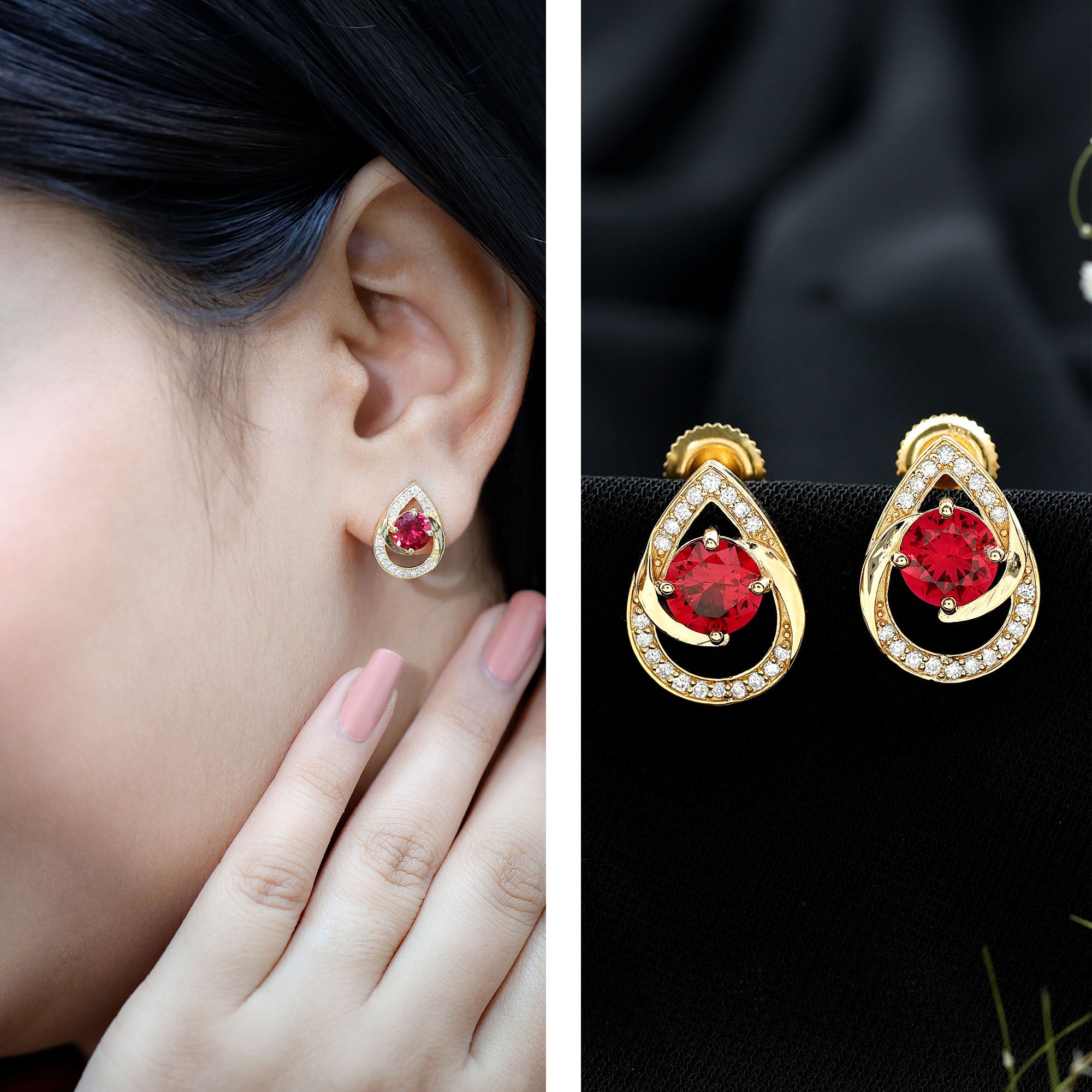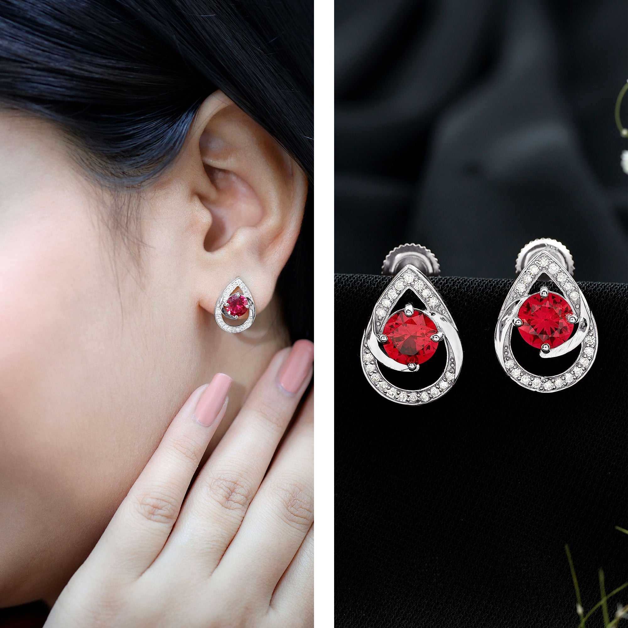 Capture timeless elegance with these classic Teardrop Stud Earrings. Skillfully handcrafted, the 6 mm Round Shape Ruby set in a Prong Setting as a center stone. The Teardrop shape, accentuated by Lab Grown Diamond gemstones adds a touch of sophistication, while the Screw Back Closure ensures a secure fit. The Aaaa quality Red Ruby Earrings can be worn on various occasions and can turn heads towards you. Gifting these lab created Ruby and Diamond Earrings to your lady is the perfect idea to express your love. These Ruby Stud Earrings are beautiful and classy enough to mark the statement with your style and if you are a July-born then these studs are the perfect match for your persona.