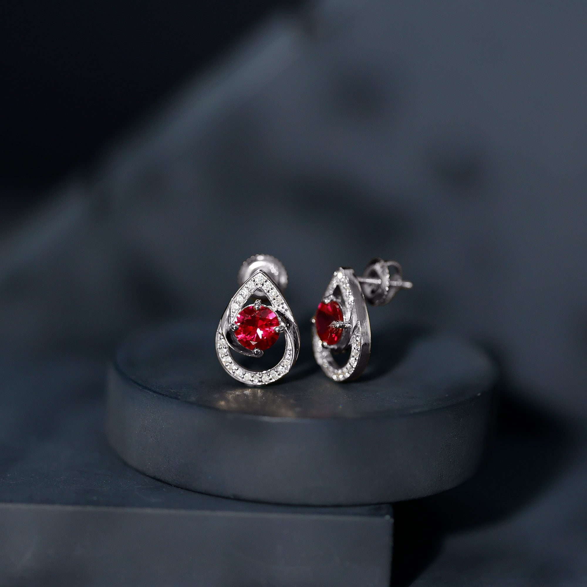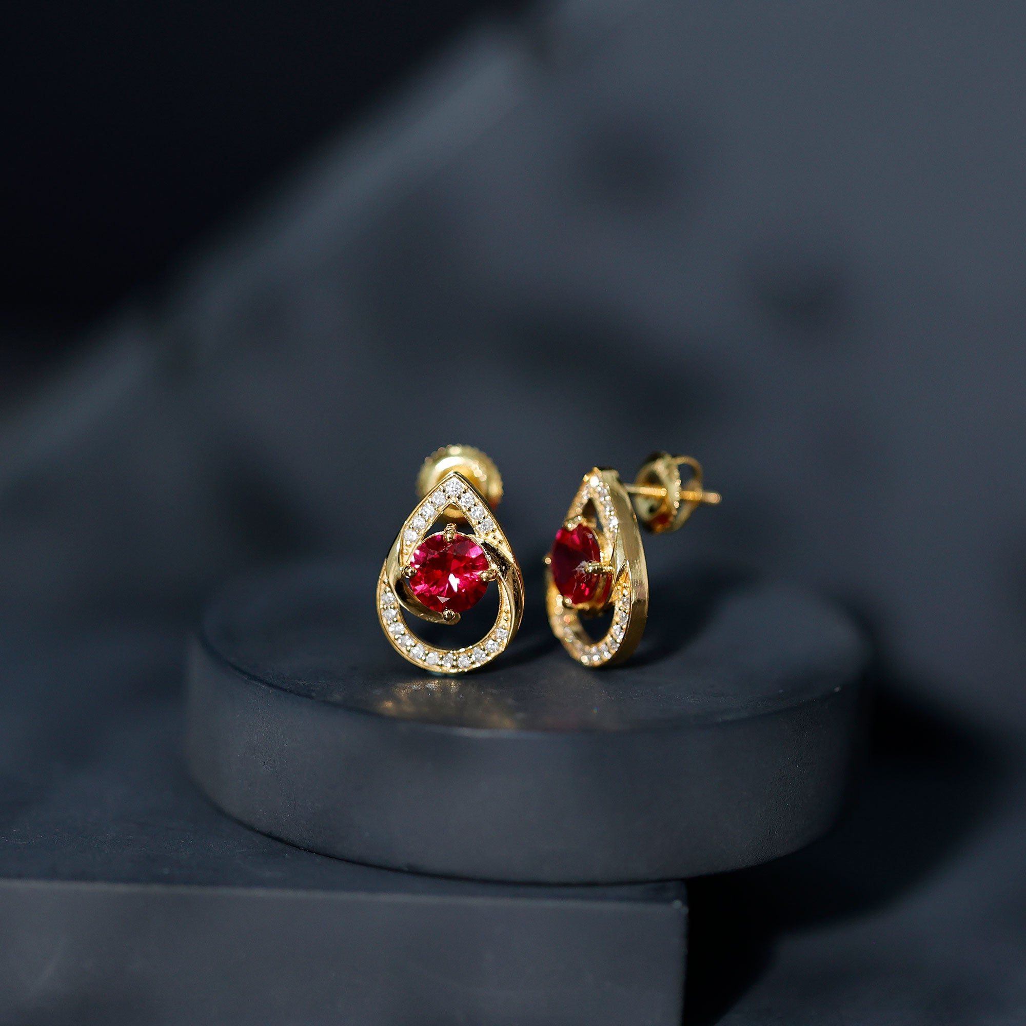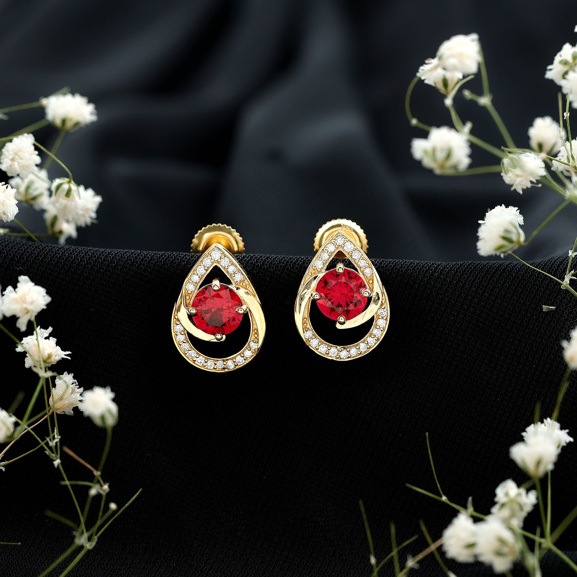 Capture timeless elegance with these classic Teardrop Stud Earrings. Skillfully handcrafted, the 6 mm Round Shape Ruby set in a Prong Setting as a center stone. The Teardrop shape, accentuated by Lab Grown Diamond gemstones adds a touch of sophistication, while the Screw Back Closure ensures a secure fit. The Aaaa quality Red Ruby Earrings can be worn on various occasions and can turn heads towards you. Gifting these lab created Ruby and Diamond Earrings to your lady is the perfect idea to express your love. These Ruby Stud Earrings are beautiful and classy enough to mark the statement with your style and if you are a July-born then these studs are the perfect match for your persona.
