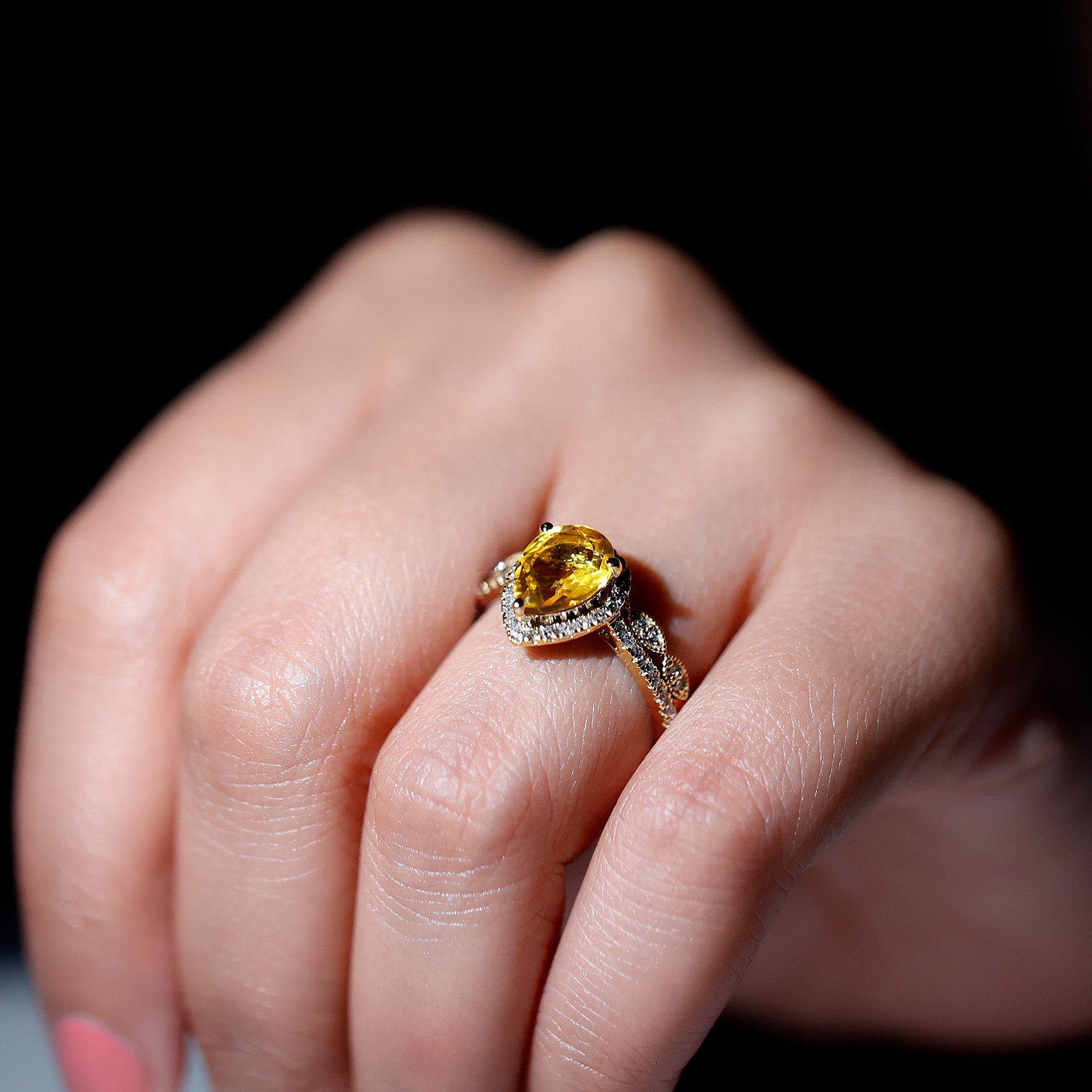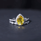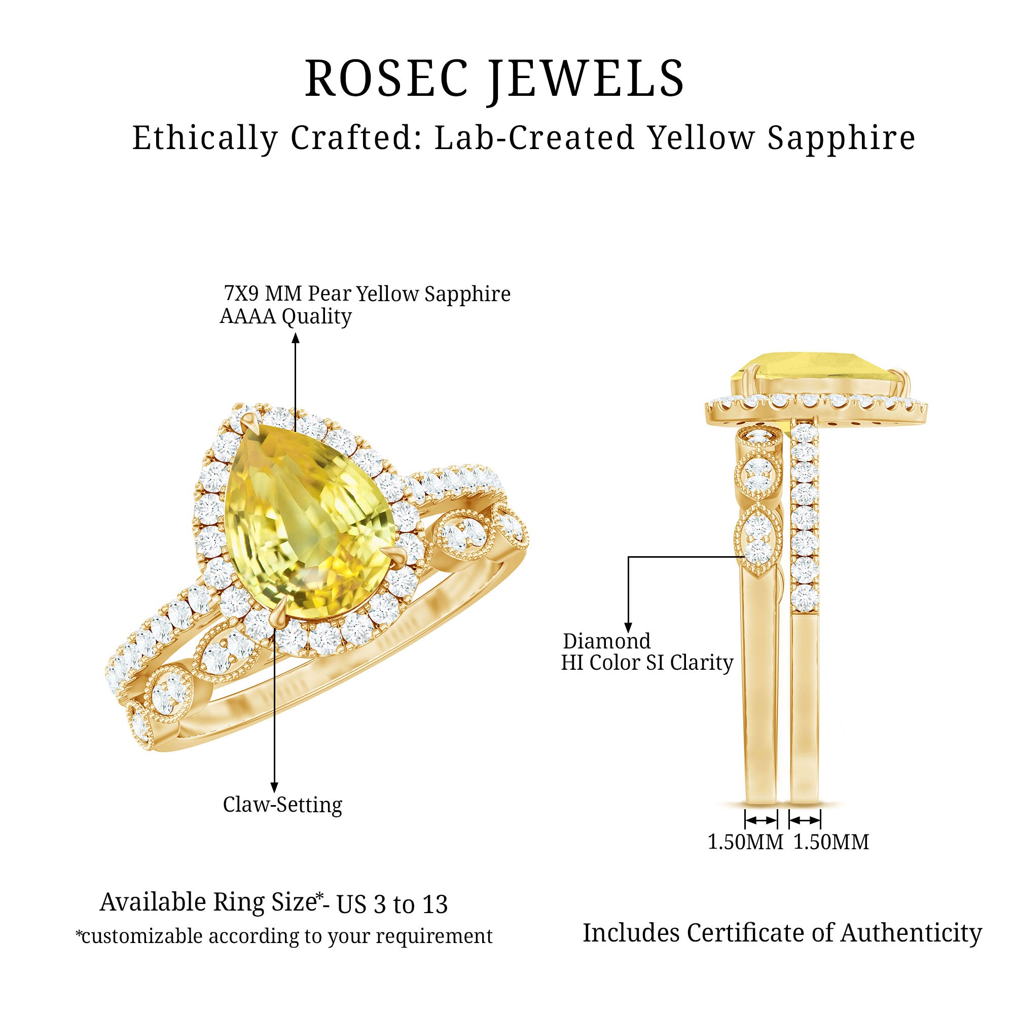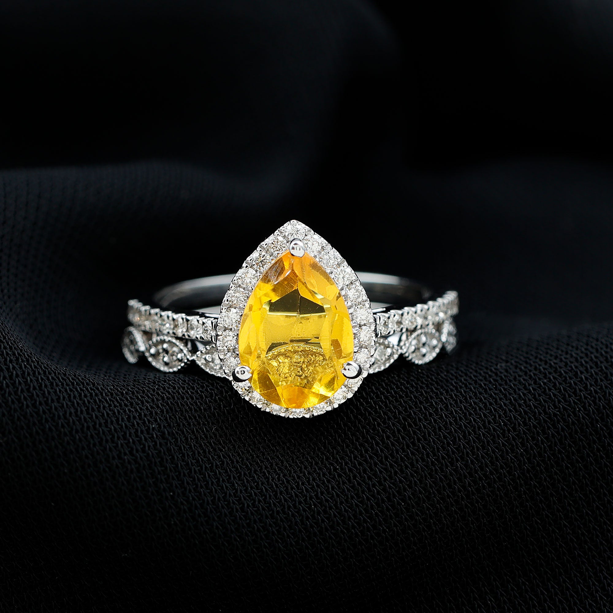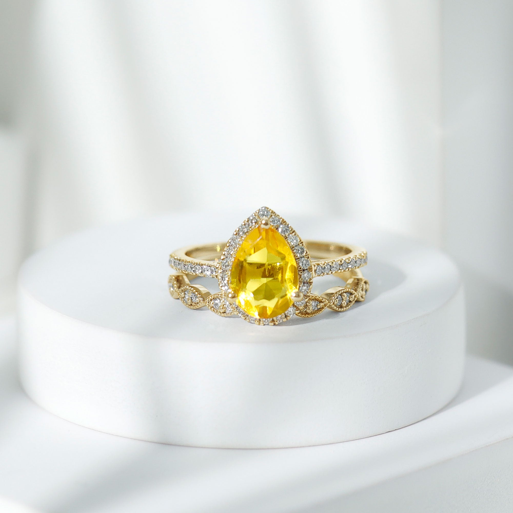 Commemorate your special day with this Teardrop Ring with Band, a stunning testament to your everlasting love and devotion. This Ring Set of 2 features an Engagement Ring adorned with 7X9 MM Pear Shape Lab Created Yellow Sapphire set in Claw Setting surrounded by a sparkling Diamond Halo, for added brilliance. The Designer Wedding Band is decorated with Round Diamond gemstones and Beaded Detailing. A perfect choice for your lady love, this Ring Set is sure to impress.