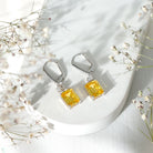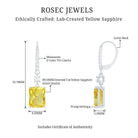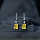 These Lab Grown Yellow Sapphire Earrings are associated with prosperity and love. To truly enhance your special wedding day or just to add a modern flair, these Dangle Drop Earrings are a great to wear options and are crafted from White Gold Plated Silver. Embellished with 8X10 MM Emerald Cut Lab Grown Yellow Sapphire in Prong Setting and a Round brilliant cut Moissanite that sits on top of the main gemstone, scintillates beautifully. Decorating the upper dangle are the Round brilliant cut Moissanite that makes it a standout Bridal Earrings accessory, which she would love to carry with her always. As a contribution to royalty and classy appeal, these Emerald Cut Earrings have a charming detail that keeps them elegant and their bright color and bold style make them stand out from the crowd. Maximizing sparkle and brilliance, these Hoop Drop Earrings have a subtle and elegant tone of AAAA Quality Lab Grown Yellow Sapphire and D-VS1 Quality Moissanite, with exceptional brilliance.