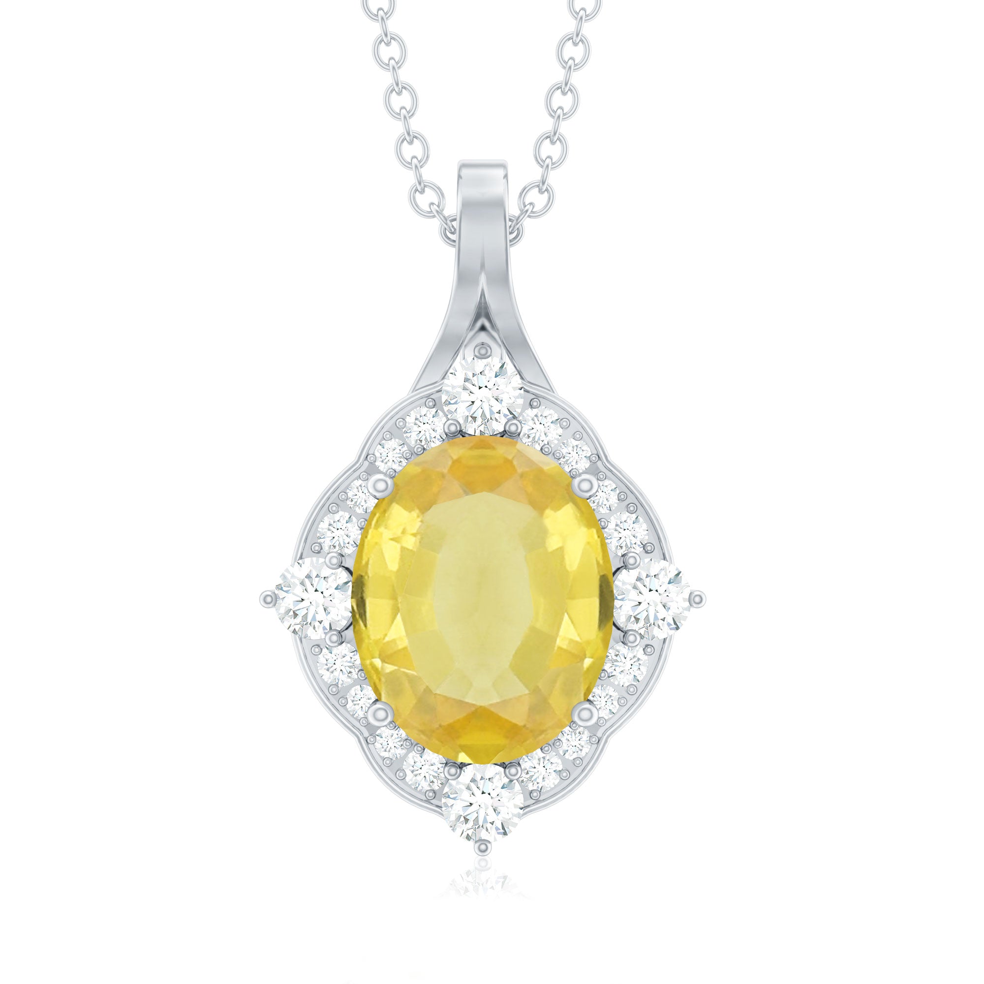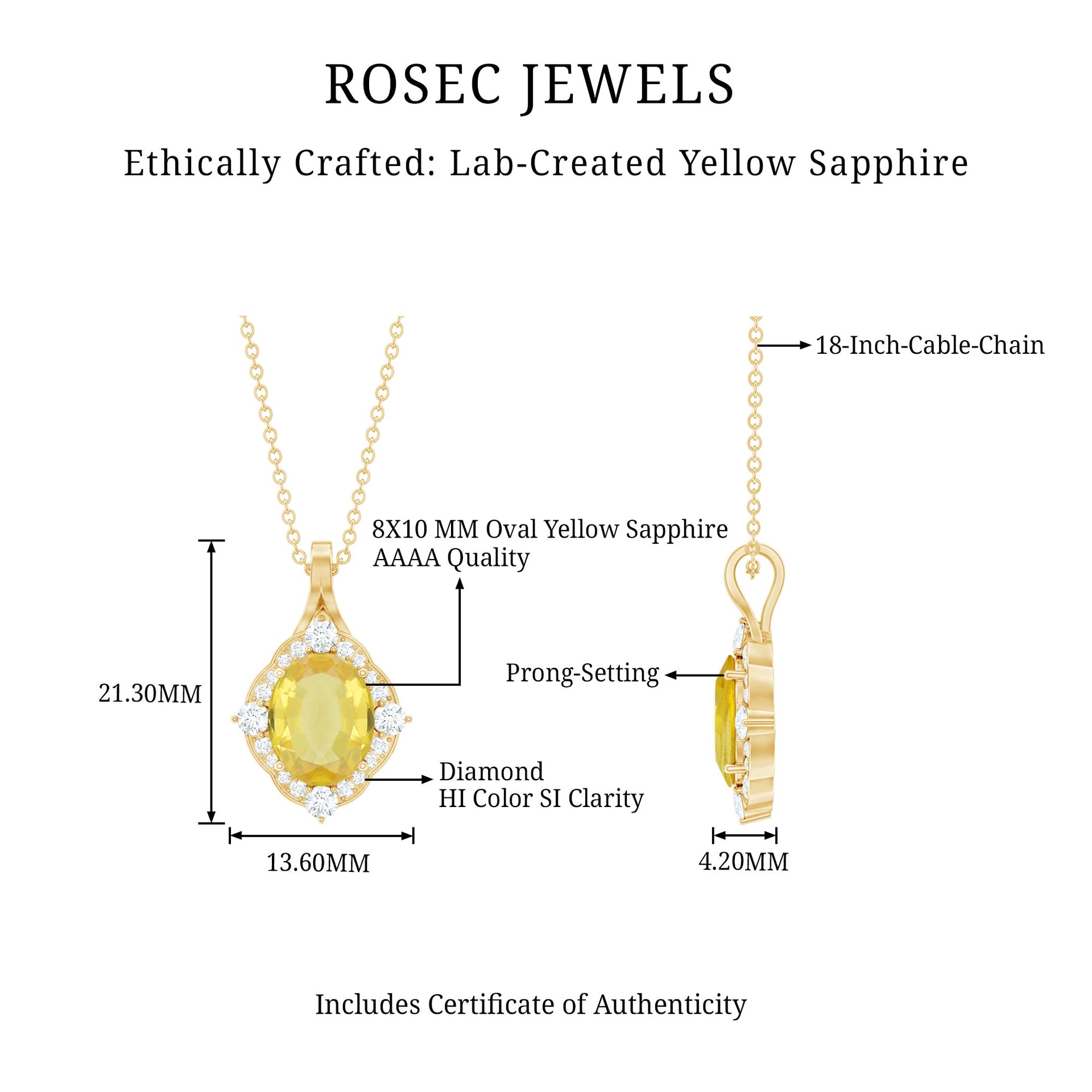 Looking for sparkling and classic jewelry to pair with an outfit for a special day, then this Lab Grown Yellow Sapphire Pendant will be a classic choice. The pendant features an 8X10 MM Lab Created Yellow Sapphire securely placed in Prong Setting encircled with petite Diamonds that embrace the look. The pendant beholds the classic shine of AAAA Quality Cultured Yellow Sapphire embraced by a radiant shine of HI-SI Quality Diamond. This Vintage Inspired Necklace will be delivered to you in a signature jewelry box with the certificate of authenticity.