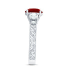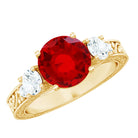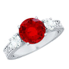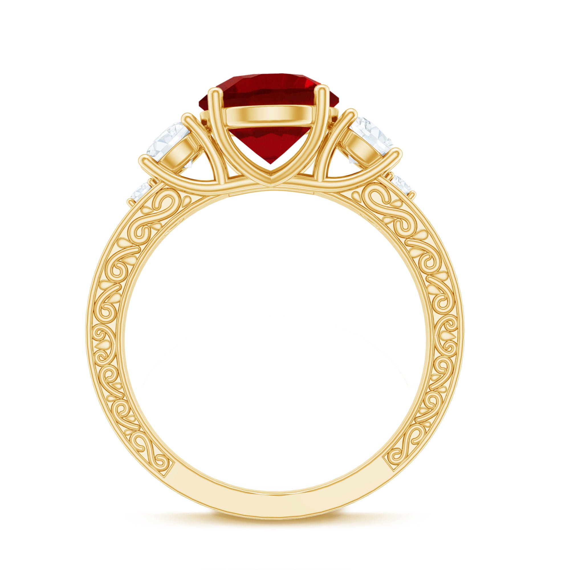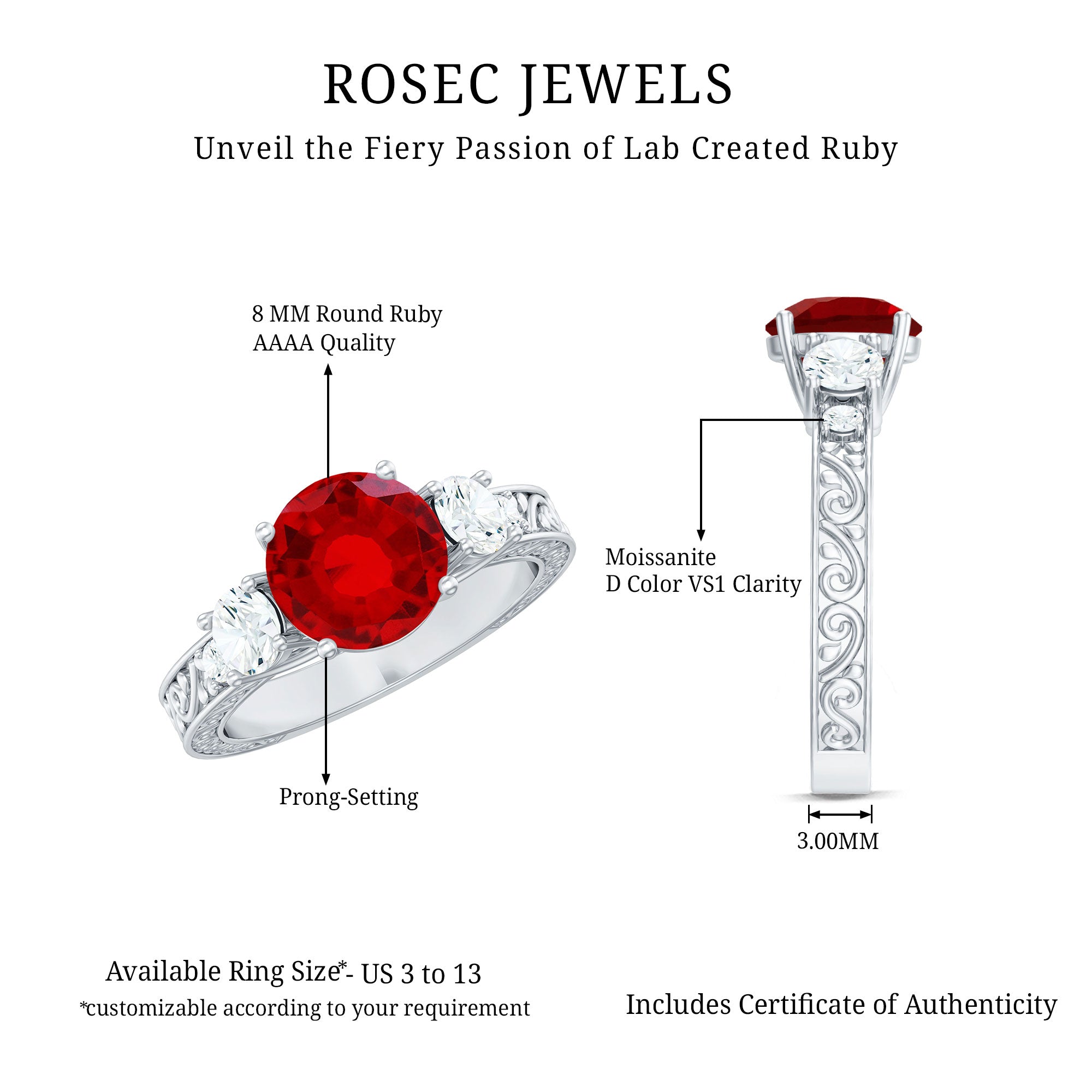 With its graceful trio of stones and intricate detailing, this Lab Grown Ruby Engagement Ring embodies elegance, balance, and lasting love. It is embellished with a radiant 8 MM round cut lab grown ruby, set in prong setting. On either side, sparkling 4 MM round cut moissanite stones add a touch of light and balance and making it a three stone design that symbolizes your past, present, and future together. The carefully engraved band is lined with dainty moissanite stones, adding just the right amount of sparkle and detail. Every curve and design element reflects fine craftsmanship and romantic charm, making this Vintage Ruby Ring truly special. The harmony of the ruby and the bright moissanite creates a stunning contrast that catches the eye and warms the heart. Designed for comfort and elegance, this Three Stone Engagement Ring fits perfectly on the finger and feels as meaningful as it looks. It is a wonderful choice for an engagement, anniversary, or any moment that celebrates love’s journey. This Ruby and Moissanite Ring is a promise beautifully captured in stone, representing the memories you share and the forever you look forward to.