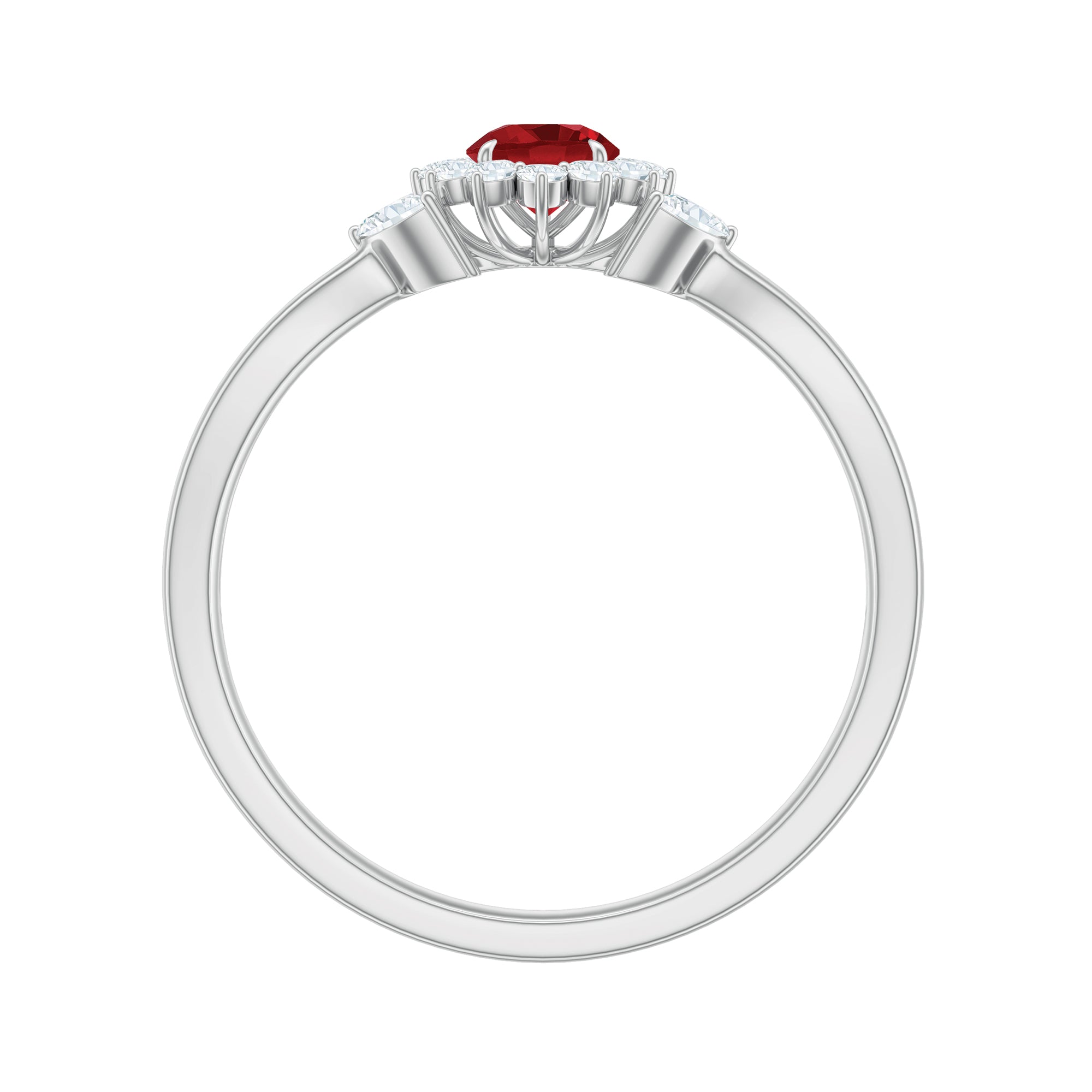 Step into a world of charm and sparkle with this Floral Engagement Ring, a design that feels fresh and romantic. Right in the center sits a 4 MM round lab created ruby, held securely in claw setting and surrounded by a halo of small round diamonds, giving it the shape of a blooming flower that feels elegant and full of meaning. The split shank band brings a modern edge to the floral look, featuring two delicate marquise shaped diamonds on each end, designed to look like tiny leaves. The way the band wraps gently around your finger adds an extra bit of style. This Ruby and Diamond Engagement Ring is the kind of piece that catches the light and attention without needing to shout. This Lab Created Ruby Ring is ideal for someone who wants their jewelry to feel a little different, but still timeless. Whether you are popping the big question or simply want a ring that makes you smile every time you wear it, this one fits right in. The ruby’s red color, combined with the sparkle of diamonds, gives off the perfect mix of bold and graceful. It arrives in a beautiful jewelry box and comes with a certificate of authenticity, so you know you are getting something special. Available in a full range of sizes to help you find that just-right fit.