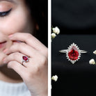 Make a bold and elegant statement with this Lab Grown Ruby Engagement Ring that radiates passion and sophistication. This breathtaking Cocktail Ring features a captivating 7X10 MM pear shaped lab grown ruby of AAAA quality at its center. Surrounding the ruby is a sparkling halo of round cut diamonds, carefully set to enhance its brilliance without overpowering its rich color. Each stone is securely held in prong setting, giving the design both durability and elegance. Adding a unique touch of charm, a princess cut diamond rests gracefully at the base of the halo, blending classic inspiration with a modern design. This thoughtful detail makes the Ruby and Diamond Engagement Ring a perfect choice for those who appreciate the harmony of vintage and contemporary design. The band is sleek and polished, allowing the eye to focus on the stunning centerpiece and the intricate halo work. Crafted with care and available in various sizes, this Pear Shaped Engagement Ring offers comfort, brilliance, and lasting style. Whether chosen as a gift or a personal treasure, this Big Ruby Ring is perfect for anyone who loves jewelry that speaks from the heart.