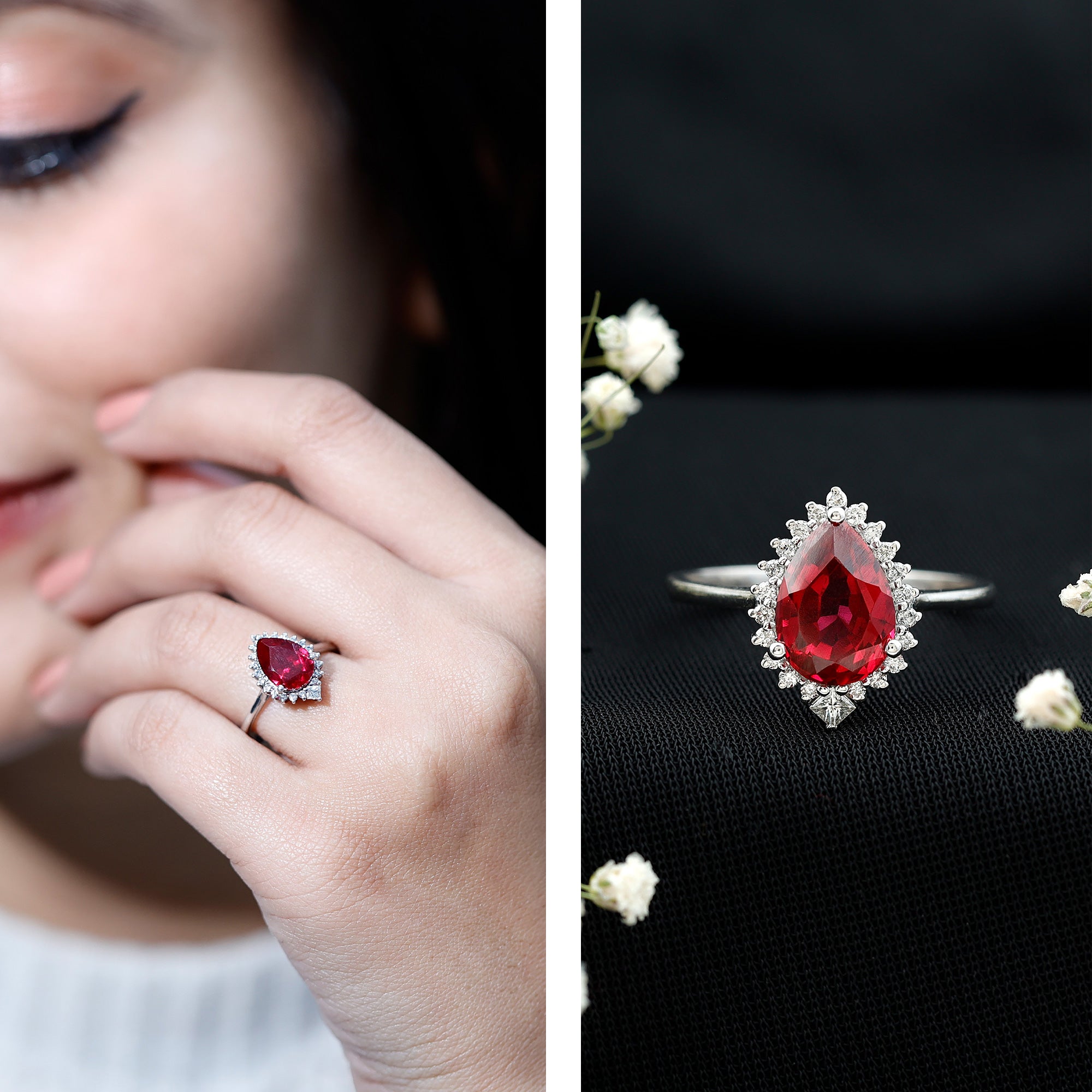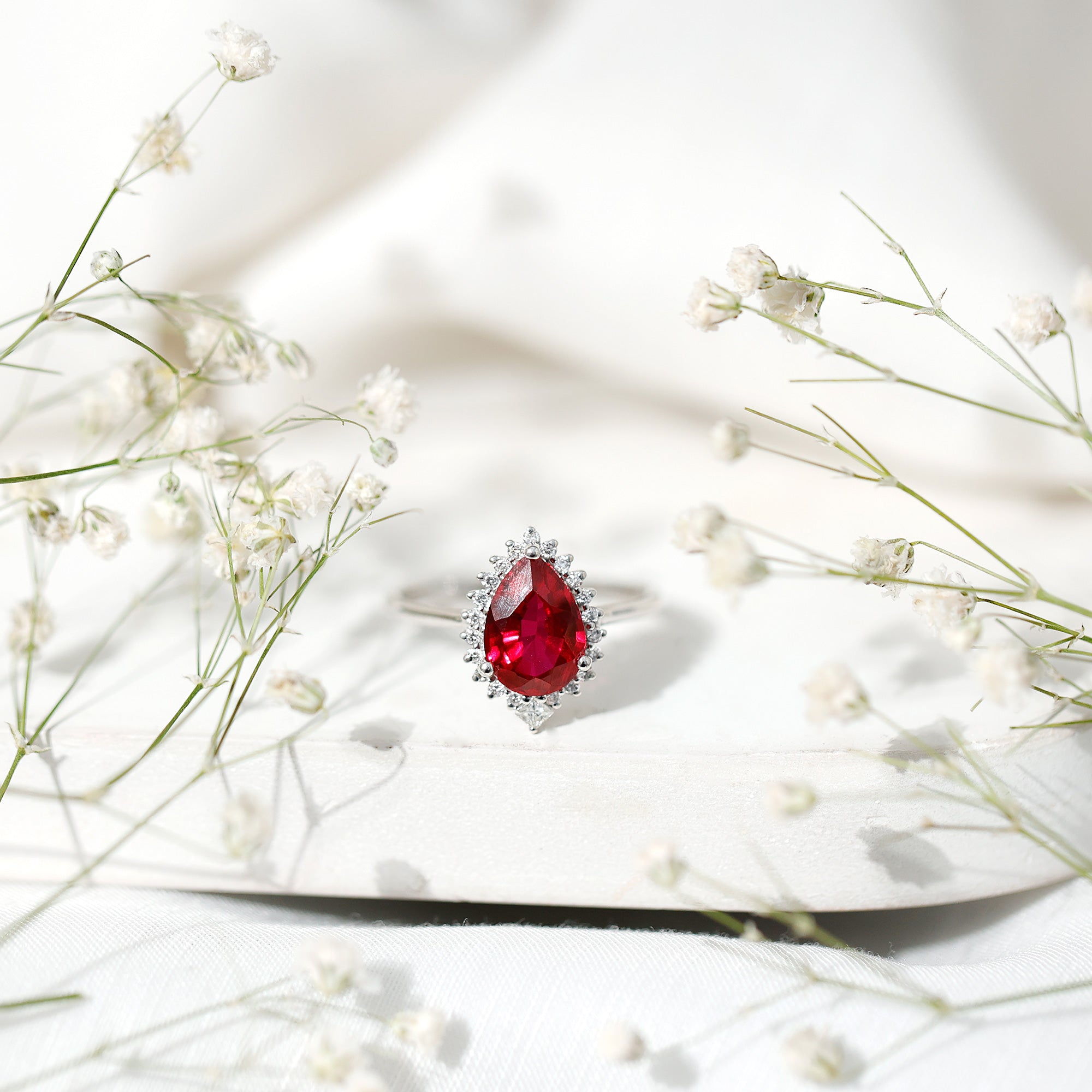 Lab Ruby Teardrop Engagement Ring with Diamond Halo
