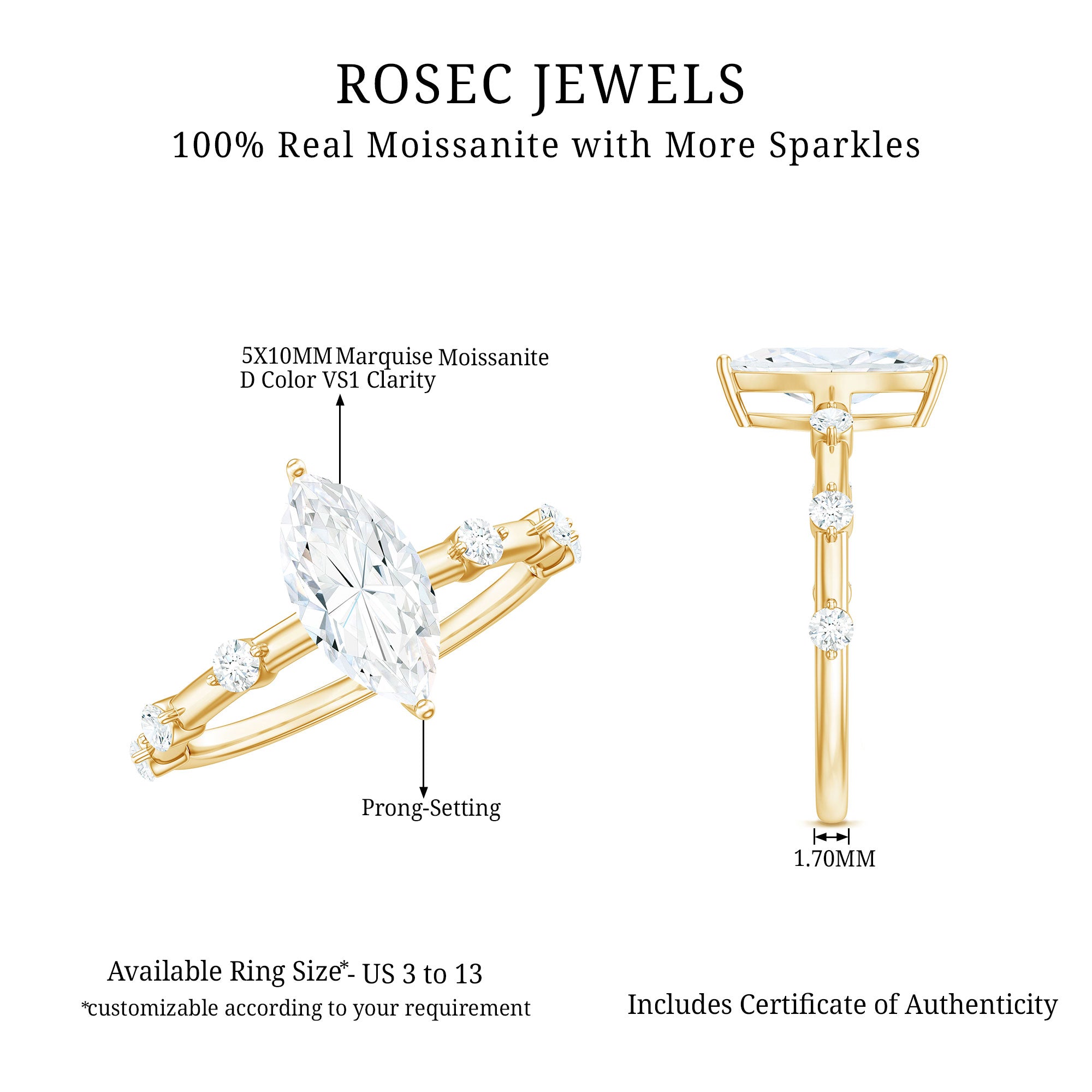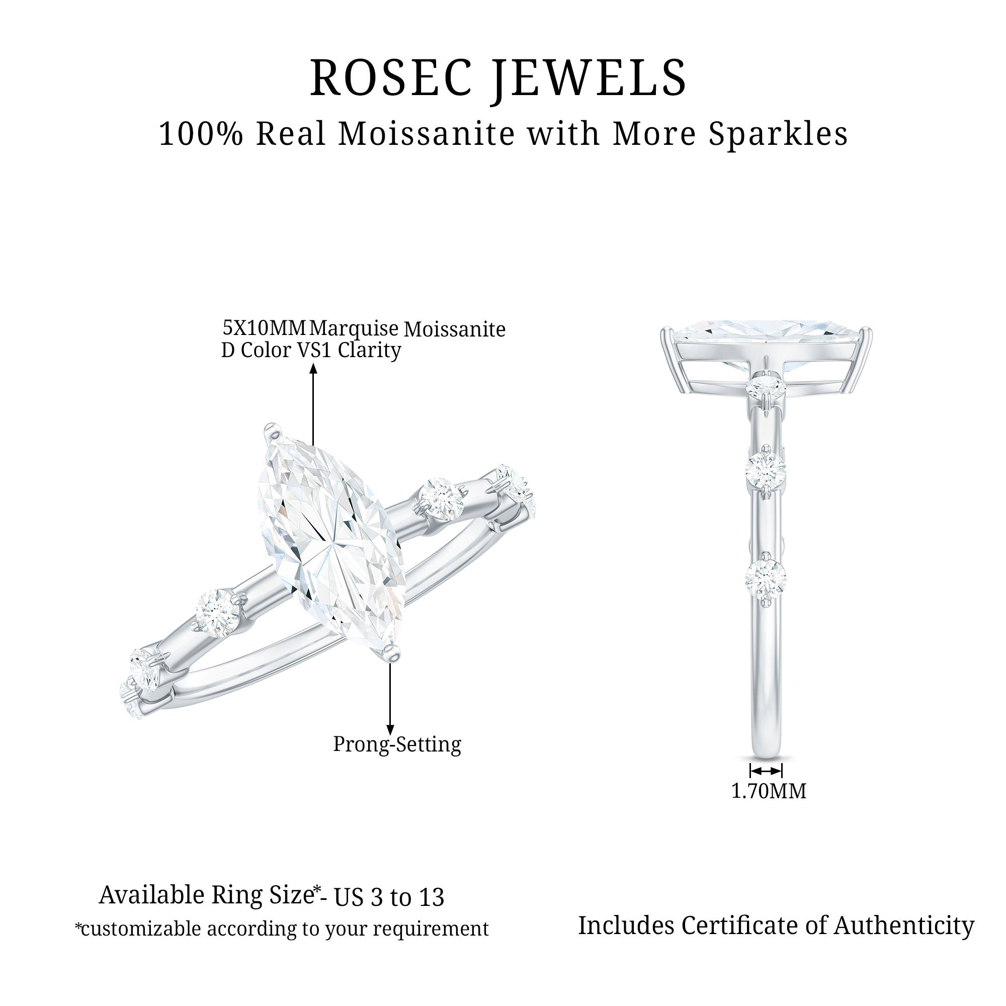 This charming Moissanite Engagement Ring is a perfect blend of vintage elegance and modern simplicity. The 5X10 MM Marquise Cut Moissanite at the center, flanked by Round Moissanite side stones set in spaced accent setting on the shank, creates a sophisticated and timeless look. Your bride-to-be will be unable to resist this Moissanite Solitaire Engagement Ring, with its sweet and feminine design. The delicate harmony between the striking center and the understated sparkle of the side stones forms a style that is both classic and distinctive. This Marquise Engagement Ring serves as a perfect emblem of love and dedication, designed to radiate as brilliantly as the bond it symbolizes. Elegantly presented in a jewelry box, this ring is prepared to be given as a gift or cherished as a memento. With its modern features and enduring brilliance, this Marquise Moissanite Ring for Women offers a new perspective on timeless romance, perfect for someone who appreciates tradition with a hint of uniqueness.