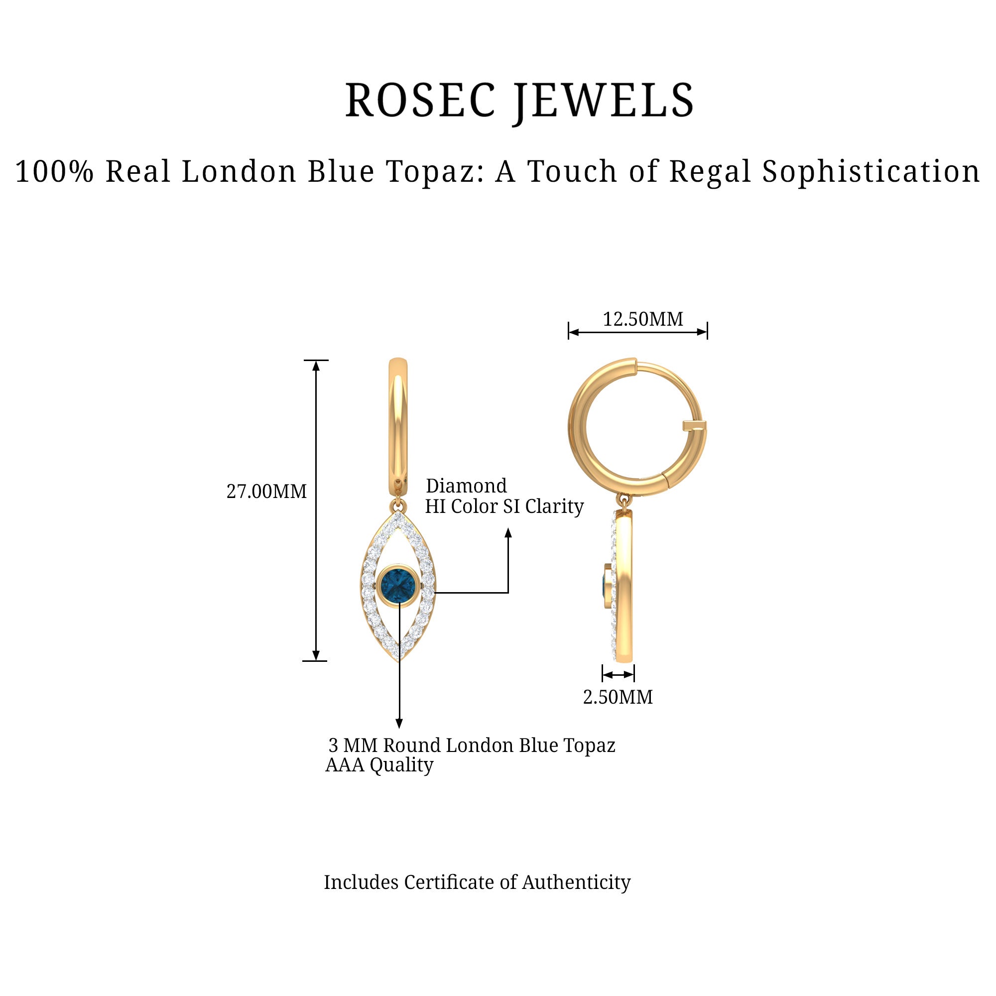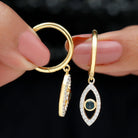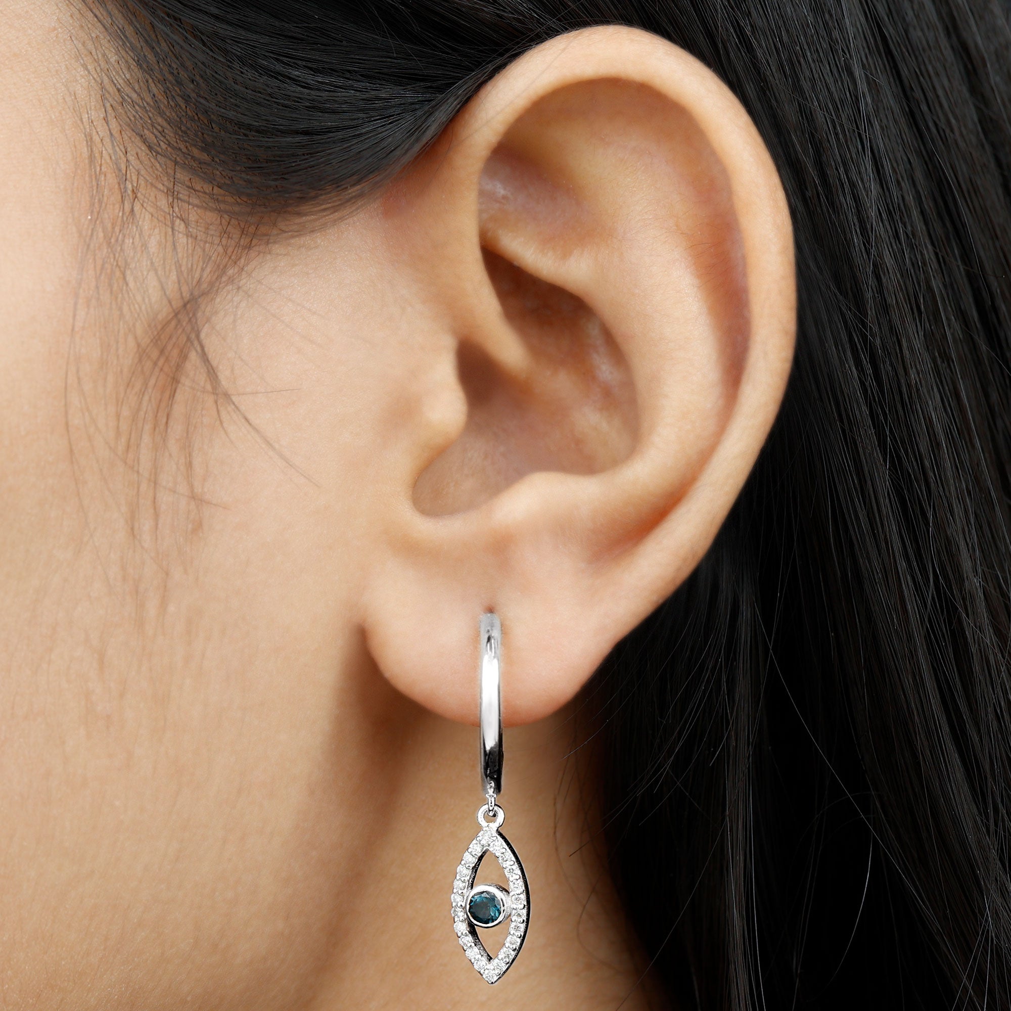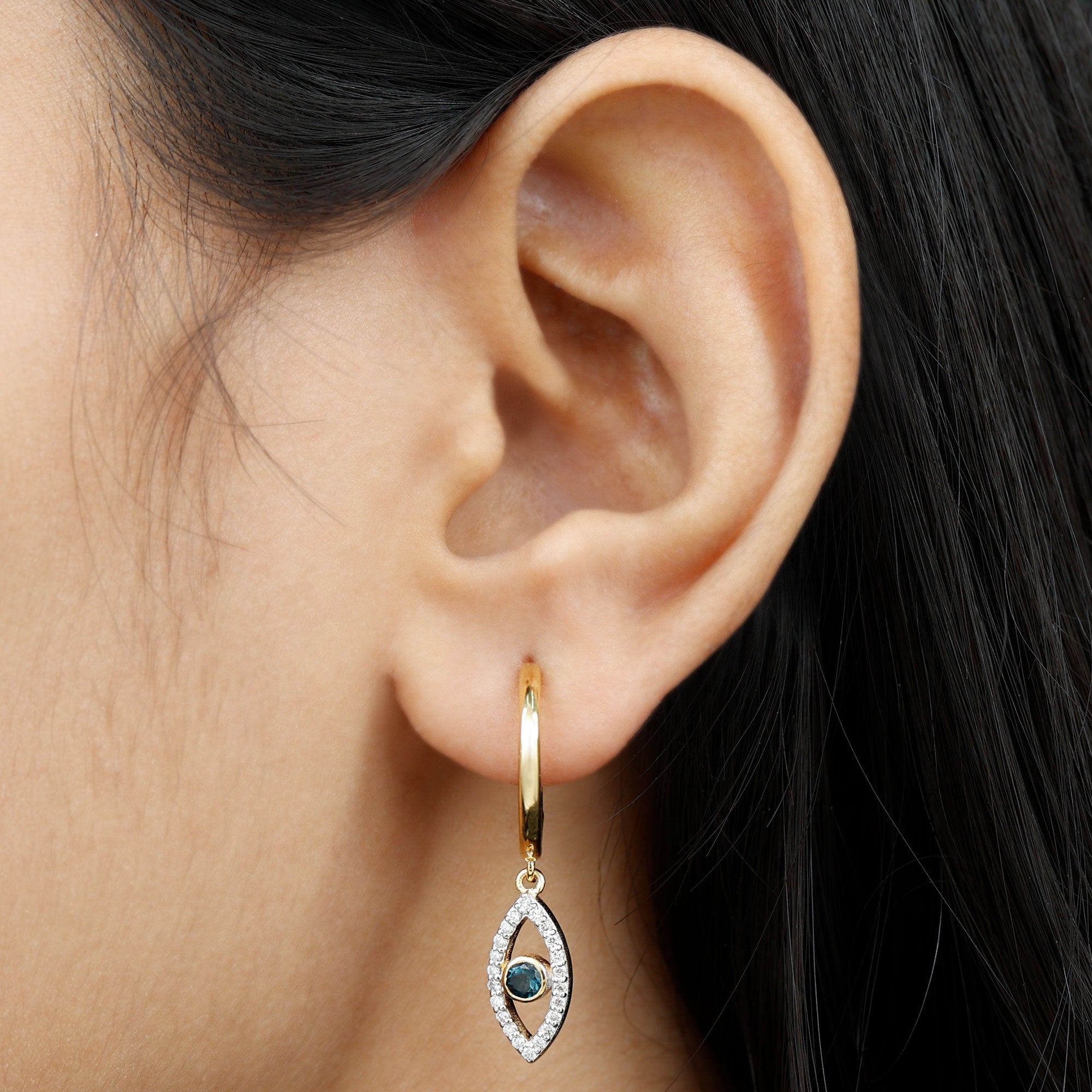 Get ready to turn heads with our stunning Evil Eye Drop Earrings, featuring a unique design that is sure to catch the eye. The Evil Eye charm hangs delicately from a hoop and is adorned with a Round Shape London Blue Topaz in a Bezel Setting, while Round Shape Diamond stones are beautifully studded on the Pave Setting. These earrings are both unique and eye-catching, making them the perfect accessory to add a touch of glamour to any outfit.