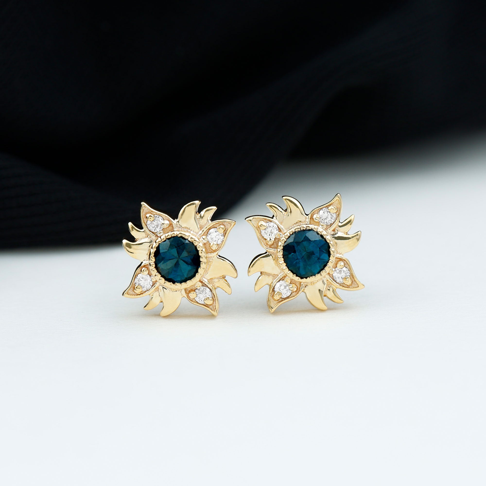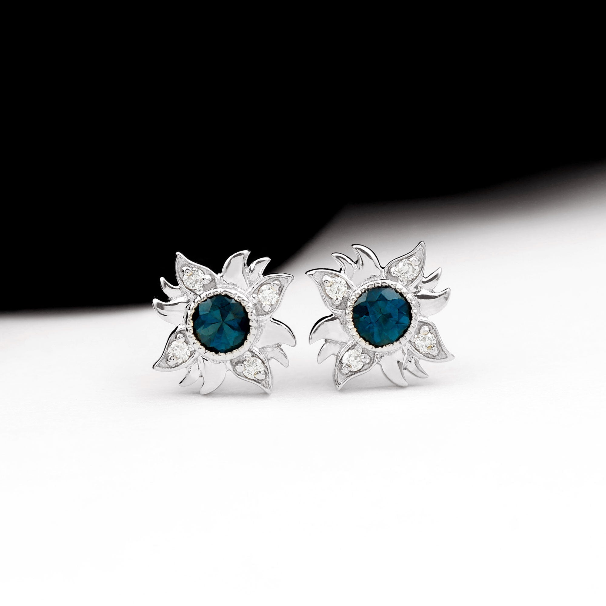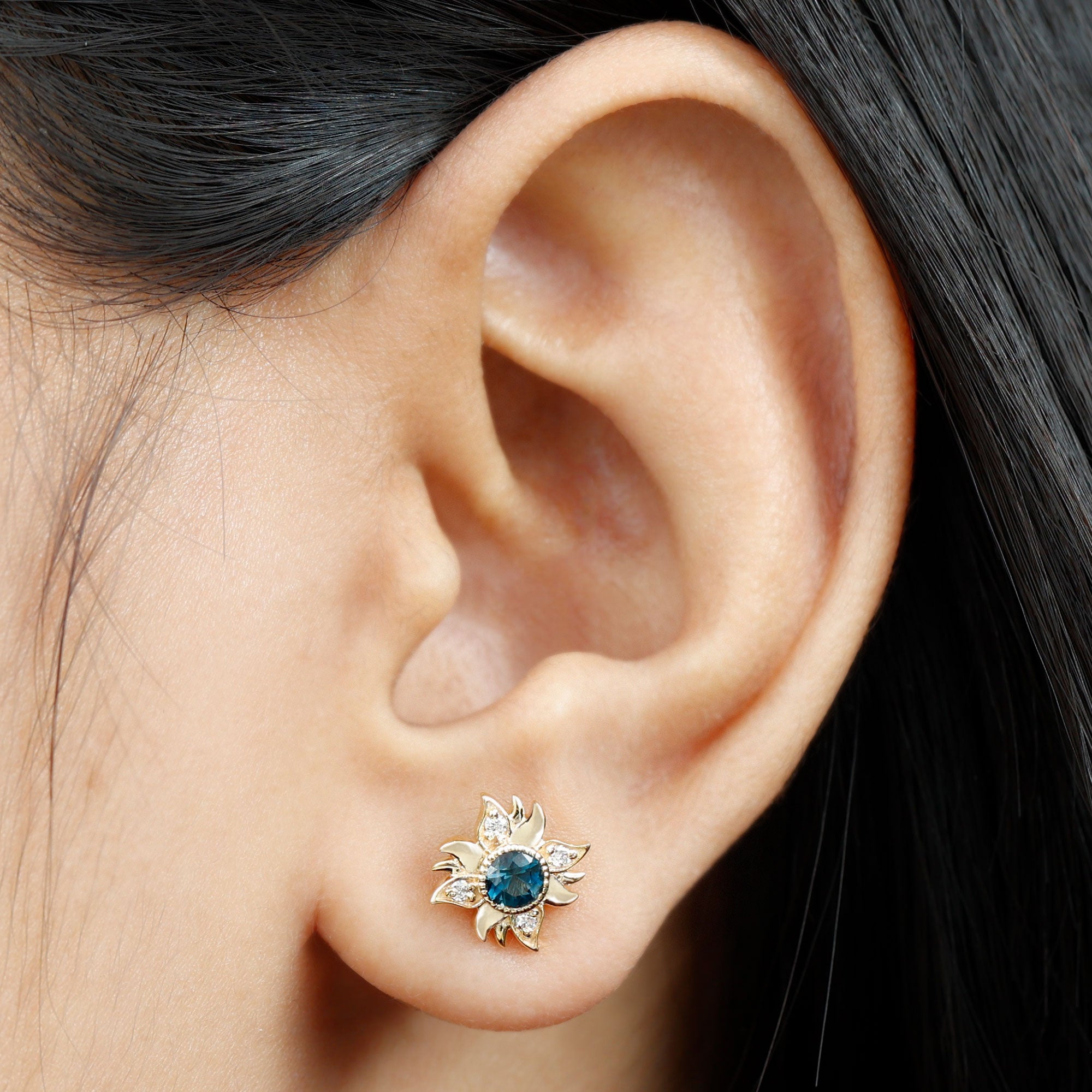 Radiating brilliance with every turn, these Sunburst Stud Earrings bring a refreshing splash of color and light to your jewelry collection. Embellished with a mesmerizing 5 MM round London Blue Topaz, securely cradled in a beautifully textured beaded bezel setting. Extending from the center stone are delicate sunrays, adorned with sparkling round diamonds that add a shimmering burst of energy. Designed to balance sophistication and charm, these Blue Topaz and Diamond Earrings are versatile enough for daily wear while still classy enough to complement special-occasion looks. The screw back closure ensures reliability and comfort, offering a secure fit that you can trust from day to night. Whether you are looking to elevate a simple outfit or add a chic finishing touch to a dressier ensemble, these London Blue Topaz Earrings deliver an unforgettable sparkle. Gift them to someone who shines brightly in your life, or treat yourself to a pair that captures the essence of light, style, and effortless beauty.