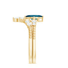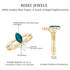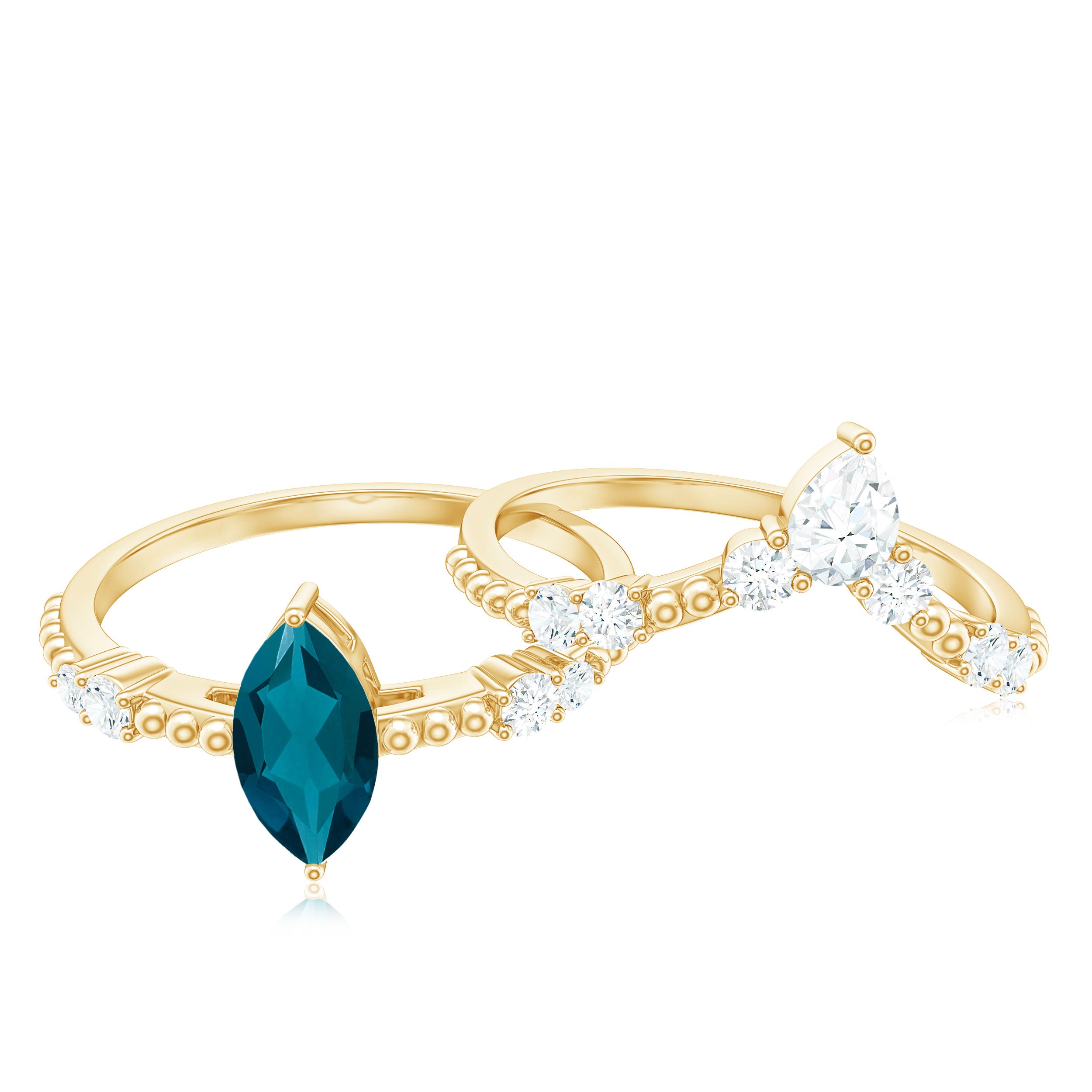 This Blue Topaz Engagement Ring Set is an ideal choice for your most treasured moments, seamlessly combining vintage allure with contemporary brilliance in a breathtaking design. At its core is a 4X8 MM marquise cut London Blue Topaz, securely held in prongs, shank is adorned with round diamond stones and intricate beaded detailing, producing a captivating sparkle that refracts light from every angle. The engagement ring is accompanied by a matching curved wedding band that fits flawlessly around the center stone. Featuring round and pear cut Diamonds along with delicate beaded detailing on the band, it introduces a charming and timeless touch. Whether worn as a Vintage Bridal Set or individually, these rings offer styling flexibility, making them perfect to adorn on special occasions. Thoughtfully crafted for both aesthetics and comfort, this Marquise Wedding Ring Set represents love and is designed to last. Each glance at it serves as a reminder of your unique narrative, romantic, sparkling, and distinctly yours. Ideal for anyone in search of a ring that is timeless, intricately detailed, and effortlessly elegant.