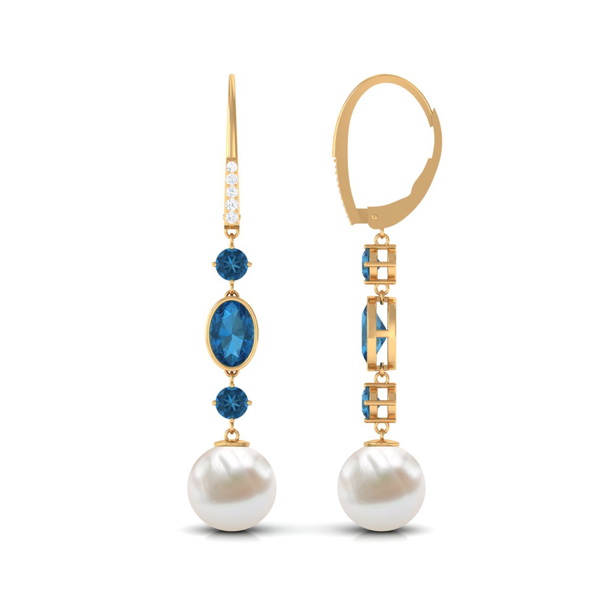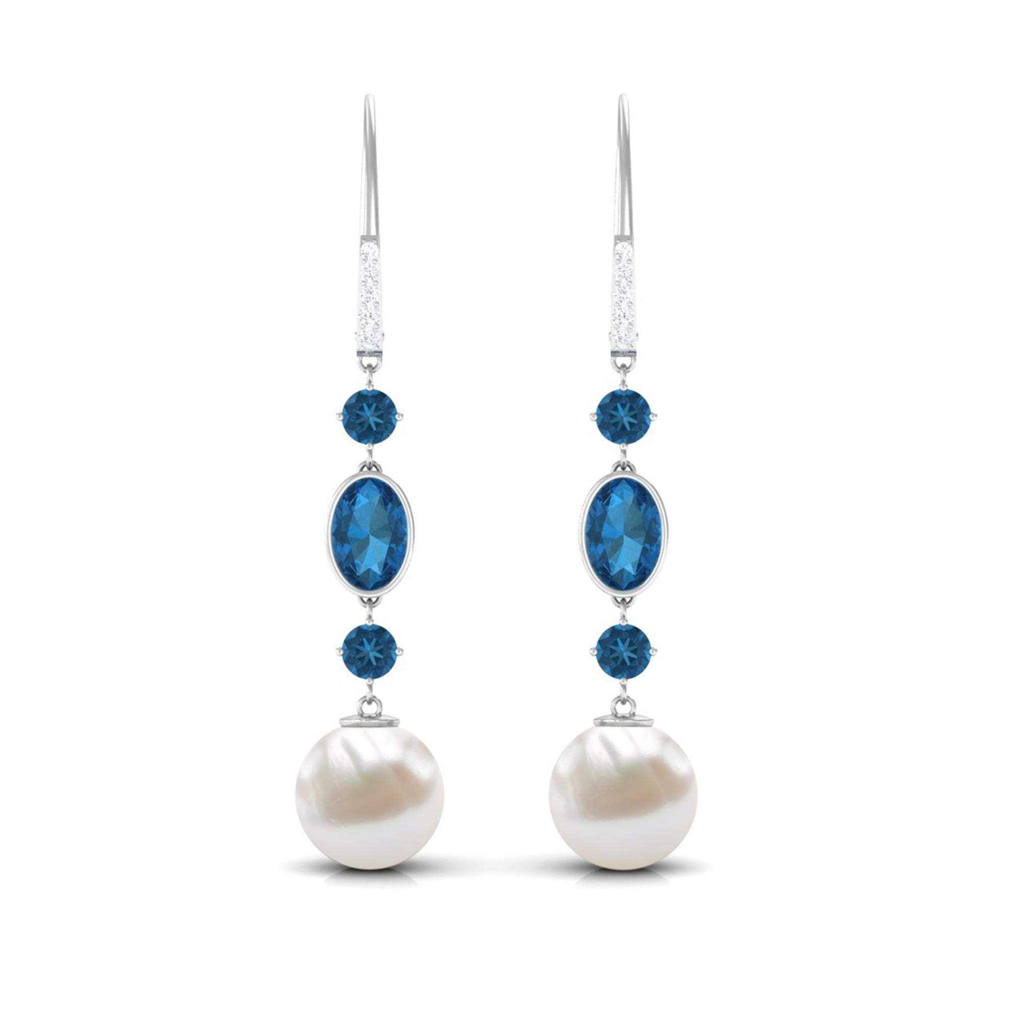 London Blue Topaz and Freshwater Pearl Dangle Earrings with Moissanite