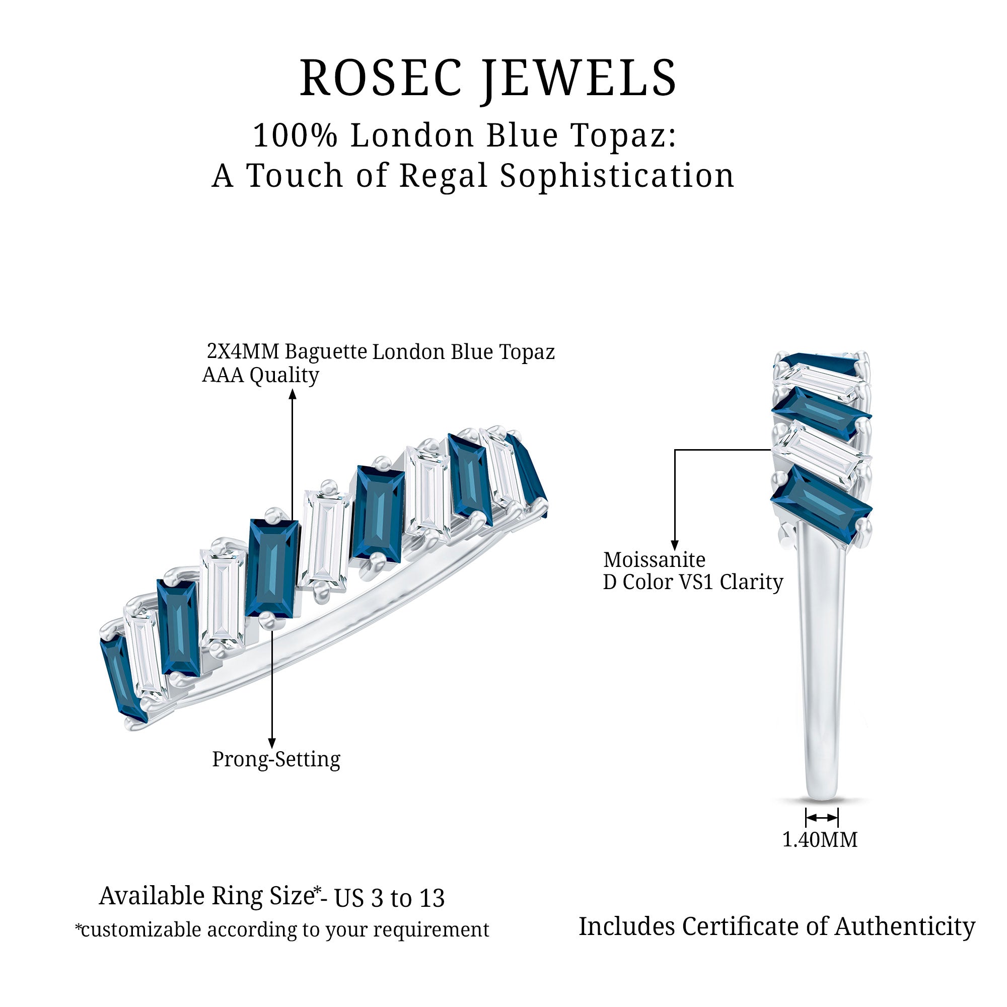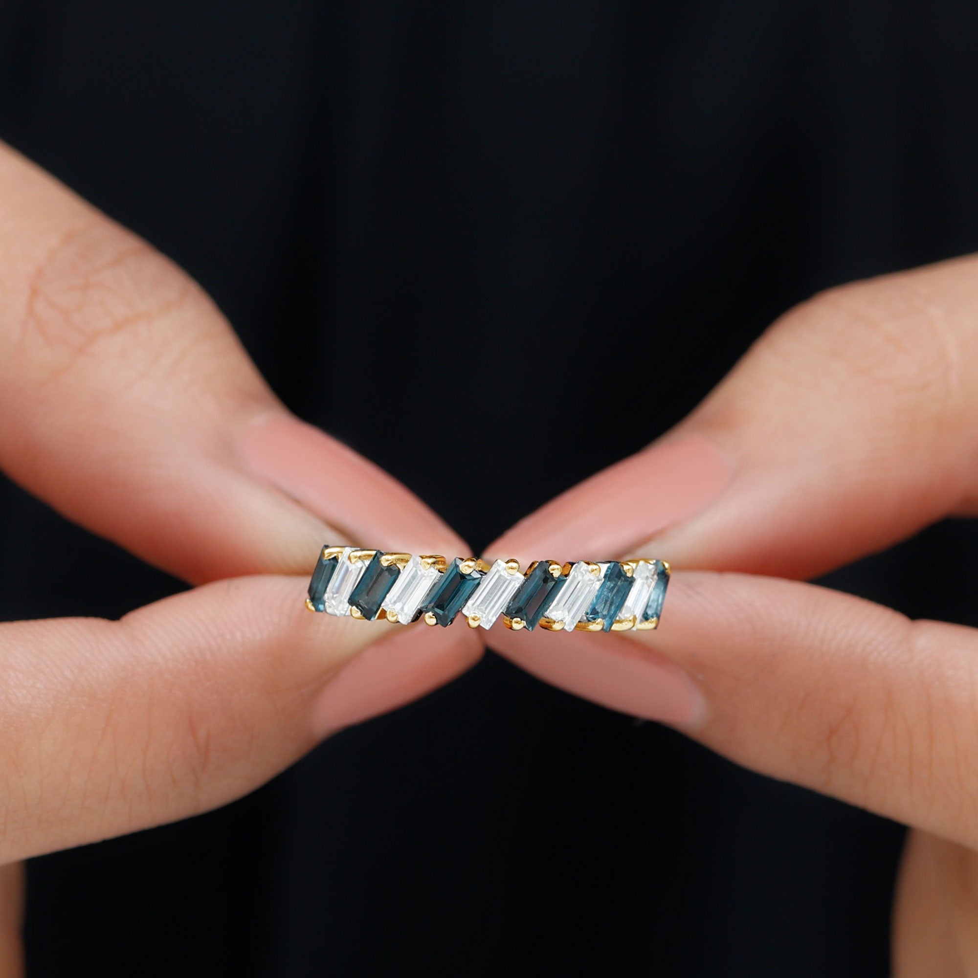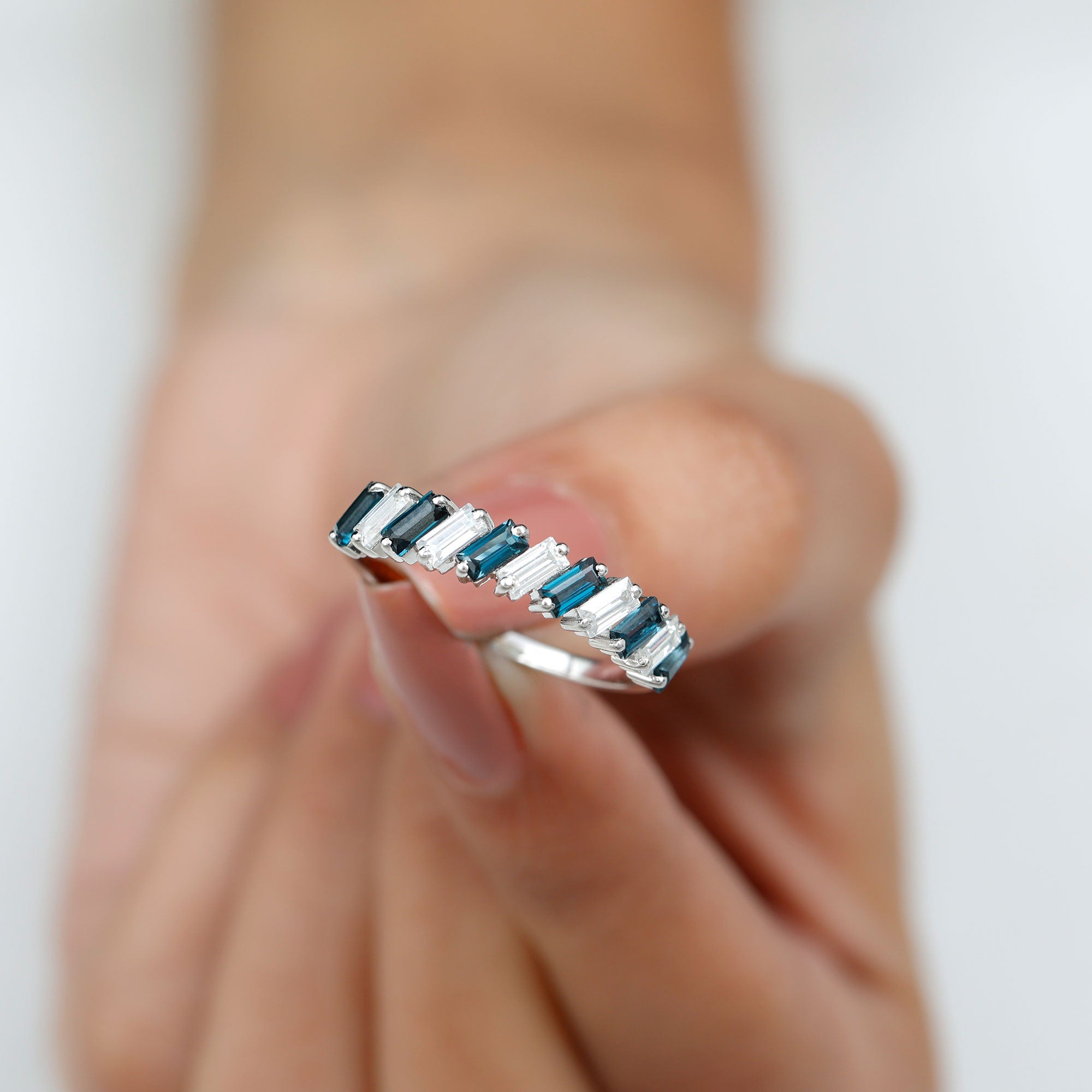 Exuding understated elegance, this London Blue Topaz Ring represents the ultimate declaration of love with its simple yet stylish design. The Baguette Shape London Blue Topaz, set in 2 prong setting alongside Moissanite as a Half Eternity Ring, signifies eternal love, artfully arranged in a tilted orientation. Its adaptable design renders it a refined piece of jewelry for your significant other. Serving as a representation of lasting love and romantic gestures, this Eternity Band for Women boasts unparalleled brilliance and sparkle, meticulously crafted to enhance the allure of each stone. It can be paired with other wedding bands or worn alone for a minimalist aesthetic. Its elegant design symbolizes everlasting love, making it an essential addition to any jewelry collection. Create unforgettable moments with this exquisitely designed Real Blue Topaz Eternity Ring. Its elegant design and striking hue make this Blue Topaz Wedding Band a distinctive addition to your most cherished occasions. This design is both straightforward and visually appealing, ideal for those who appreciate a classic aesthetic with a touch of boldness. Perfect for commemorating love, commitment, or personal achievements, this Eternity Stackable Ring serves as a considerate gift for birthdays, anniversaries, or simply as a thoughtful gesture. As the birthstone for December, london blue topaz also represents a significant gift for individuals born in that month. Whether worn alone or combined with other rings, this half eternity band provides both versatility and enduring style. The comfortable fit and polished finish ensure it can be worn daily. Made with AAA quality london blue topaz and premium metal, this Wedding Anniversary Ring is designed to endure and shine through every phase of life.