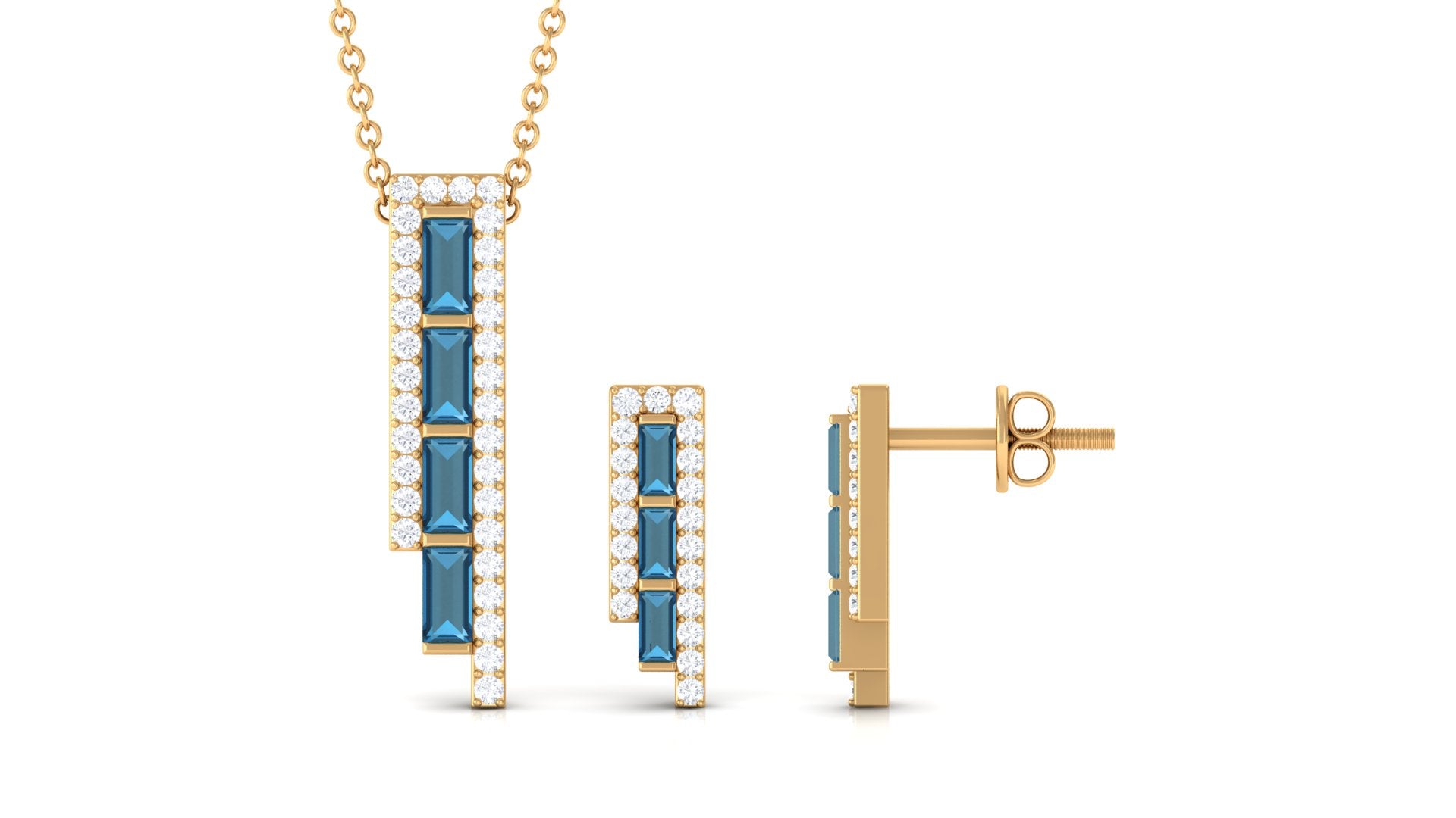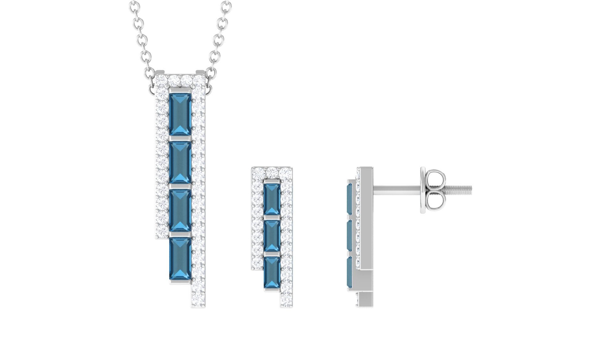 The beautiful hue of this jewelry set makes it one-of-a-kind jewelry embellished with baguette london blue topaz and diamond evoking timeless elegance. Steal the spotlight wherever you go with the charming allure of these genuine gemstones. Pamper your better half on this anniversary by giving this blue topaz jewelry and make that day memorable for her.