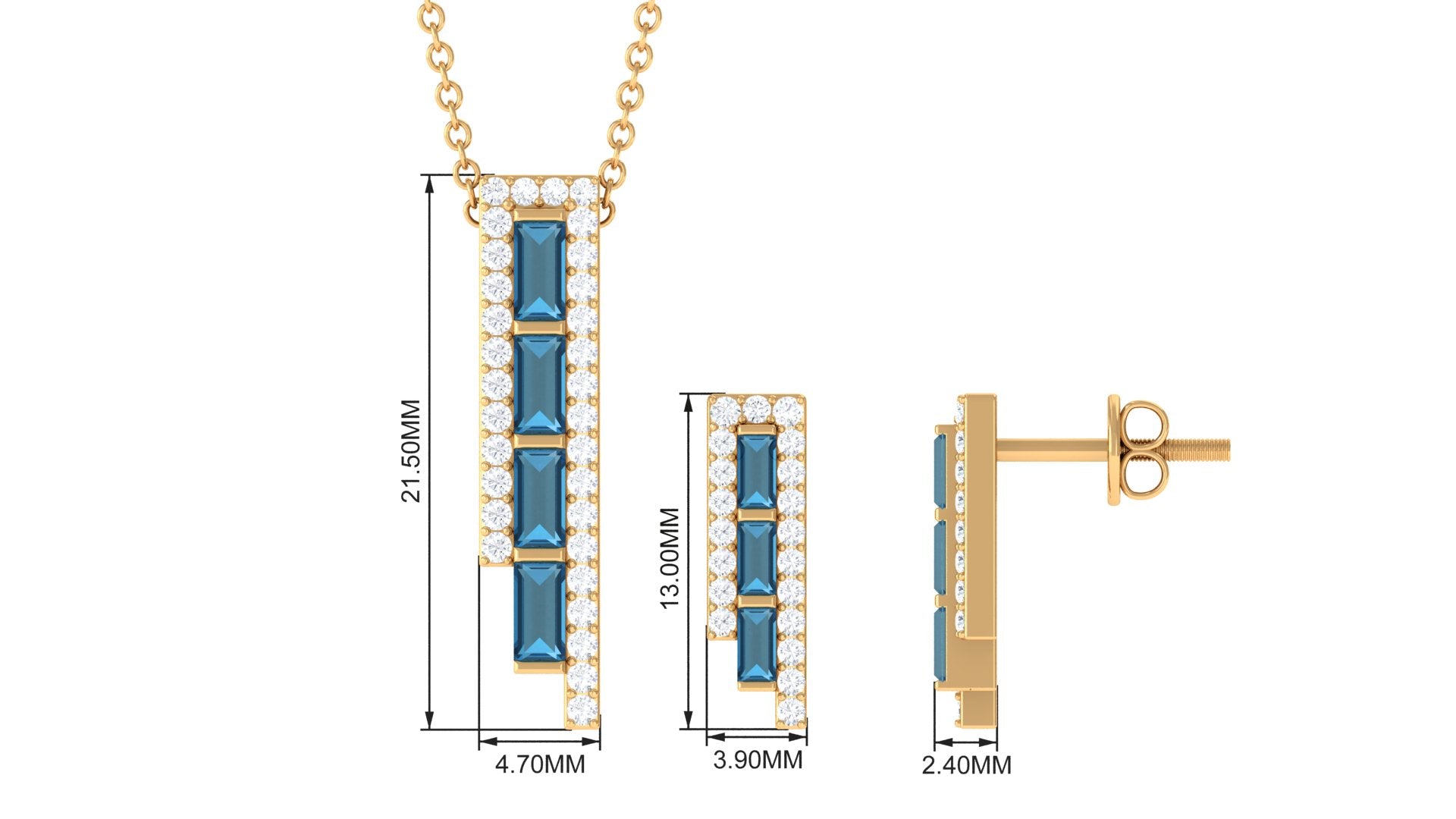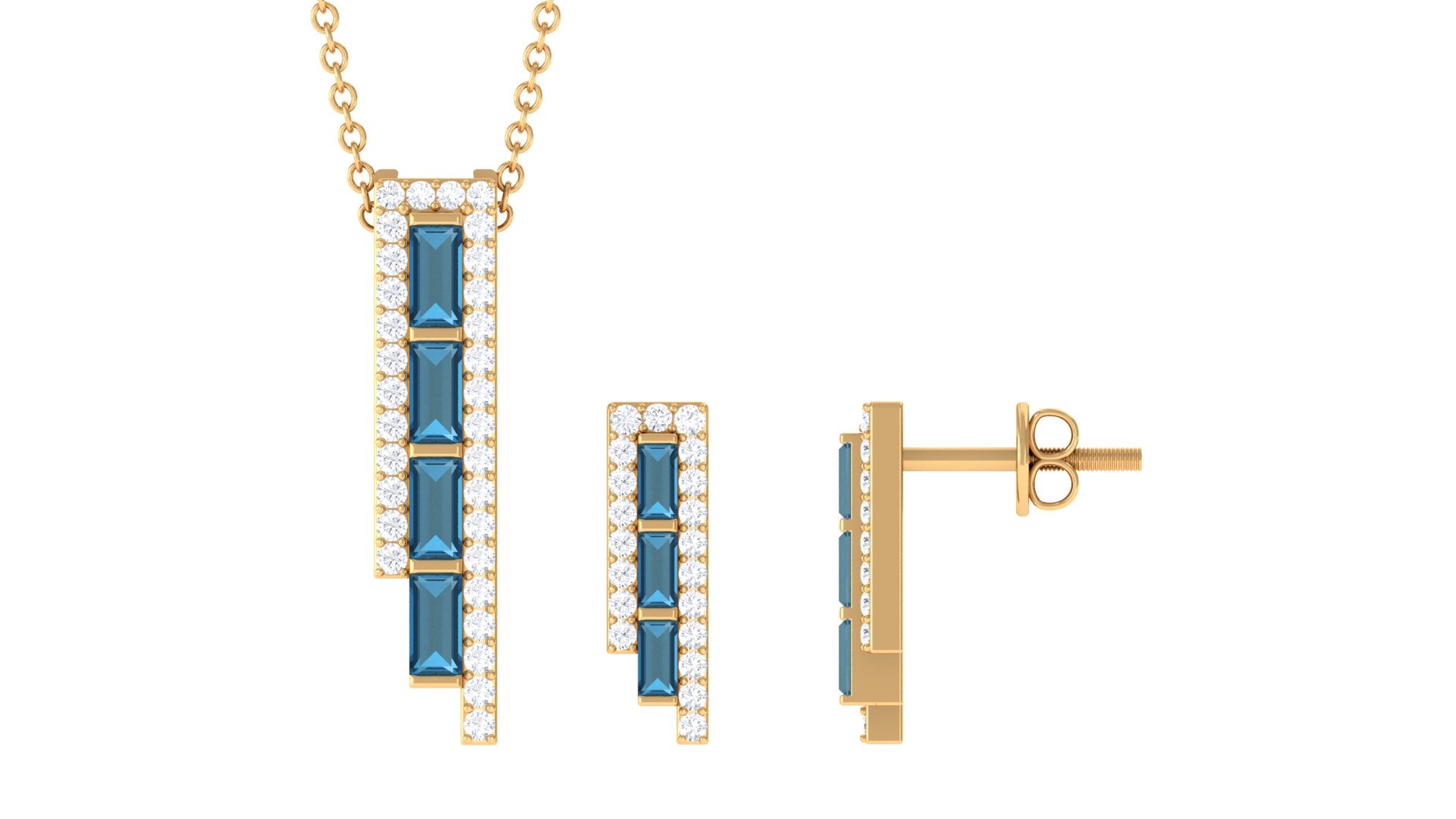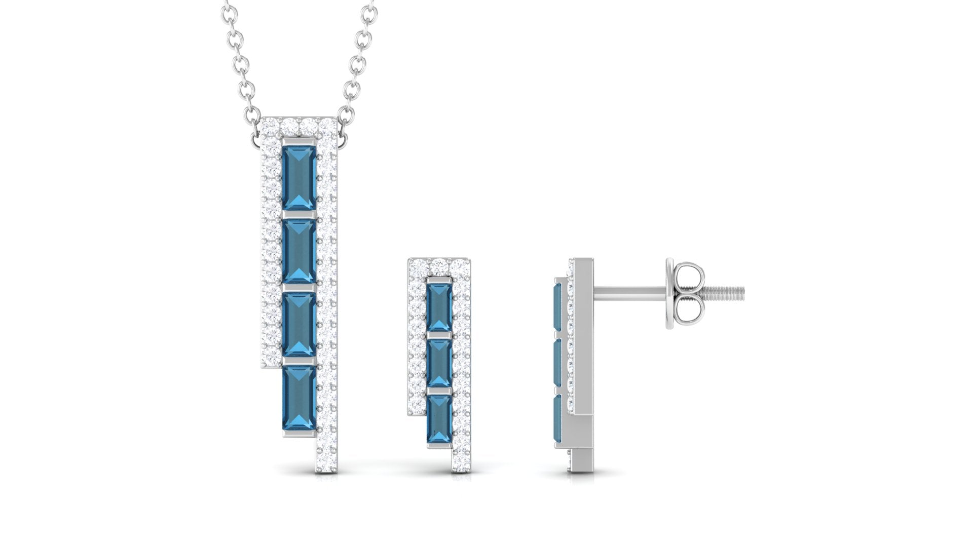 The beautiful hue of this jewelry set makes it one-of-a-kind jewelry embellished with baguette london blue topaz and diamond evoking timeless elegance. Steal the spotlight wherever you go with the charming allure of these genuine gemstones. Pamper your better half on this anniversary by giving this blue topaz jewelry and make that day memorable for her.
