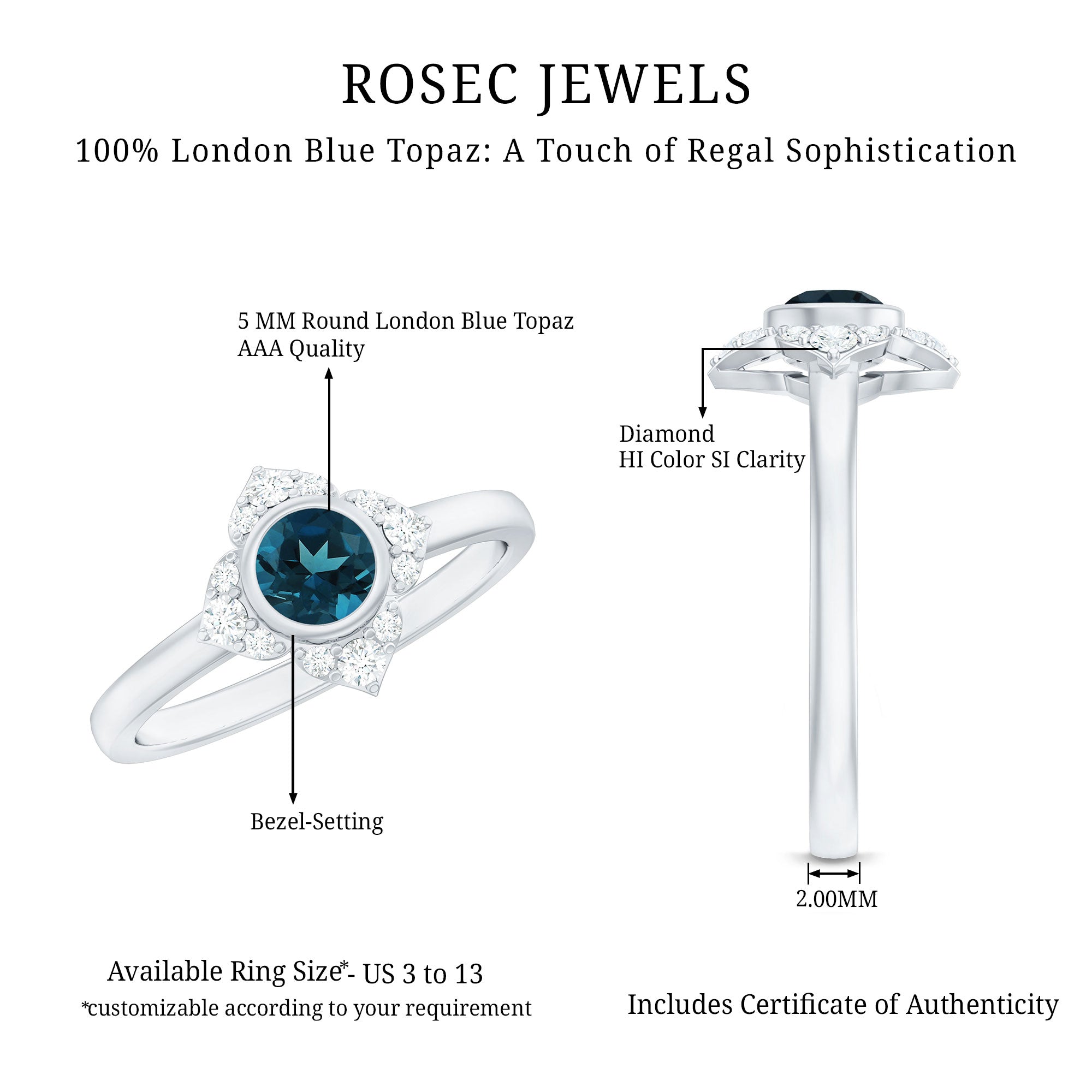 Make a striking impression with our London Blue Topaz Engagement Ring, which combines timeless beauty with a hint of sparkling enchantment. At the heart of this sophisticated Halo Engagement Ring lies an 5 MM round cut London Blue Topaz, securely held in bezel setting. Encircling the blue topaz is a stunning halo composed of alternating small and petite diamonds, meticulously arranged to create a floral petals look that captures light from every direction. The combination of the AAA quality London blue topaz and the shimmering HI-SI quality diamonds imparts the Classic Engagement Ring with a look that is both timeless and captivating, ideal for someone who appreciates understated elegance with a dash of flair. Whether intended for a proposal, an anniversary, or simply as a meaningful gift, this Natural London Blue Topaz Ring expresses love in a manner that is both fashionable and considerate. With its enduring design and exquisite details, this Blue Topaz and Diamond Ring is an excellent choice for anyone seeking a piece that feels extraordinary. It is designed to be worn daily or reserved for significant occasions, serving as symbol of affection that remains perpetually in vogue.