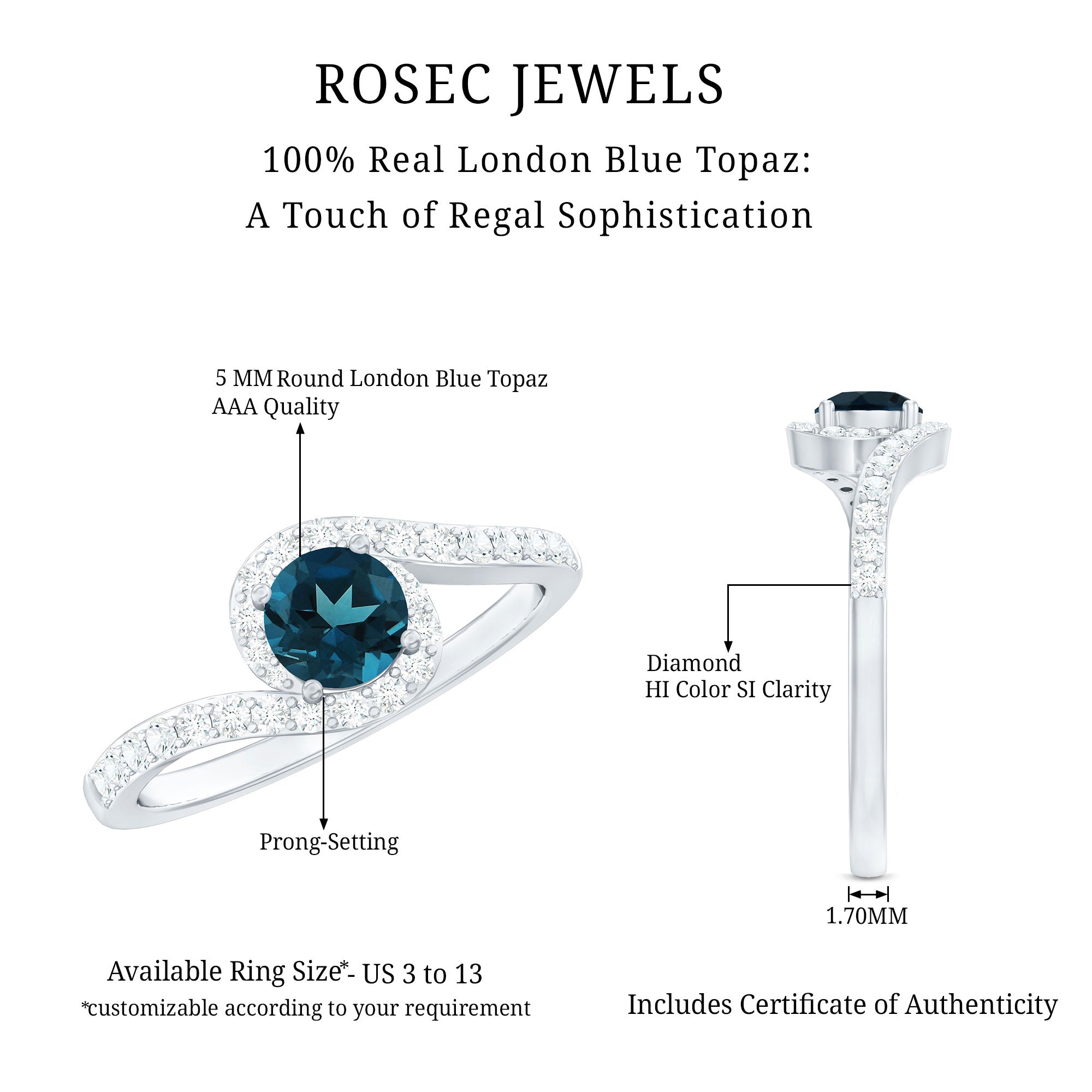 An ideal choice for those who embrace love with a contemporary flair. This London Blue Topaz Promise Ring features a stunning 5 MM Round Shape London Blue Topaz, elegantly set in a Prong Setting on a sleek bypass band. Both side of the band is adorned with delicate, shimmering Diamond stones that contribute the perfect touch of sophistication. The graceful curves of the band surrounded the central Blue Topaz, creating a design that symbolizes connection, harmony, and the journey of love. The distinctive halo design of this Bypass Shank Ring provides a fresh, modern aesthetic while maintaining an effortlessly romantic essence. Presented in a beautiful jewelry box, this Blue Topaz and Diamond Ring is ready to capture hearts during special moments such as proposals, anniversaries, birthdays, or those memorable occasions. Offered in a wide array of US sizes ranging from 3 to 13, this Womens Promise Ring is crafted to fit comfortably and look exquisite on any hand. Designed for dreamers, lovers, and adventurous souls, this London Blue Topaz Ring not only dazzles but also makes a bold statement.
