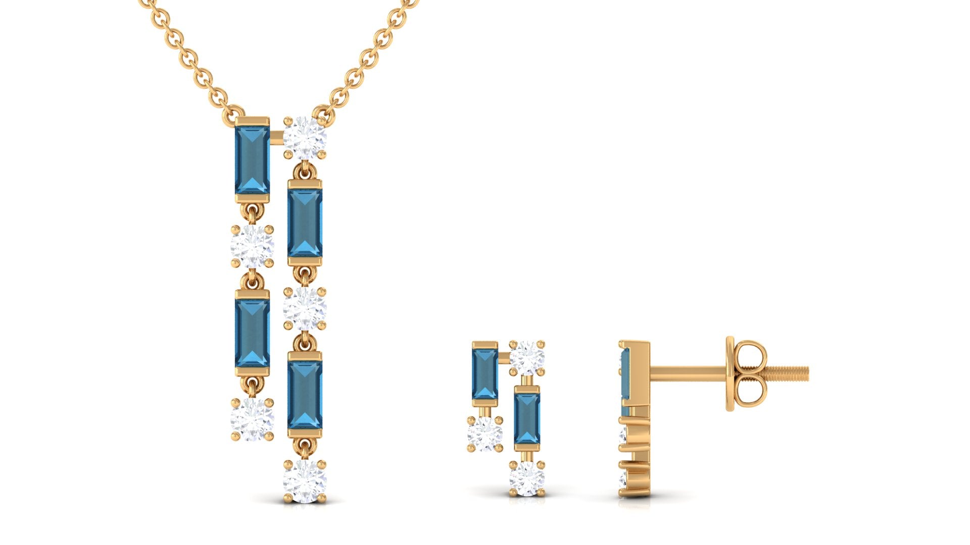 The effortless and stylish design of this jewelry set makes it a versatile accessory that can be worn with any style. Feature a necklace and earrings set embellished with baguette shape london blue topaz and round diamond to add sophistication and class. This blue topaz jewelry will be an elegant gift for occasions like anniversaries, birthdays, or other special occasions.