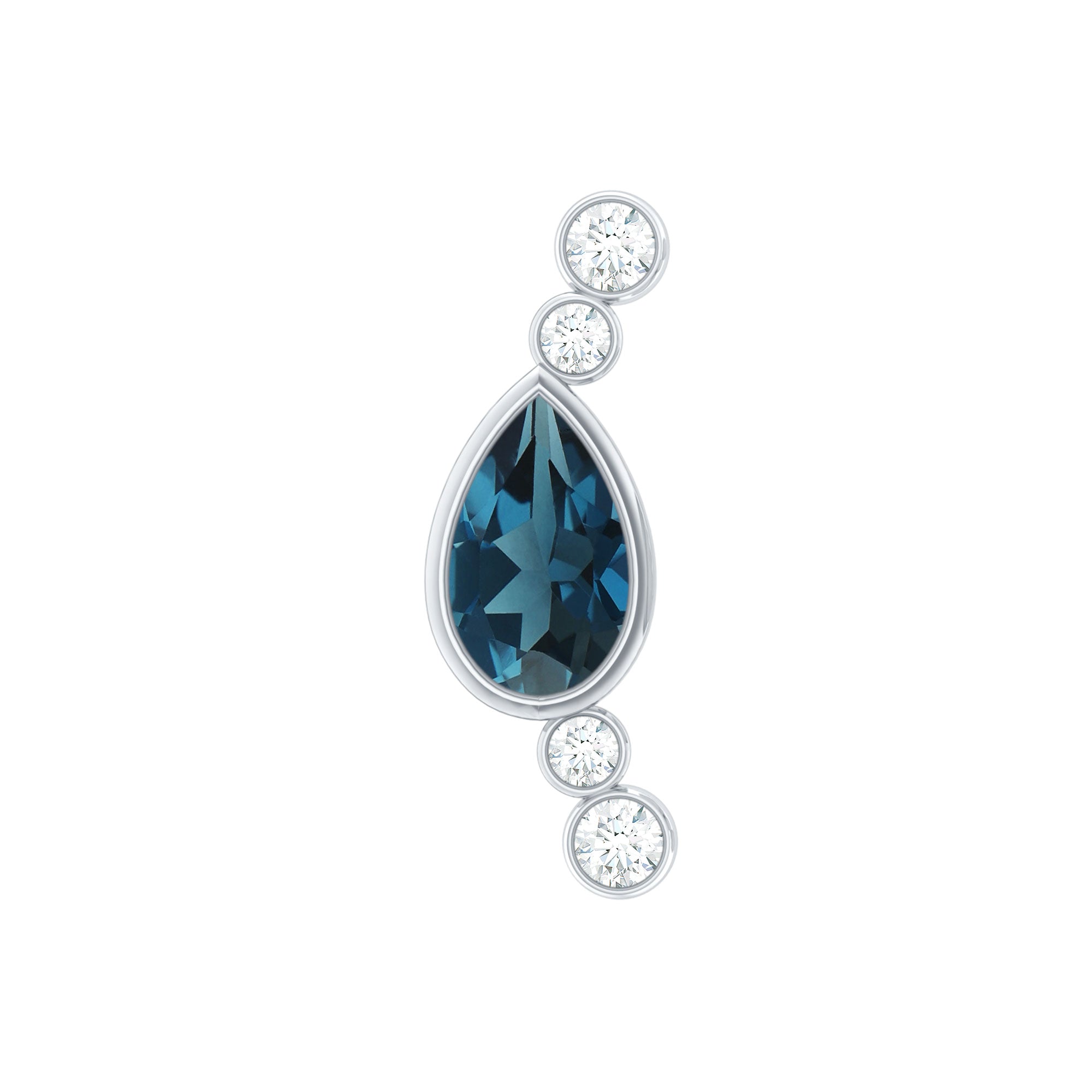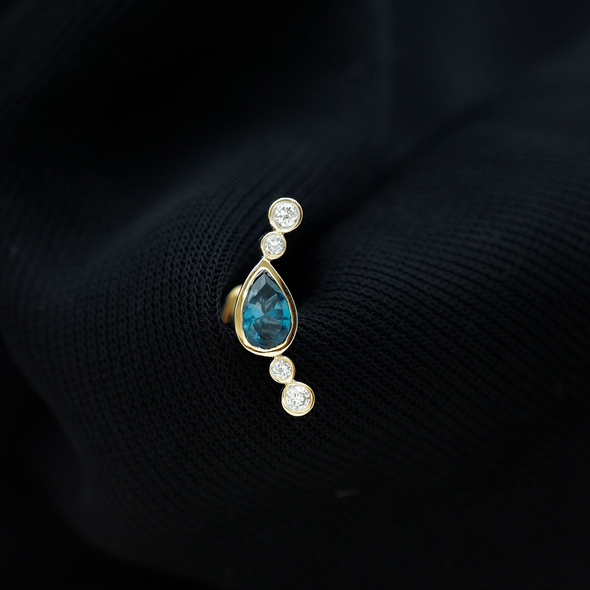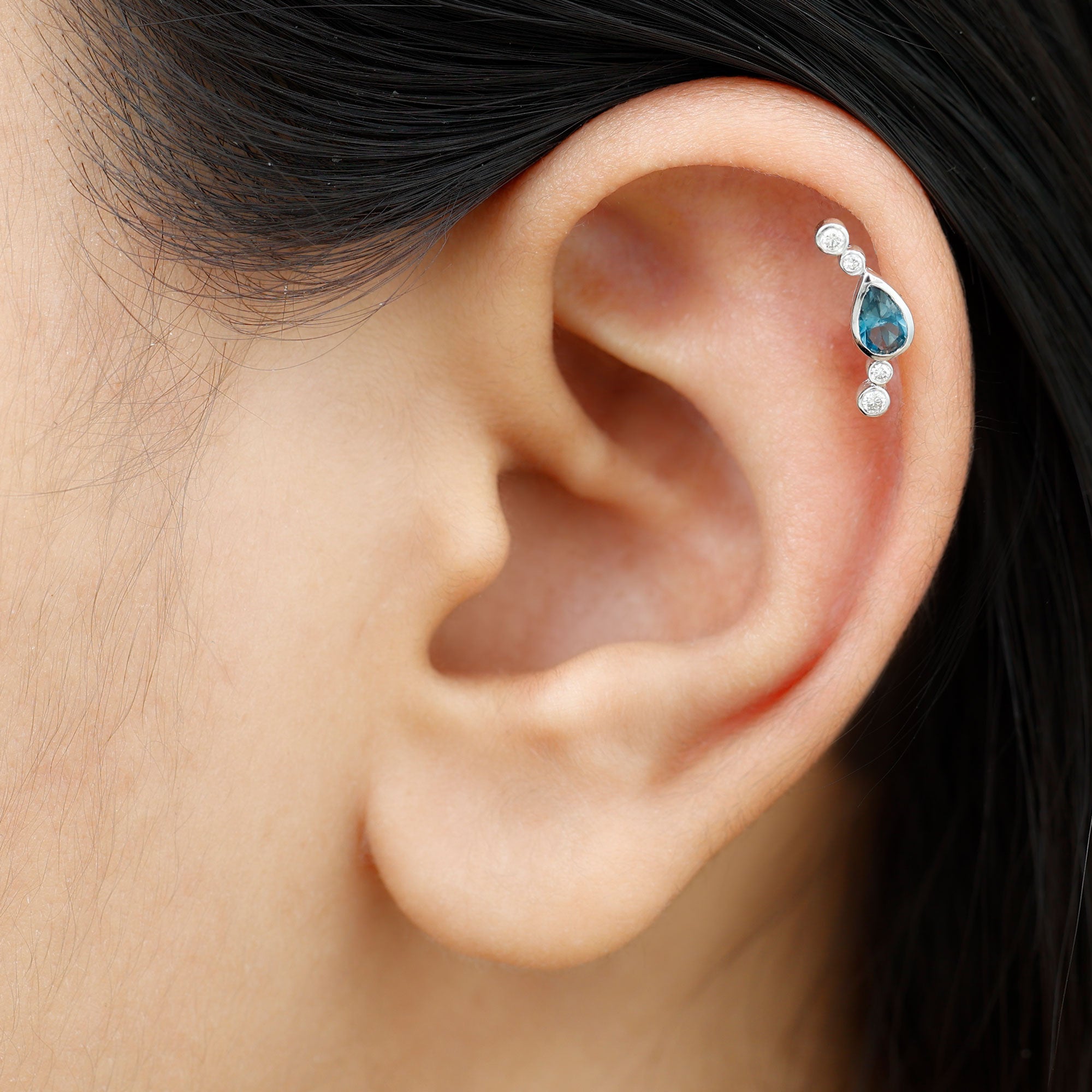 A small touch of color can change your whole look, and this London Blue Topaz Crawler Earring brings that soft spark in the most effortless way. Designed to follow the natural curve of your ear, it creates a gentle line of shine that feels modern and stylish. At the center of the design sits a 3X5 MM pear shaped London Blue Topaz. The stone is placed in a secure bezel setting, giving it a sleek and polished finish while keeping it safe for daily wear. Alongside the topaz are tiny round diamonds that add a bright shimmer. Together, the blue and white stones create a simple yet eye-catching contrast that works for many styles. This Blue Topaz and Diamond Earring is made to fit different piercings, including the helix, cartilage, and upper lobe. Its curved shape rests comfortably on the ear, making it easy to wear for long hours. The design is subtle enough for everyday outfits but elegant enough to pair with dressier looks. Perfect for gifting or treating yourself, this Ear Climber Earring is a simple and graceful piece that brings a hint of color, shine, and personality to any day.