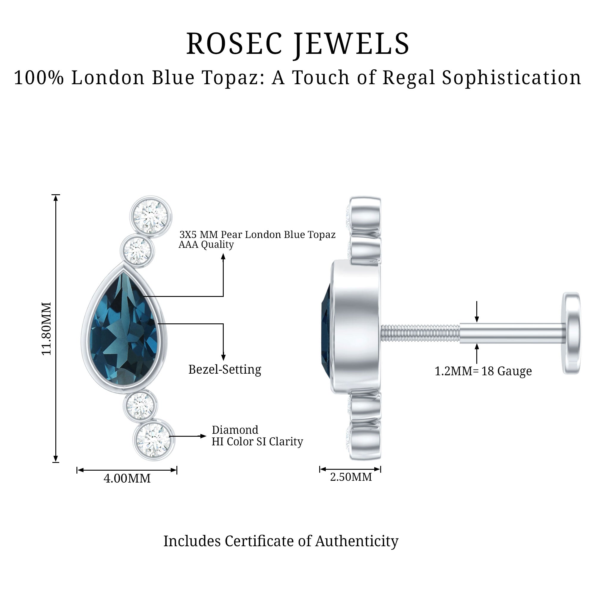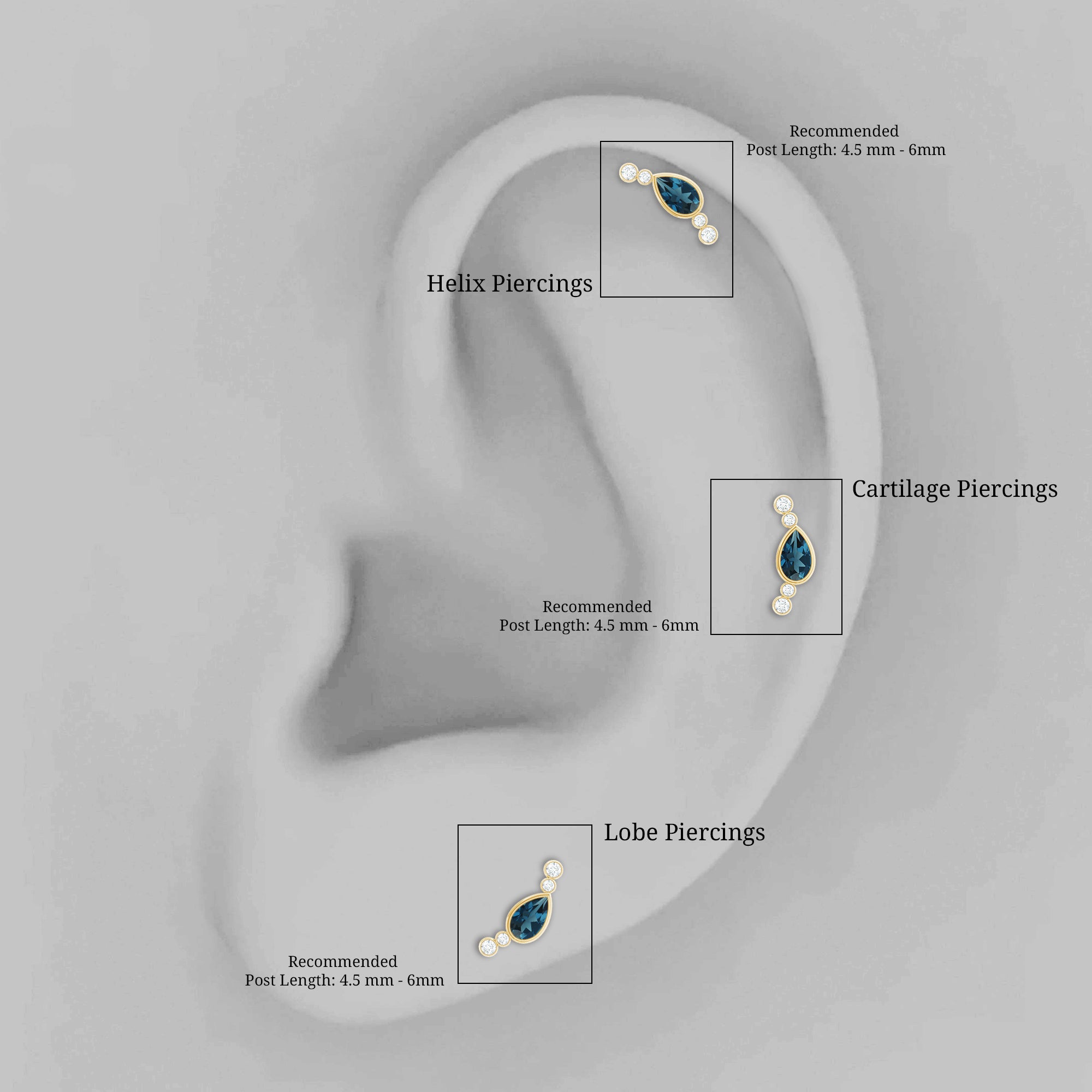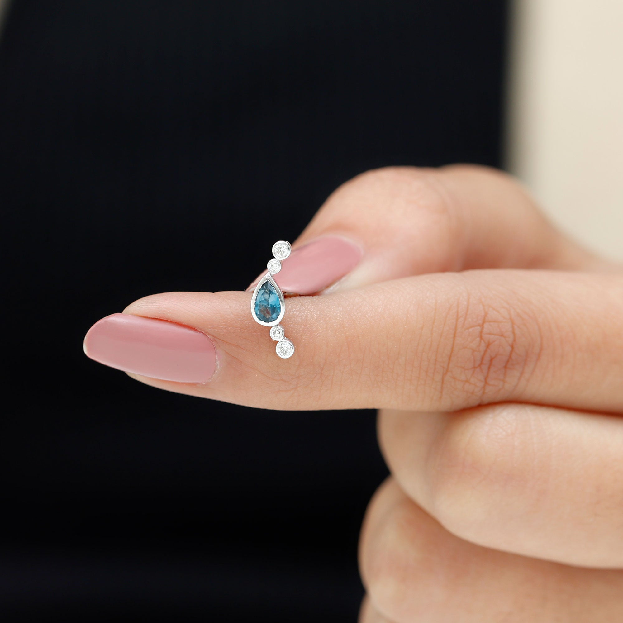 A small touch of color can change your whole look, and this London Blue Topaz Crawler Earring brings that soft spark in the most effortless way. Designed to follow the natural curve of your ear, it creates a gentle line of shine that feels modern and stylish. At the center of the design sits a 3X5 MM pear shaped London Blue Topaz. The stone is placed in a secure bezel setting, giving it a sleek and polished finish while keeping it safe for daily wear. Alongside the topaz are tiny round diamonds that add a bright shimmer. Together, the blue and white stones create a simple yet eye-catching contrast that works for many styles. This Blue Topaz and Diamond Earring is made to fit different piercings, including the helix, cartilage, and upper lobe. Its curved shape rests comfortably on the ear, making it easy to wear for long hours. The design is subtle enough for everyday outfits but elegant enough to pair with dressier looks. Perfect for gifting or treating yourself, this Ear Climber Earring is a simple and graceful piece that brings a hint of color, shine, and personality to any day.