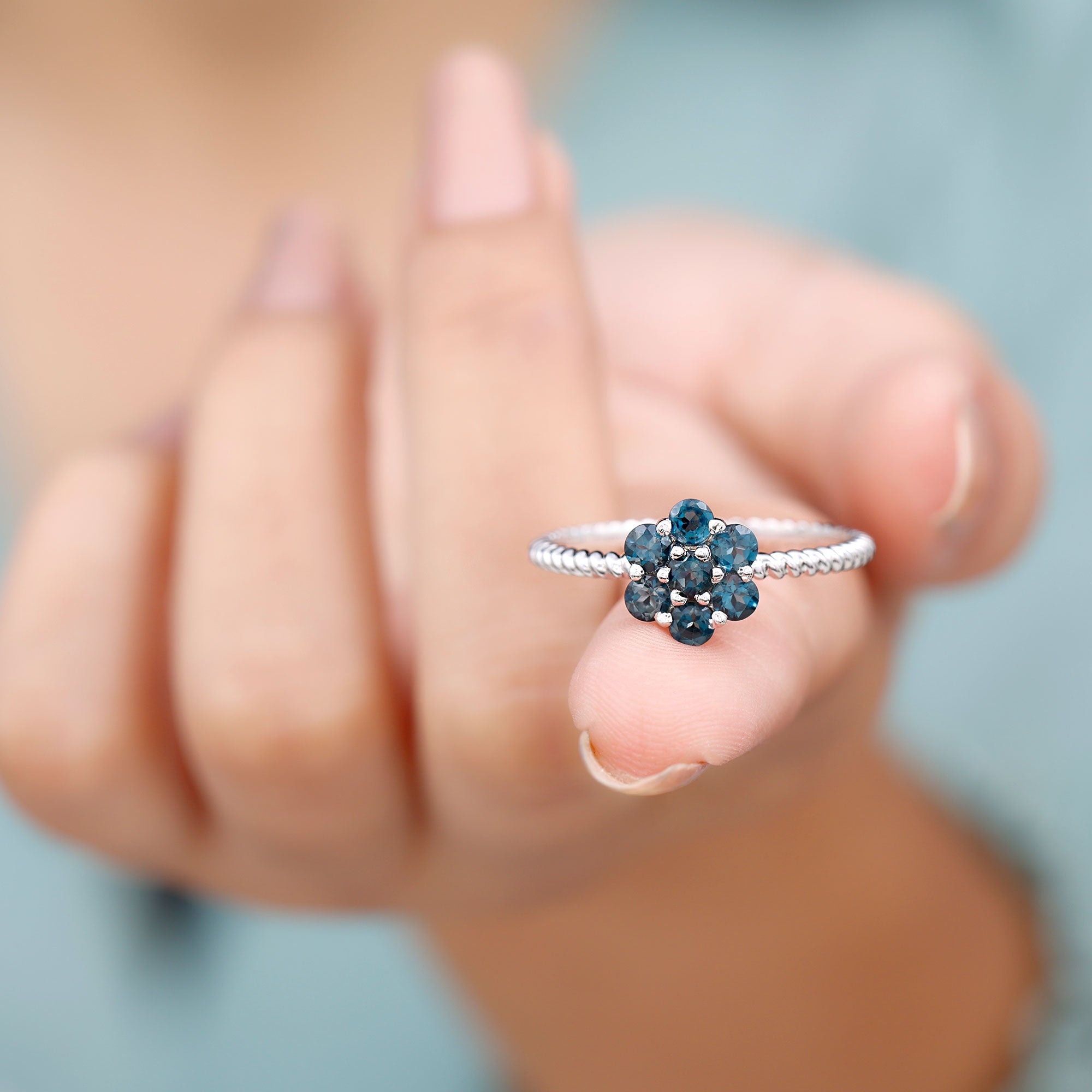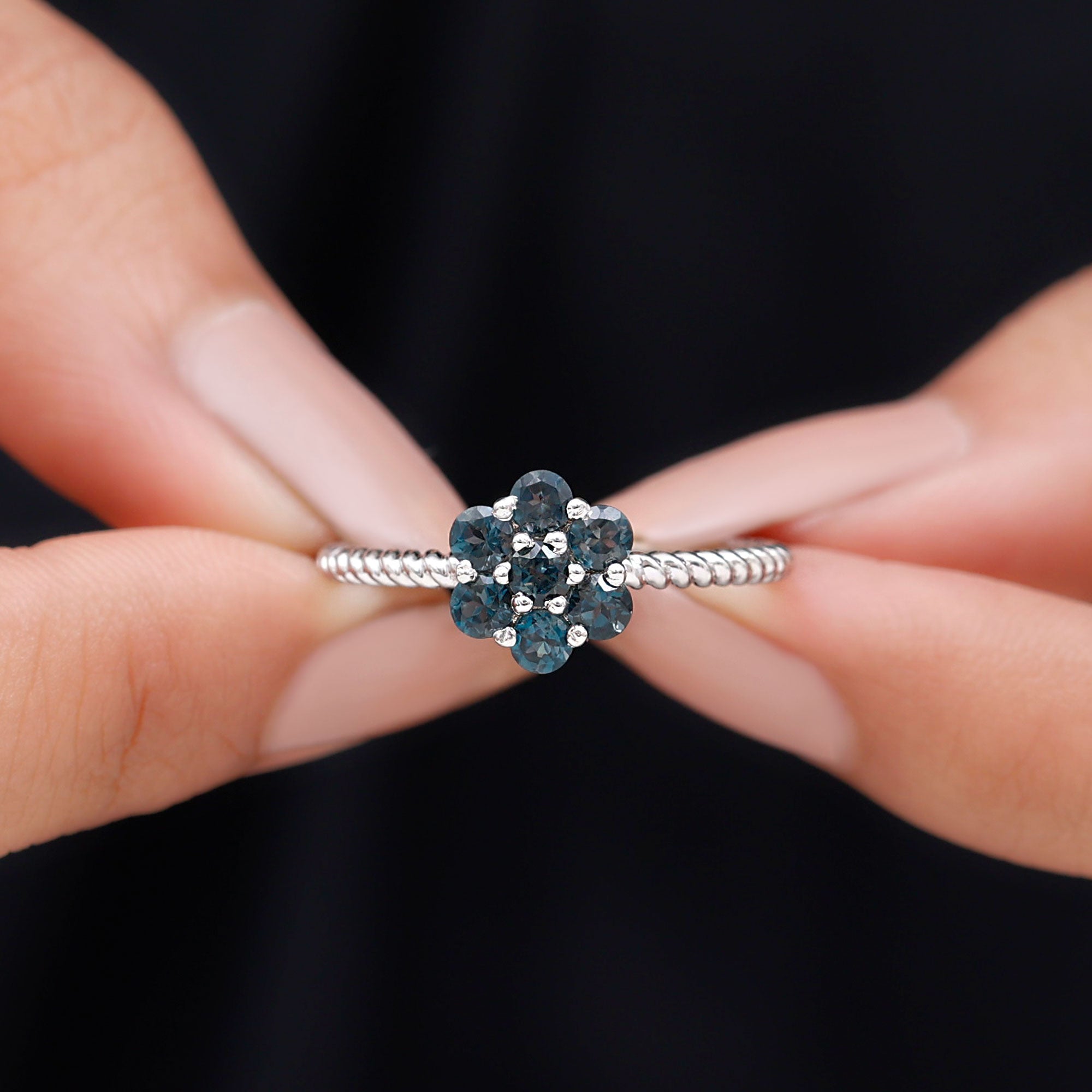 Allow your affection to flourish with this exquisitely designed Flower Engagement Ring, a captivating piece inspired by the beauty of nature and filled with genuine sparkle. At the heart of the design lies a delicate arrangement of round-shaped london blue topaz, organized in a floral motif that represents new beginnings and the blossoming of love. Each stone boasts AAA quality, providing a brilliant sparkle that illuminates the entire Floral Ring. Enhancing its allure is the twisted rope style band, which adds a hint of vintage sophistication and unique texture. This subtle feature imparts a handcrafted essence to the London Blue Topaz Engagement Ring, distinguishing it from conventional designs. The cluster style also offers a larger, more striking appearance while ensuring the ring remains lightweight and comfortable for daily wear. Meticulously crafted for those who appreciate beauty and significance, this Blue Topaz Flower Ring is an exquisite option for proposals, anniversaries, or even as a special gift for oneself. It is available in a variety of metal colors and purity options and is presented in an elegant jewelry box, ready for gifting or personal enjoyment. Romantic, elegant, and refreshingly unique, this Womens Engagement Ring is designed for the individual who believes in love that deepens over time, much like a flourishing garden.