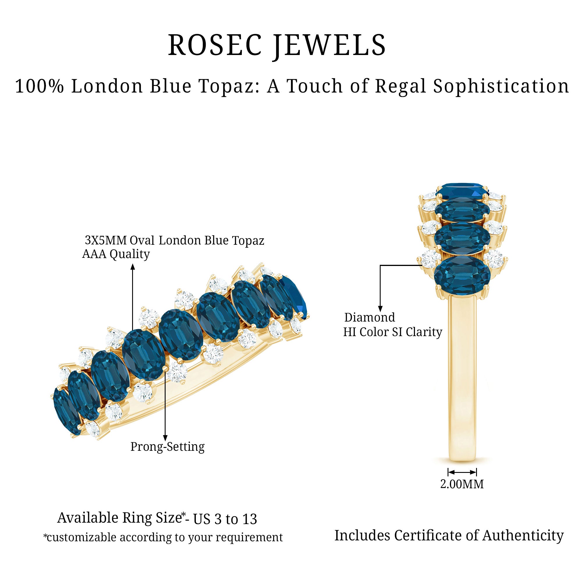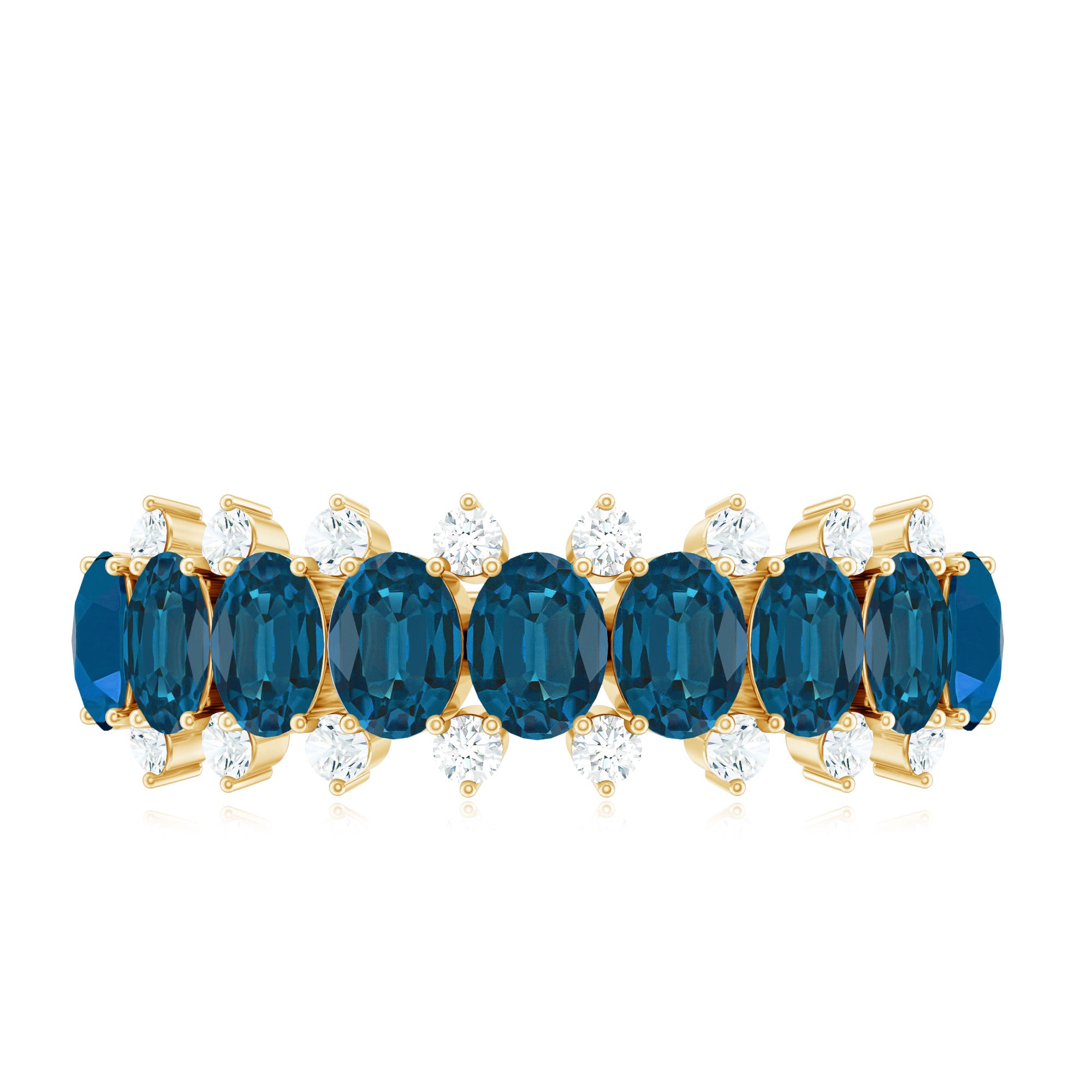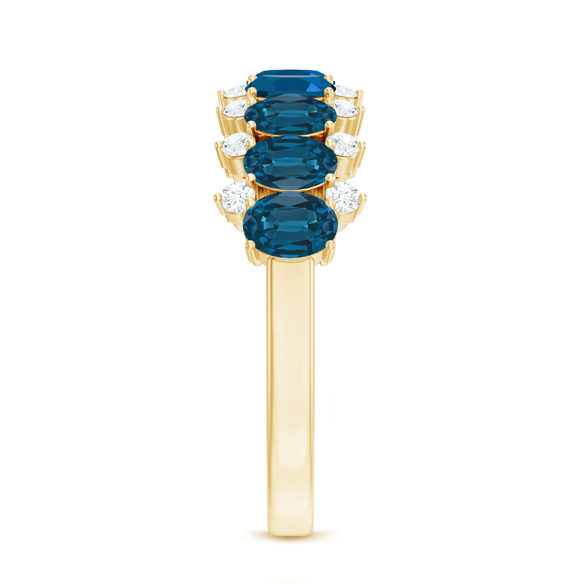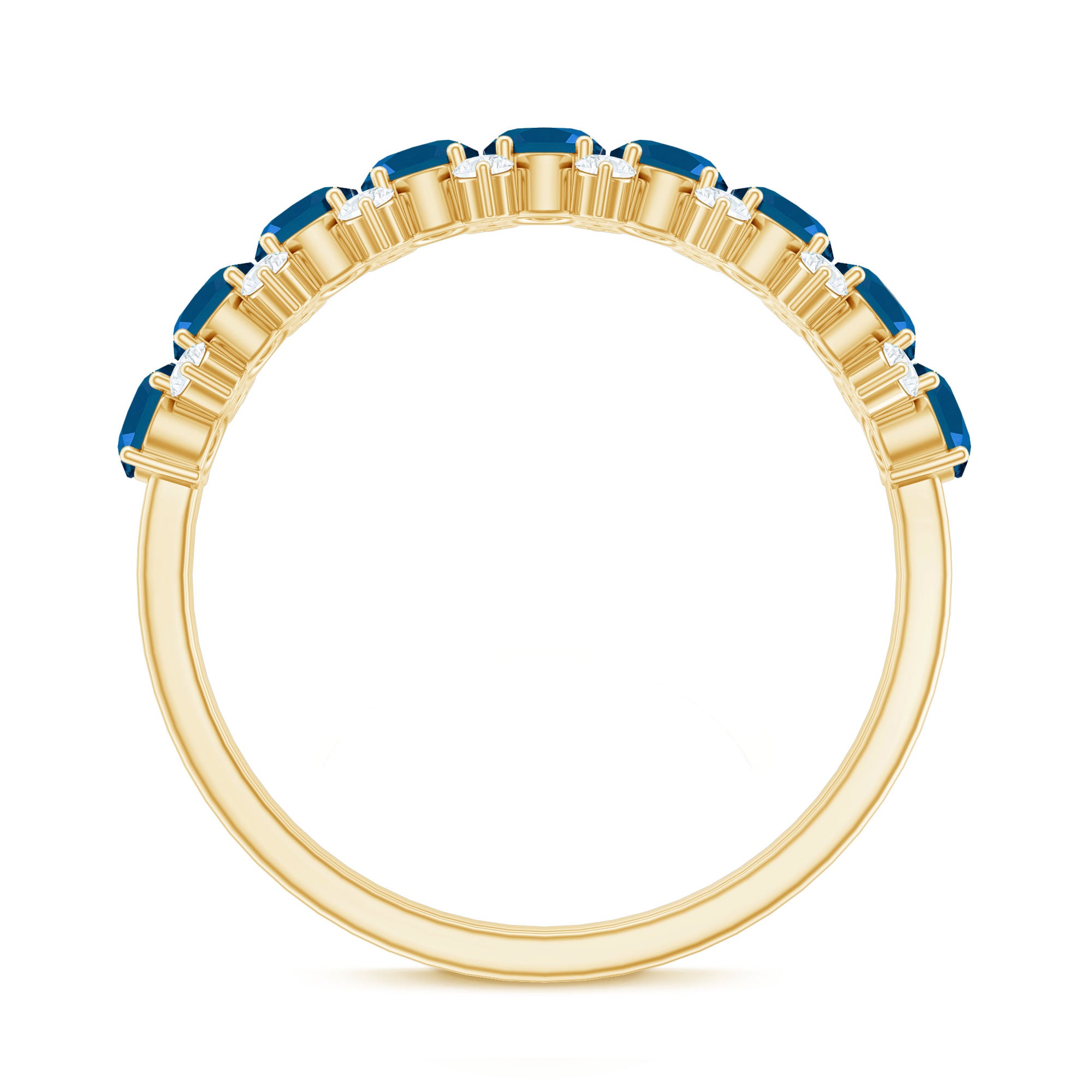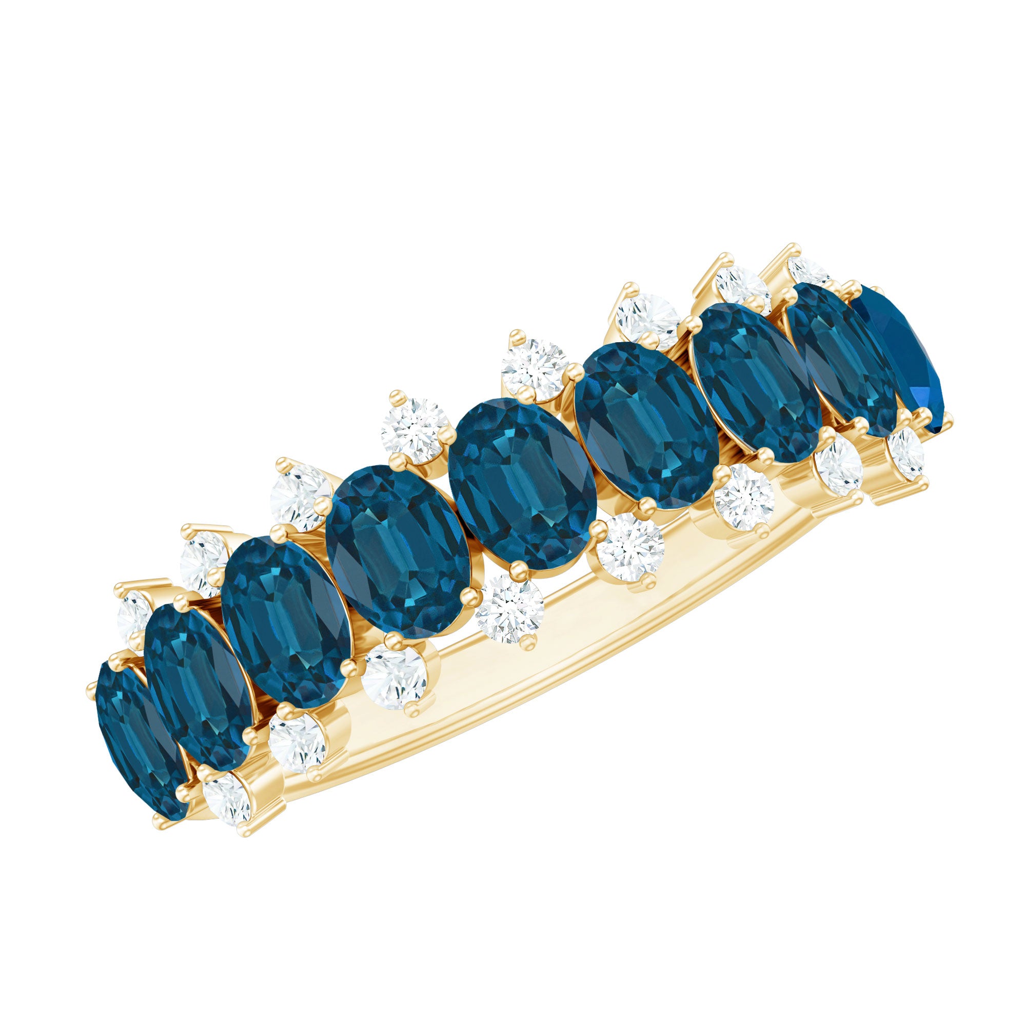 This London Blue Topaz Eternity Band combines significance and elegance in a refined design. Adorning the band, you will discover a subtle arrangement of 3X5 MM oval-shaped London blue topaz stones (AAA quality), meticulously set alongside tiny round cut diamonds (HI-SI quality). Each stone is securely held in a prong setting, creating a flowing line that gently encircles the finger. The juxtaposition of the rich london blue topaz and the shimmering diamonds produces a breathtaking visual, rendering the Half Eternity Ring striking yet not overly ostentatious. It is a piece suitable for daily wear or reserved for special events, stylish on its own or layered with other rings for a stacked appearance. This Blue Topaz Wedding Band is a considerate choice for individuals who appreciate personal expression through jewelry. Whether commemorating an anniversary, presenting a meaningful gift, or indulging yourself, this Semi Eternity Band is crafted to be cherished and worn. Its half eternity style provides an ideal blend of comfort and allure, with sufficient sparkle to reflect the light. Offered in a range of sizes and metal choices, it is simple to find the perfect fit for your aesthetic. From tranquil mornings to significant occasions, this Natural Blue Topaz and Diamond Ring imparts a graceful element that endures through every phase of life.