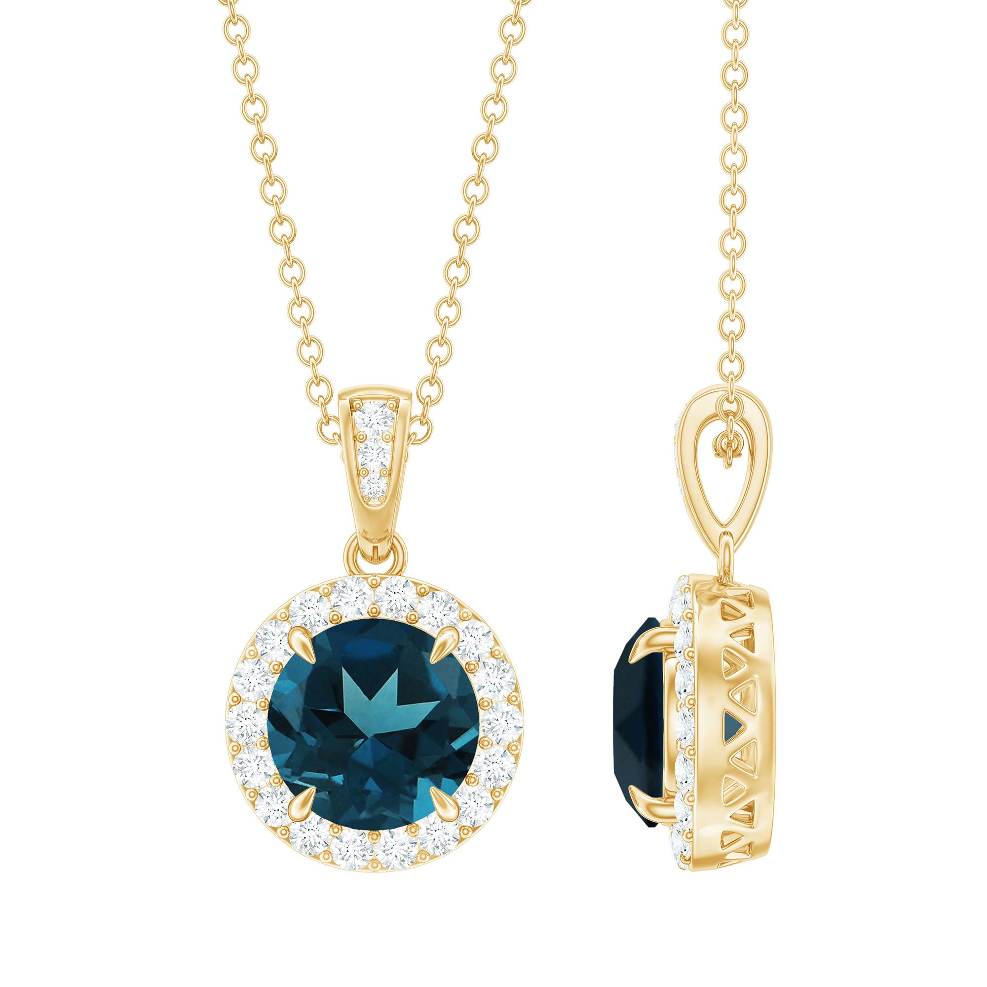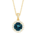 Enhance your style with the grace of this elegant Halo Pendant Necklace, featuring a mesmerizing Round Shape London Blue Topaz held securely in a Claw Setting. The London Blue Topaz is beautifully surrounded by a dazzling Halo of Round Shape Diamond, exuding a radiant and captivating aura.