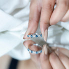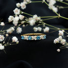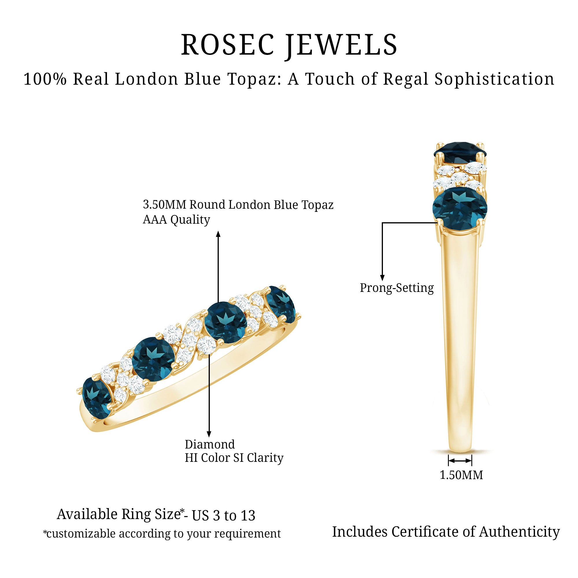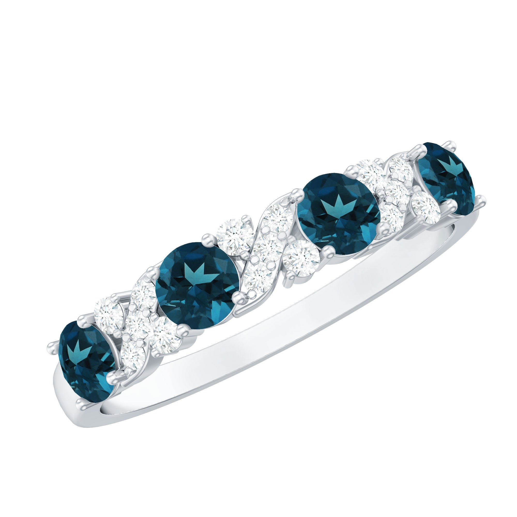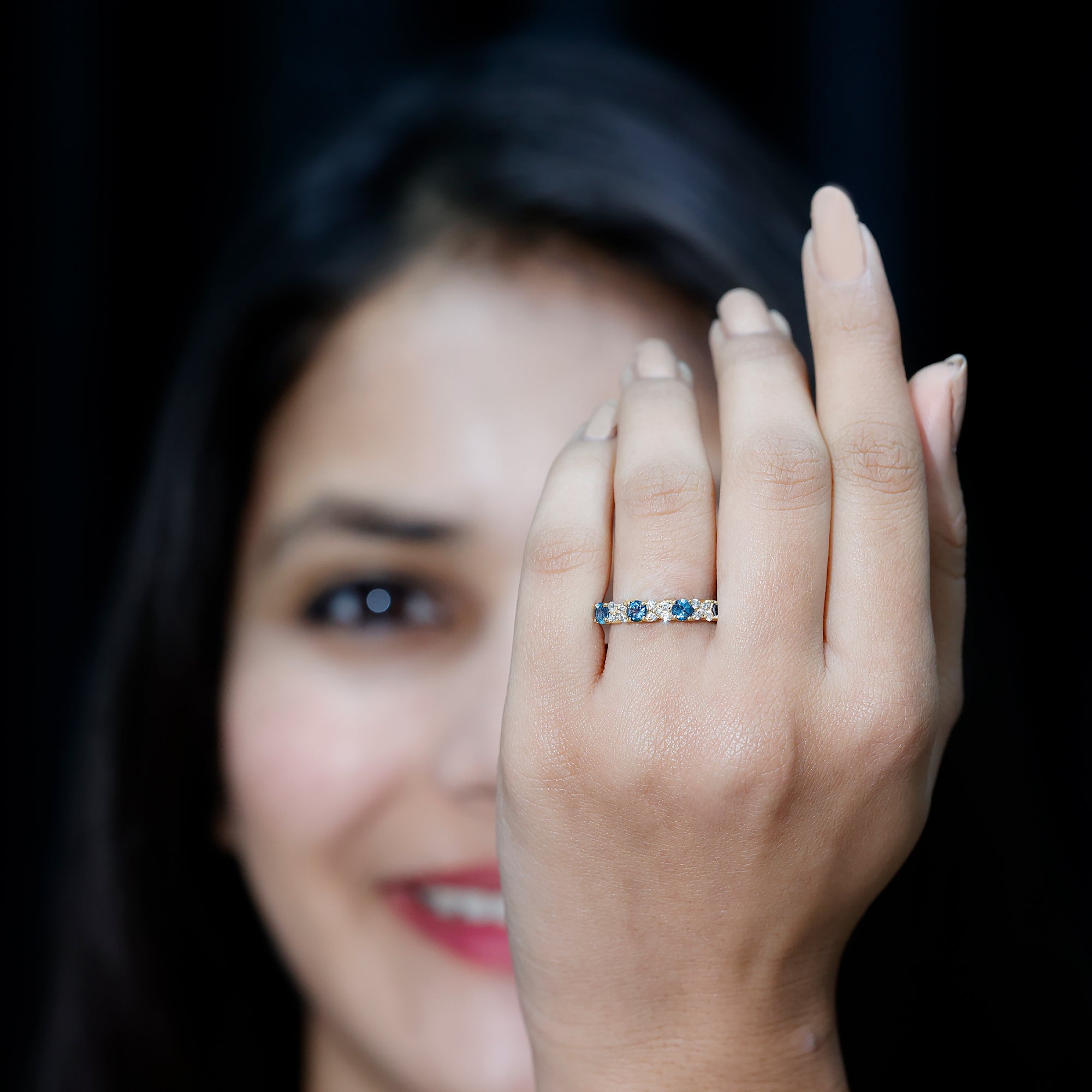 Experience the mesmerizing allure of the Blue Topaz Eternity Ring, a remarkable emblem of eternal love. This exquisite piece intricately combines vibrant London Blue Topaz gemstones with sparkling Diamonds, resulting in a stunning presentation that harmonizes contemporary sophistication with classic appeal. Featuring Round Shaped London Blue Topaz set in Prong Setting, complemented by Diamonds on the band, it emanates brilliance from every perspective. Meticulously crafted with attention to detail, this Half Eternity Band celebrates your distinctive journey together. Ideal for vow exchanges or marking significant life events, this London Blue Topaz Ring boasts enchanting hues and a luxurious design, destined to become a treasured heirloom, with each glimmer narrating a love story rich in promise and passion. Whether combined with other rings or worn alone, this Eternity Stackable Ring enhances your appearance with a fashionable flair. It serves as a convenient option for daily use while also being sophisticated enough for special occasions. Crafted from AAA quality london blue topaz and HI-SI quality diamonds with meticulous craftsmanship, this piece provides both durability and aesthetic appeal. The contrasting stones paired with the sleek band create a ring that you will consistently choose. For individuals who appreciate a monochrome aesthetic infused with a hint of creativity, this blue topaz and diamond ring is an ideal choice.