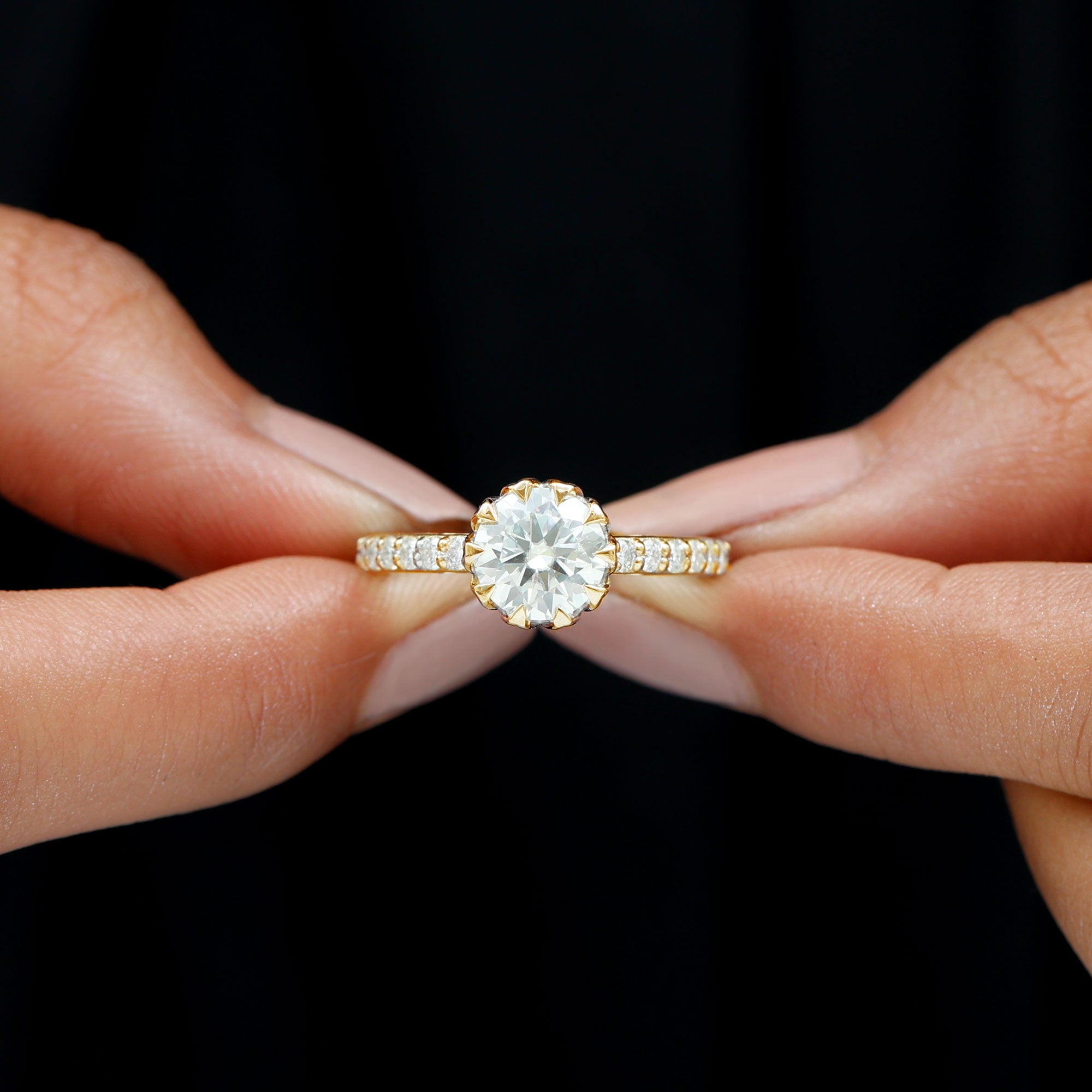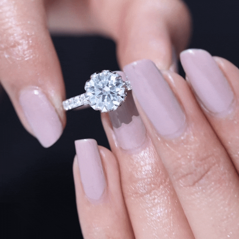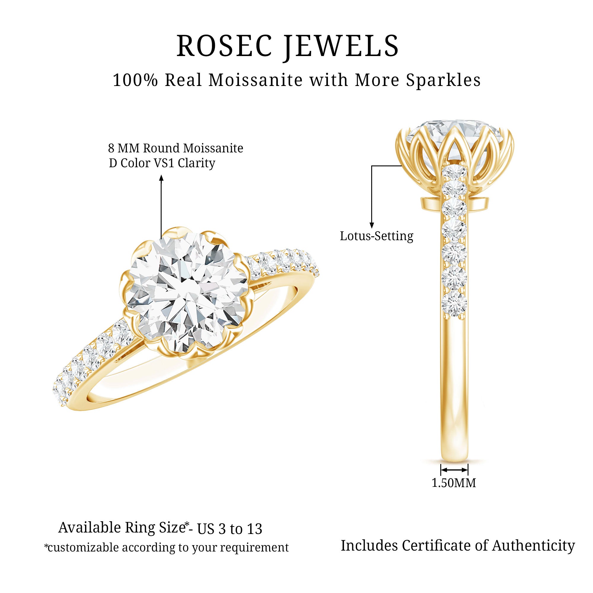 Drawing inspiration from nature’s purest symbol, this Moissanite Solitaire Engagement Ring is a romantic fusion of elegance and meaning. The centerpiece is a dazzling 8 MM round brilliant cut moissanite, expertly cut to capture maximum brilliance and fire. Held securely in lotus basket setting, the center stone is cradled like a blooming flower, symbolizing purity, new beginnings, and eternal love. The lotus-inspired design adds a graceful, floral charm to the overall look, creating a setting that is both artistic and symbolic. Enhancing the solitaire is the band, which is beautifully accented with sparkling side stones that upgrade the ring’s radiance without overpowering the main gem. This Flower Engagement Ring strikes the perfect balance between classic and contemporary, with its timeless round cut and unique lotus basket detail. The Moissanite Engagement Ring is designed to be worn comfortably every day, with a setting that offers both durability and elegance. Carefully crafted and truly eye-catching, this 2 Carat Moissanite Ring is a heartfelt way to say forever. Ideal for the modern romantic, it is a meaningful piece that promises to shine for a lifetime.