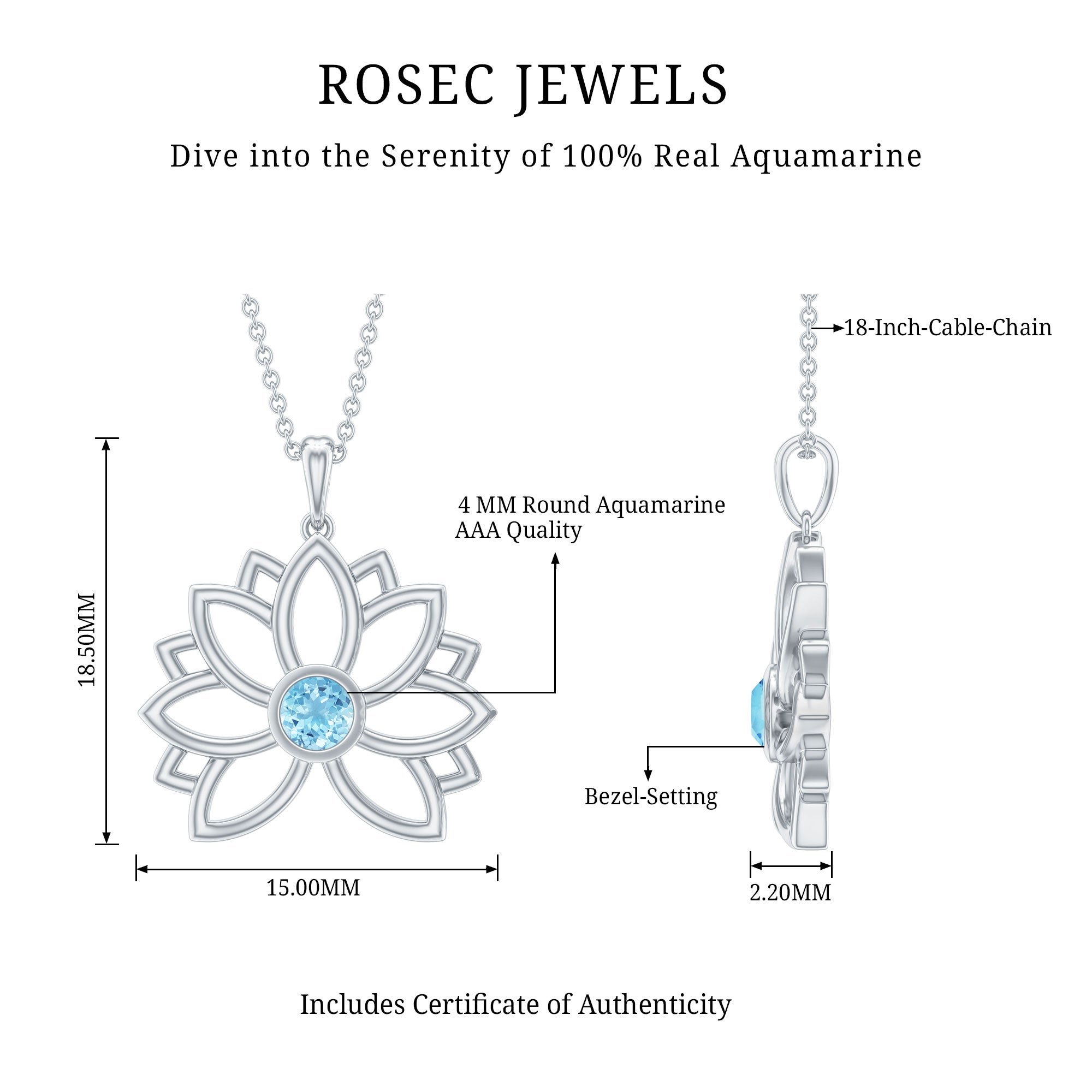 Aquamarine Lotus Pendant has lovely delicate design make a perfect accessory for vintage lover. Stunning Round Solitaire Aquamarine stone is encased in bezel setting enhance the beauty of Floral Charm Necklace. Stack it or wear alone for statement look.