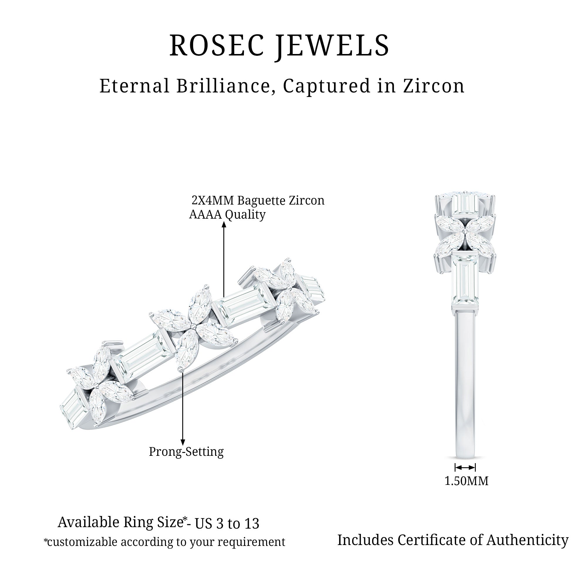 This stunning half eternity ring features Marquise Cut Zircon Stones arranged in a delicate flower design with Baguette Shape Zircon Stones. The half eternity style allows for comfortable wear while showcasing the beauty of the stones. This Cubic Zirconia Ring is a perfect gift for a loved one or a beautiful addition to your jewelry collection.