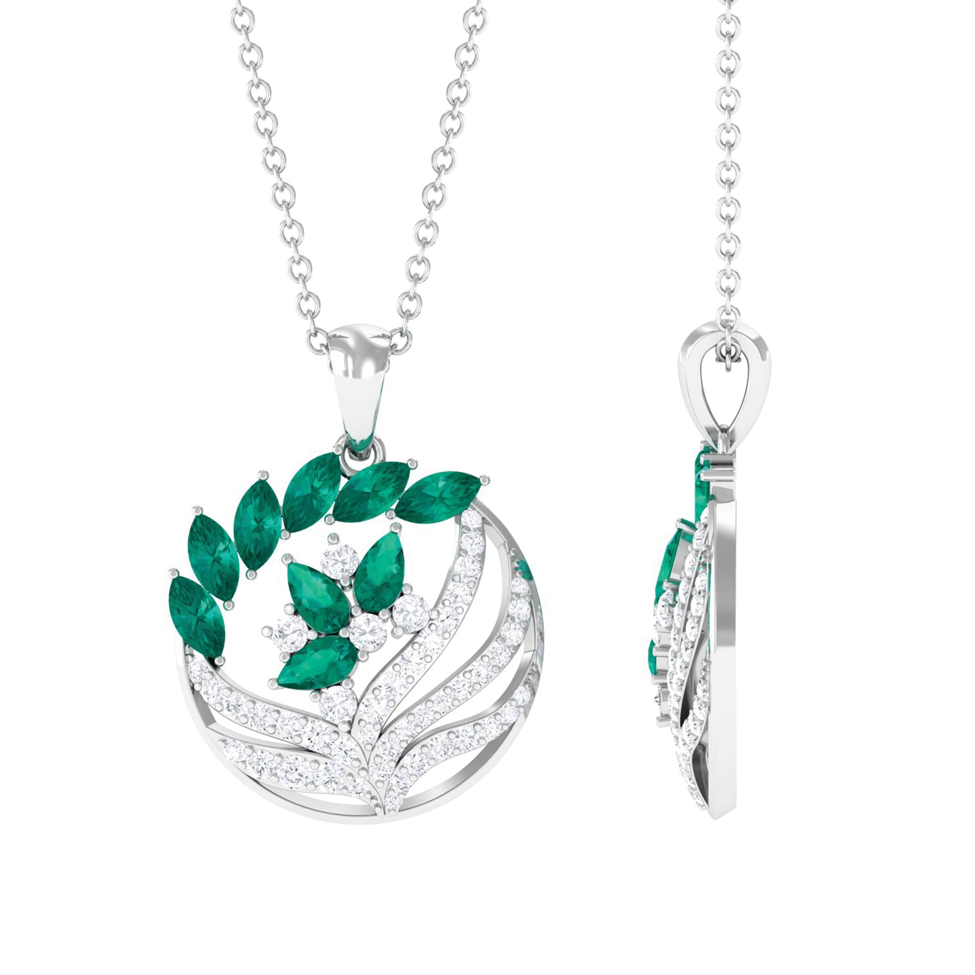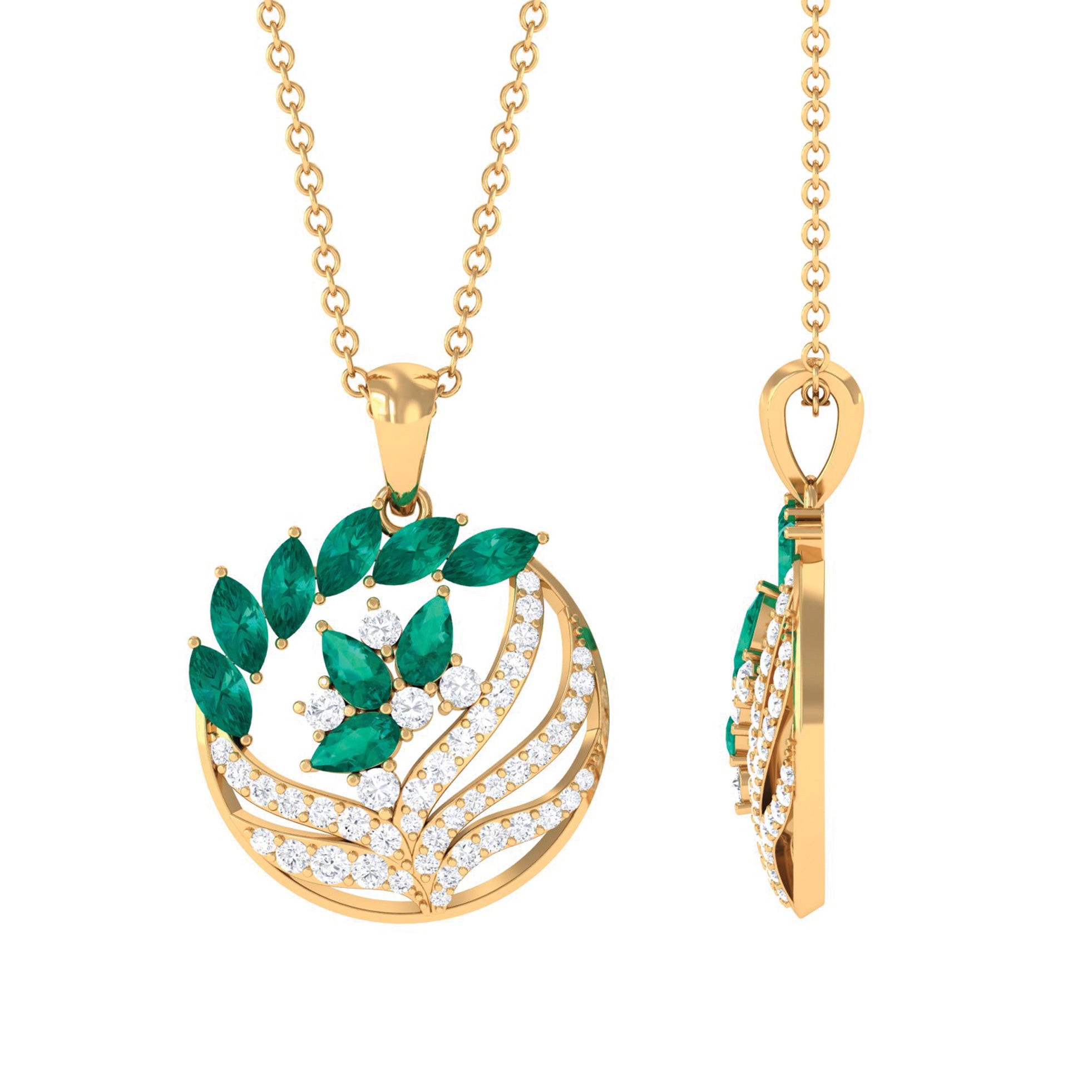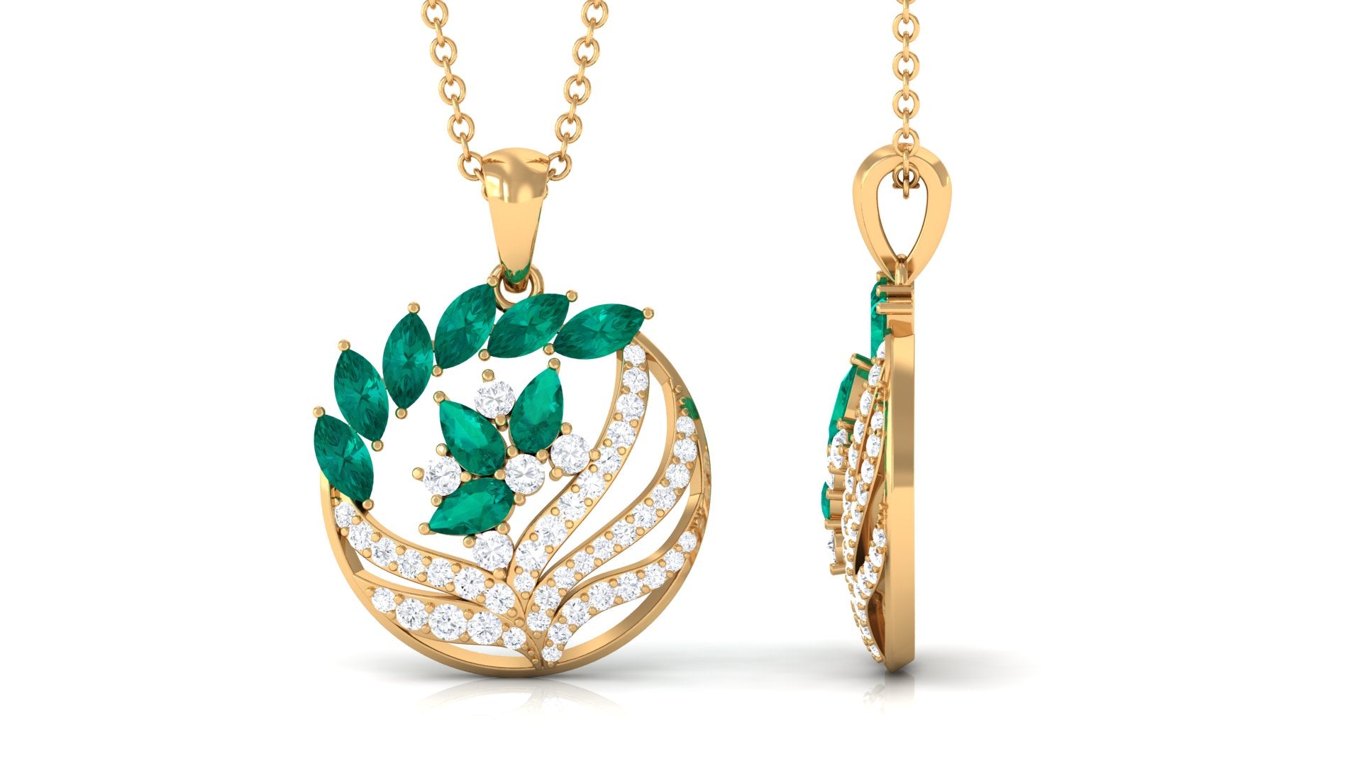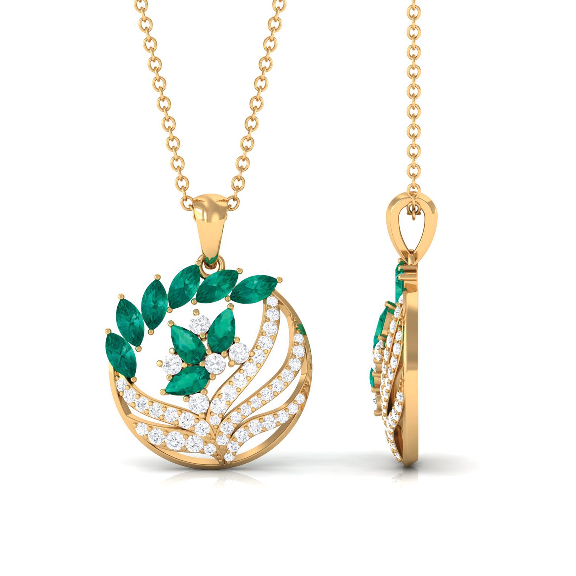 This exquisite Emerald Designer Pendant Necklace is a must-have addition to your jewelry collection. Featuring captivating marquise and pear-cut emerald stones and dazzling round-cut Diamond stones intricately arranged on a designer motif, this emerald pendant is sure to mesmerize your heart and leave you spellbound. Dont miss out on this enchanting piece.